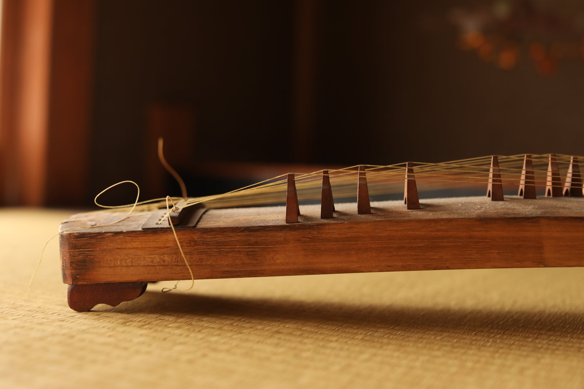 The basic 琴 KOTO features a long, narrow resonating body approximately 182 cm (71 inches) in length, strung with 13 strings. Pegs are set at each string to determine its pitch, and sound is produced by plucking the strings with fingerpicks (koto-zume) worn on the three fingers of the right hand. This is a smaller version, but it is faithfully crafted according to the basic design.