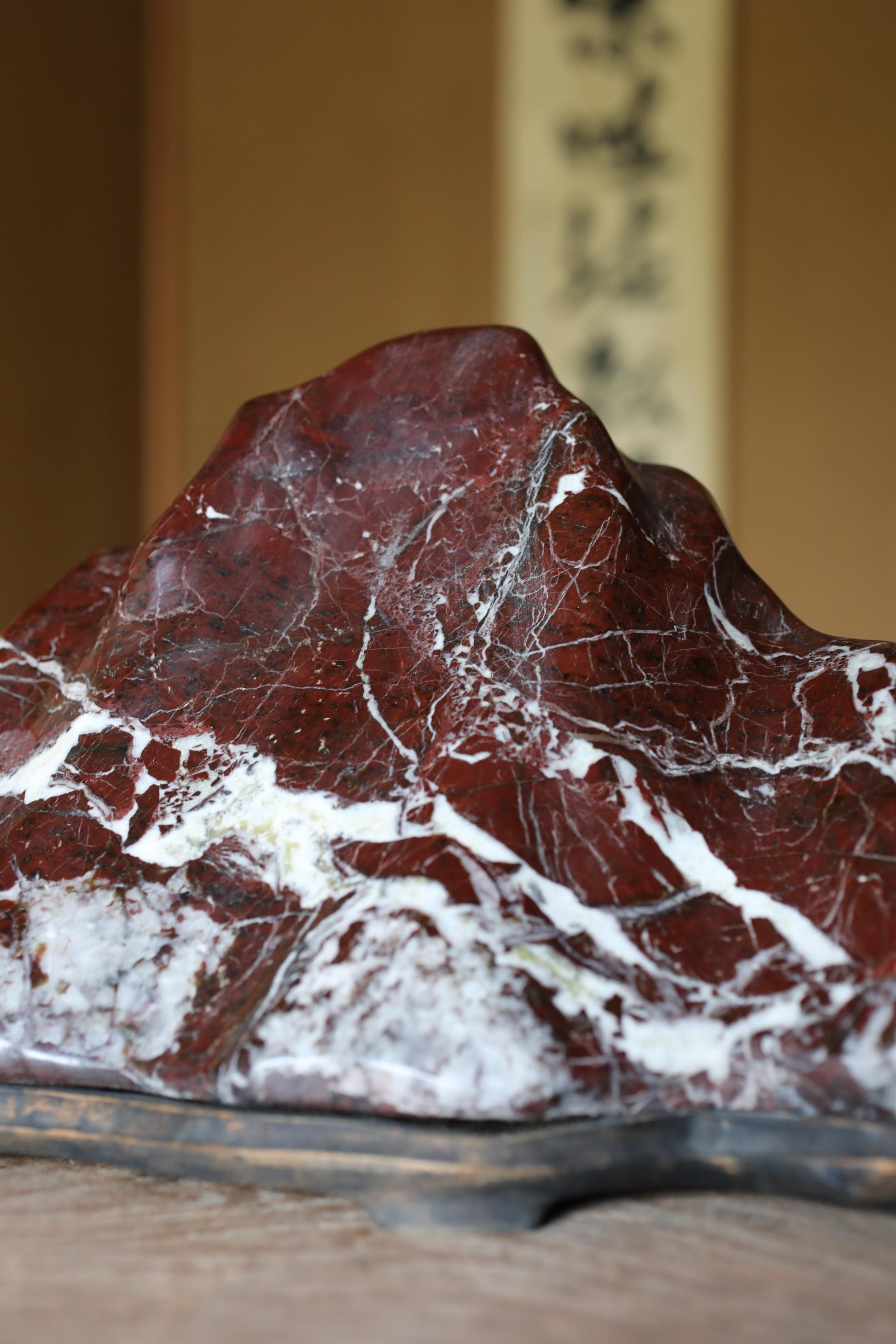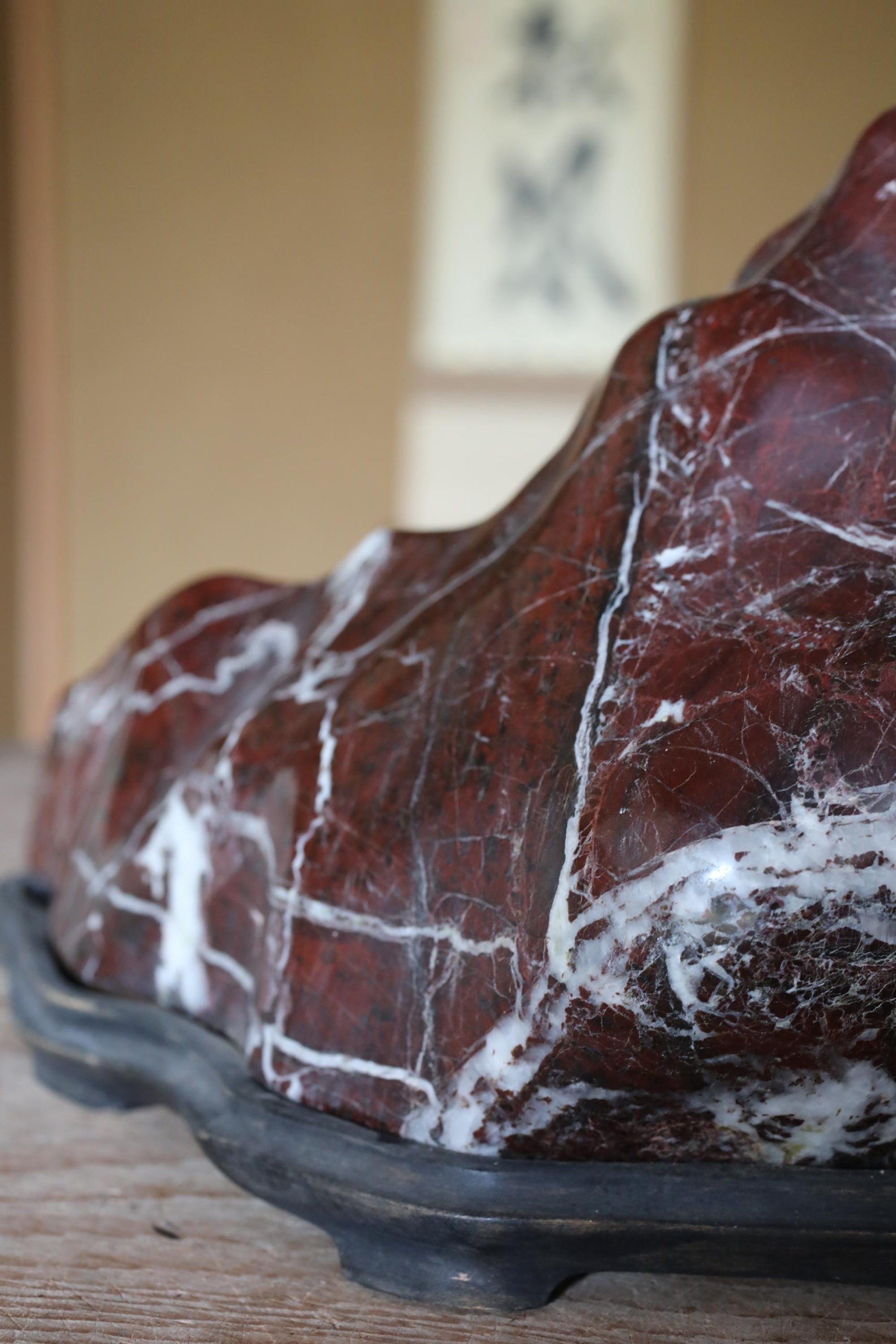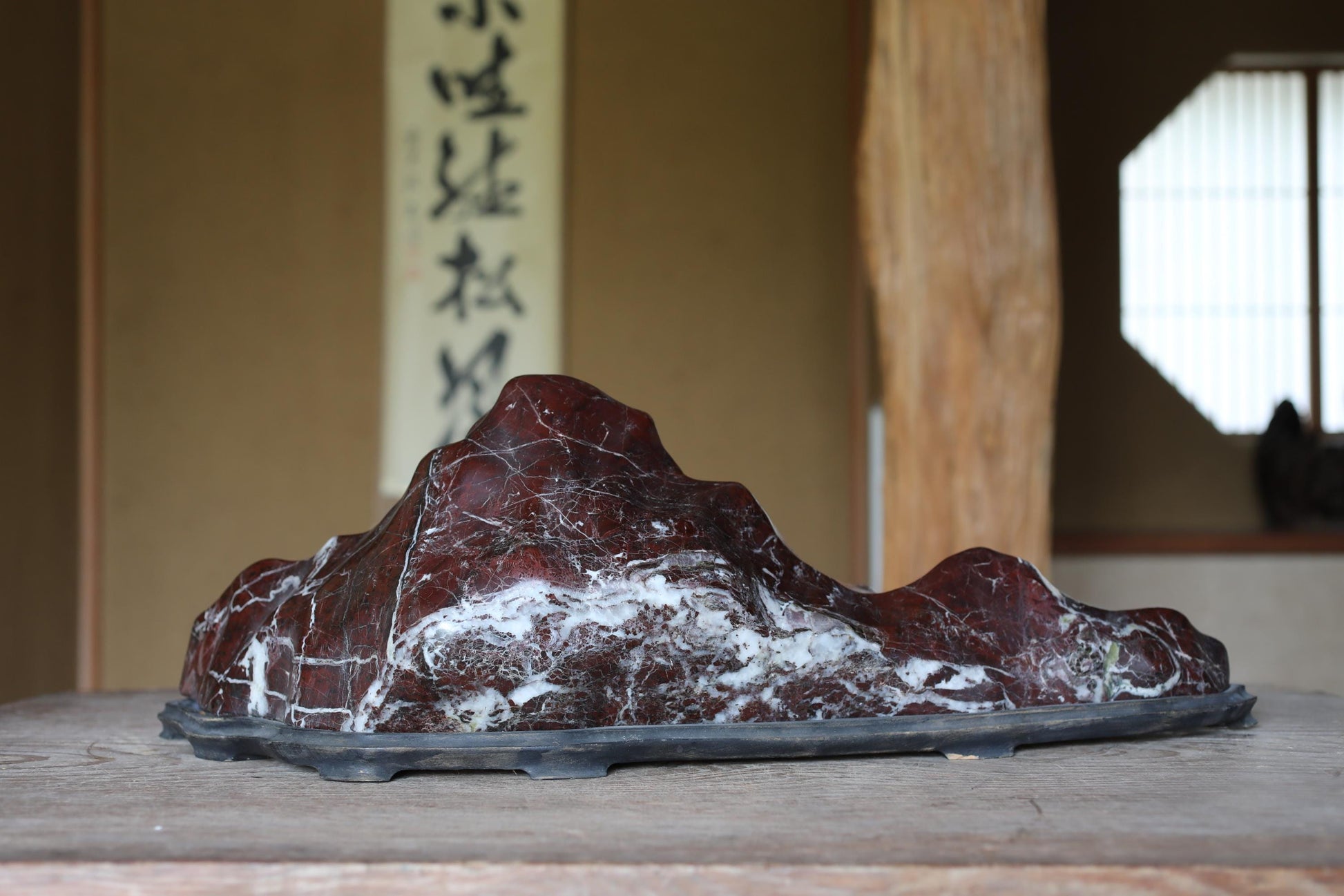 This "suiseki" has a typical mountain shape with peaks and a broad base. Yet its most striking feature is its color of a red stone called as "Sado no Akaishi, exceptionally beautiful red stones found on Sado Island in Niigata Prefecture. The most striking feature of Sado Akaishi is its deep, vibrant red color. This hue is primarily due to iron and quartz combining under high temperature and pressure. In contrast, the stone's joints, regardless of their size, are vividly white, and combined with the stone's shape, they resemble glaciers or lingering snow.