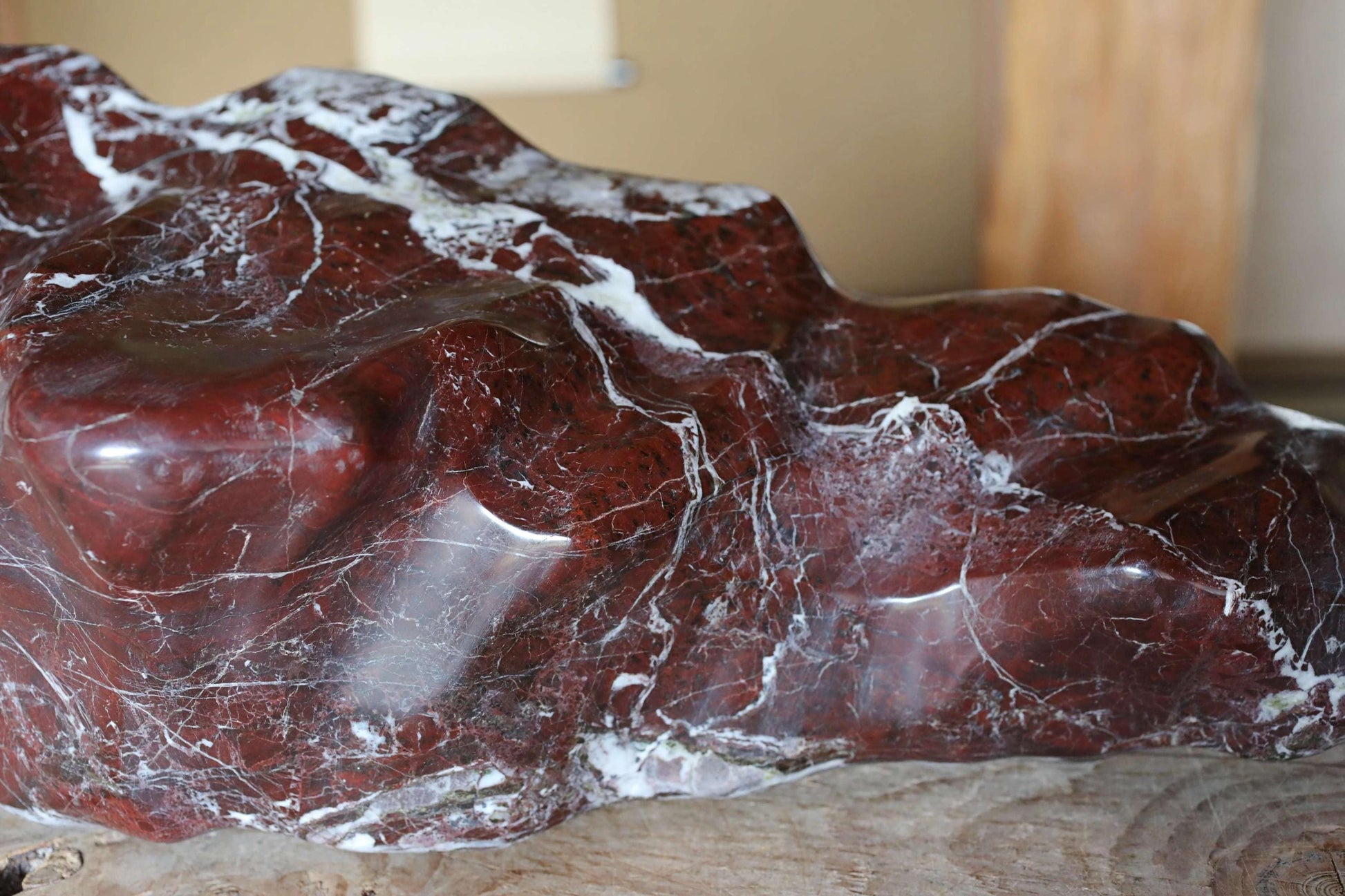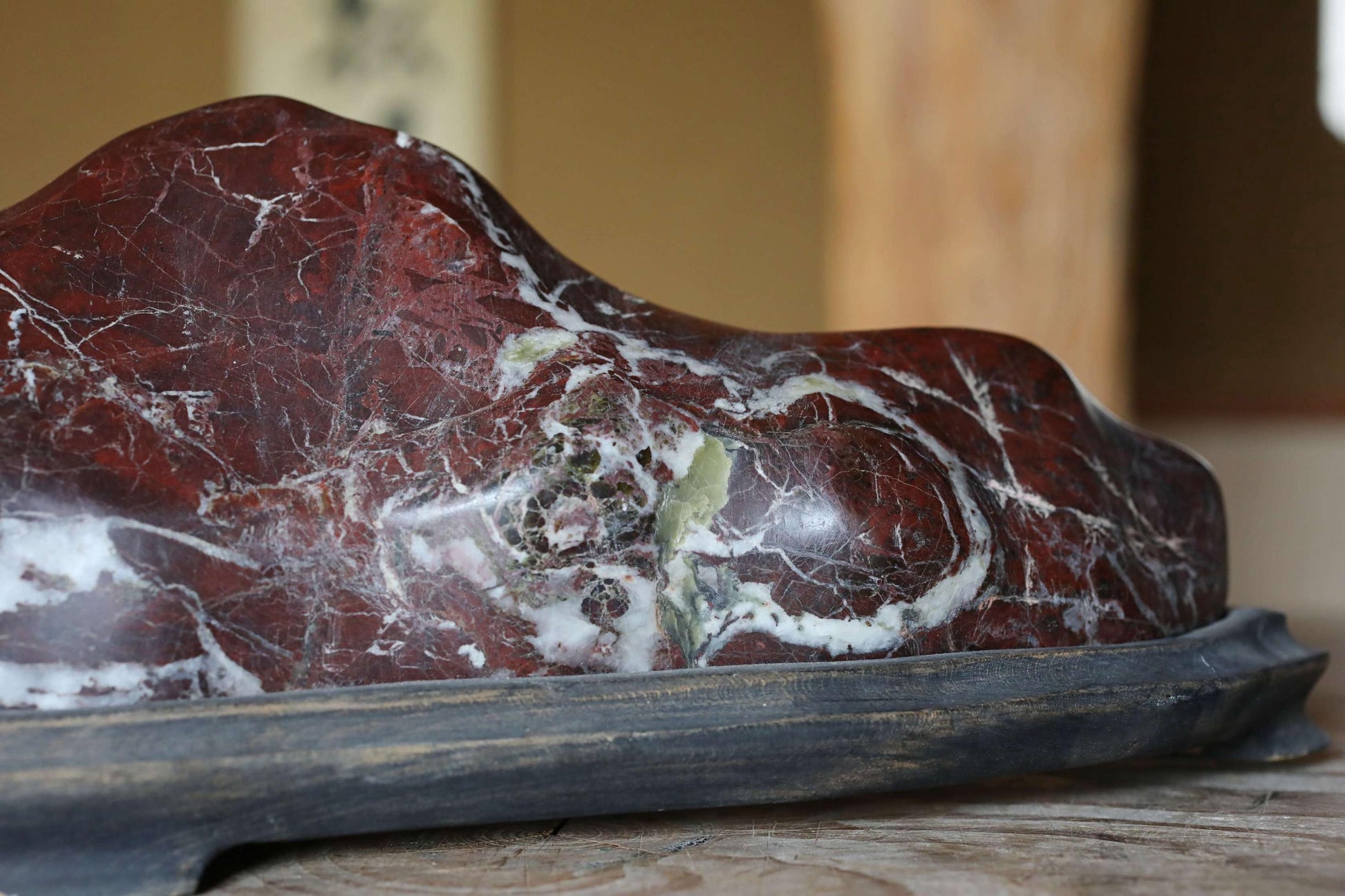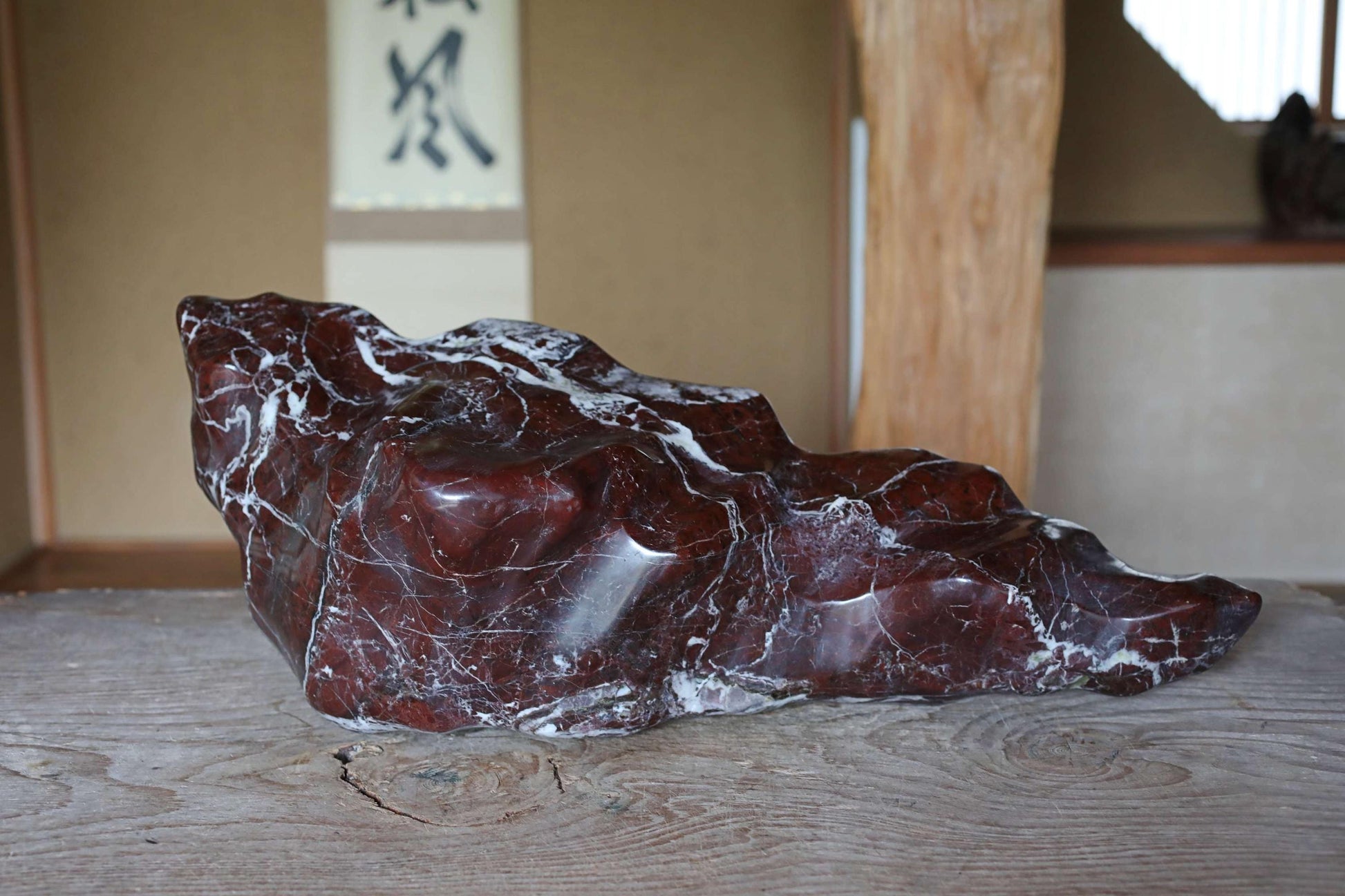 This "suiseki" has a typical mountain shape with peaks and a broad base. Yet its most striking feature is its color of a red stone called as "Sado no Akaishi, exceptionally beautiful red stones found on Sado Island in Niigata Prefecture. The most striking feature of Sado Akaishi is its deep, vibrant red color. This hue is primarily due to iron and quartz combining under high temperature and pressure. In contrast, the stone's joints, regardless of their size, are vividly white, and combined with the stone's shape, they resemble glaciers or lingering snow.