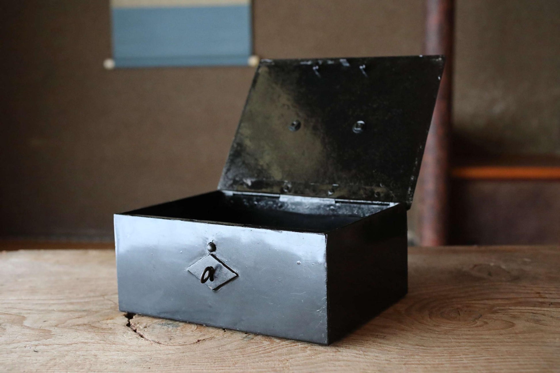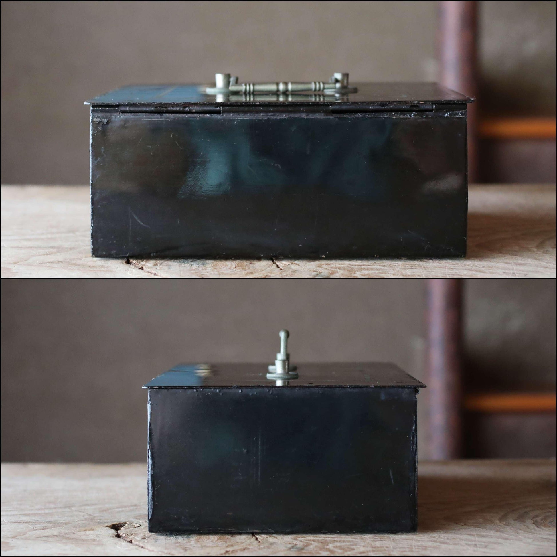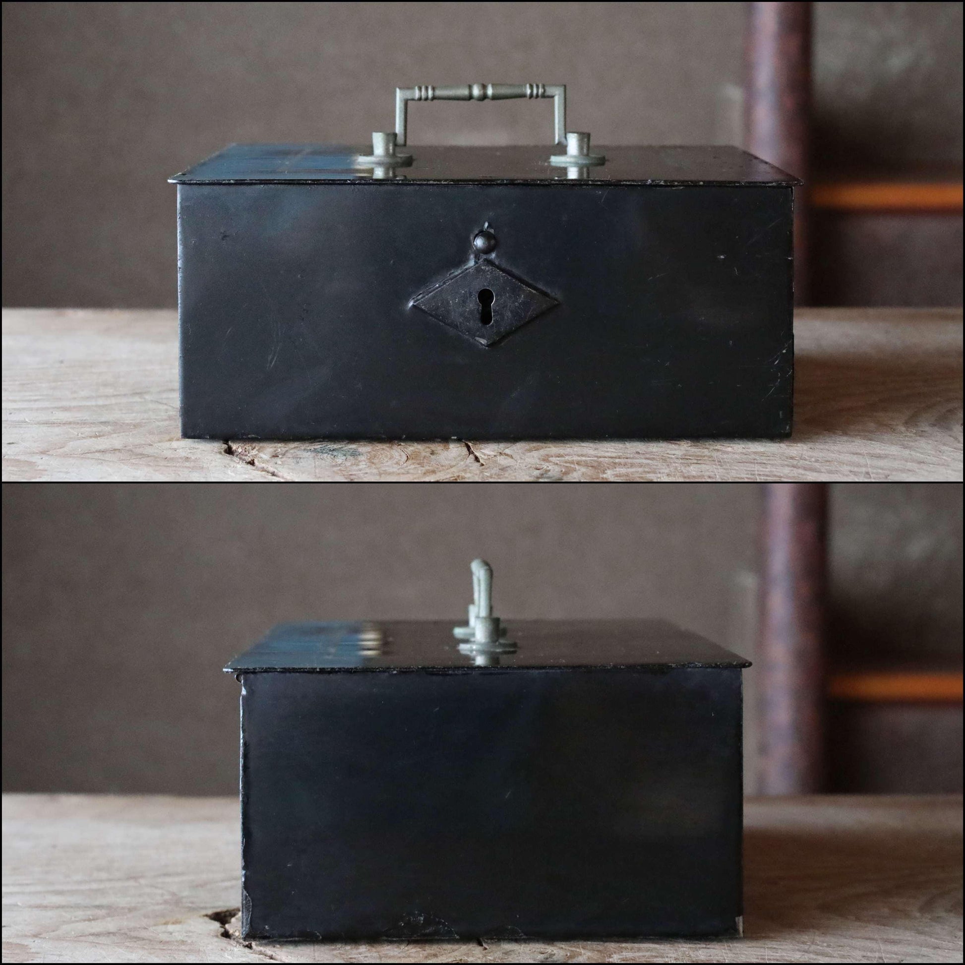 This sturdily built, heavy metal box was originally used as a safe.