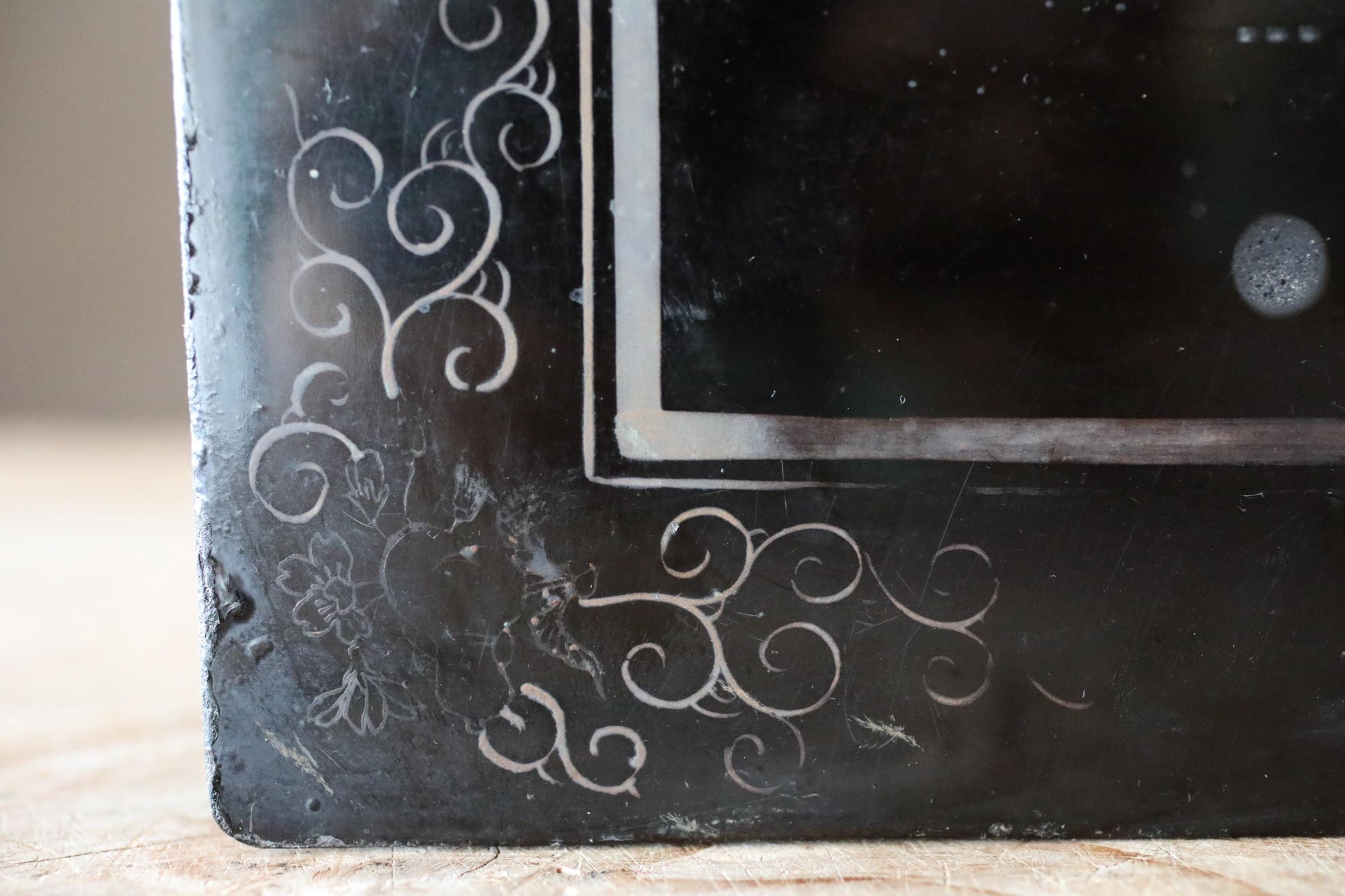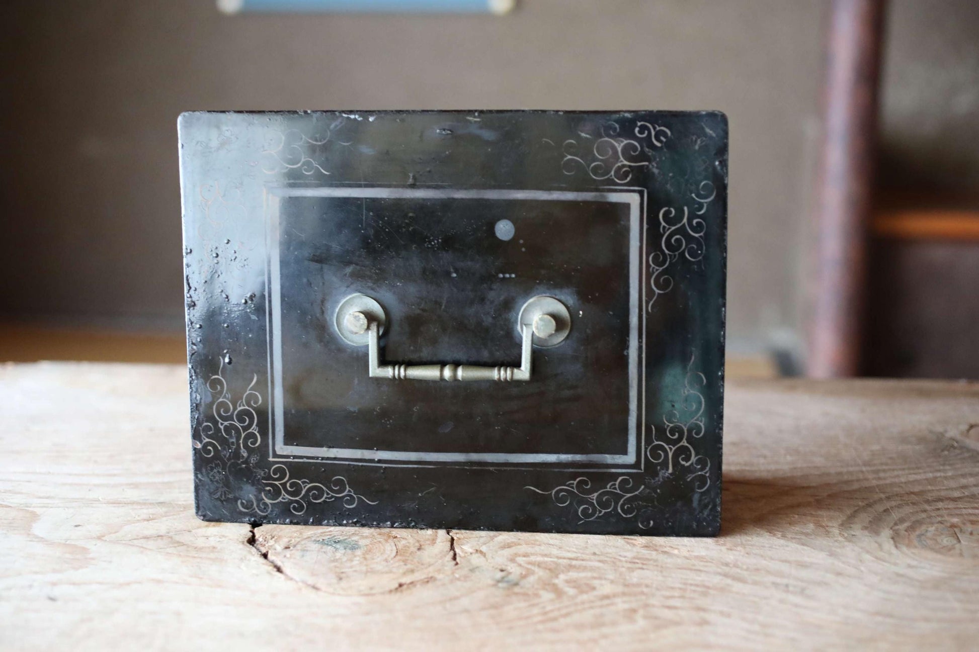 Ching ! Japanese vintage old metal Black cash box, iron cabinet, money box with arabesque painting, with a key 1900s H4.7×W10.6in/12x27cm