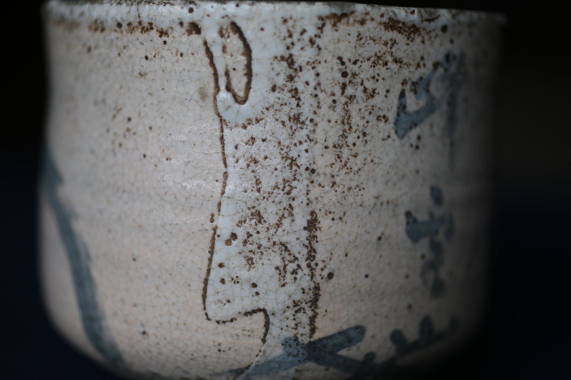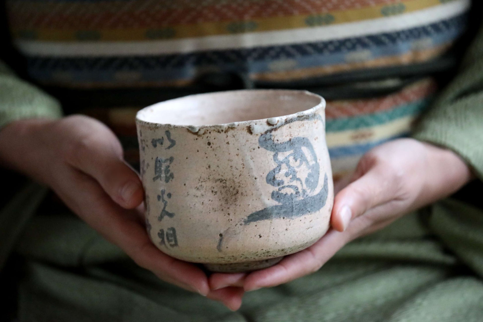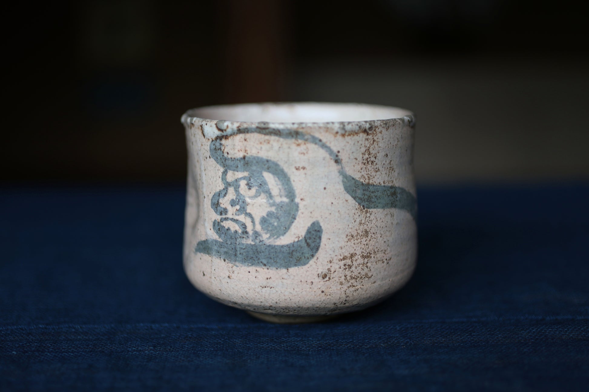 This piece is called a 志野 Shino tea bowl and is said to be one of the most quintessentially Japanese ceramics. What makes this tea bowl unique is its bold painting, which depicts the profile of a Zen master known as Bodhidharma, along with some of his famous Zen dialogue.