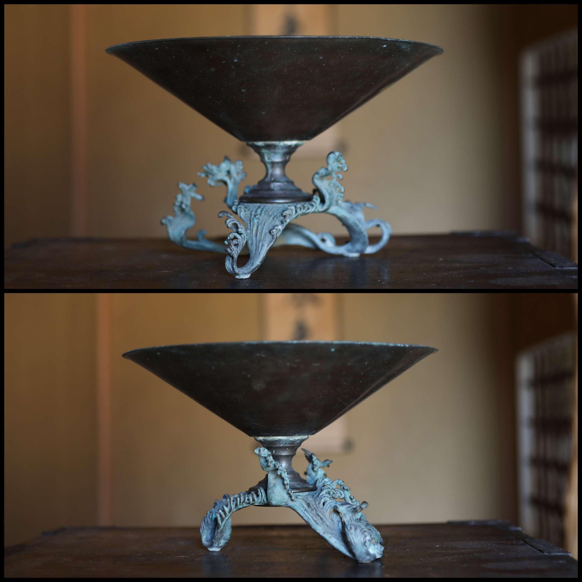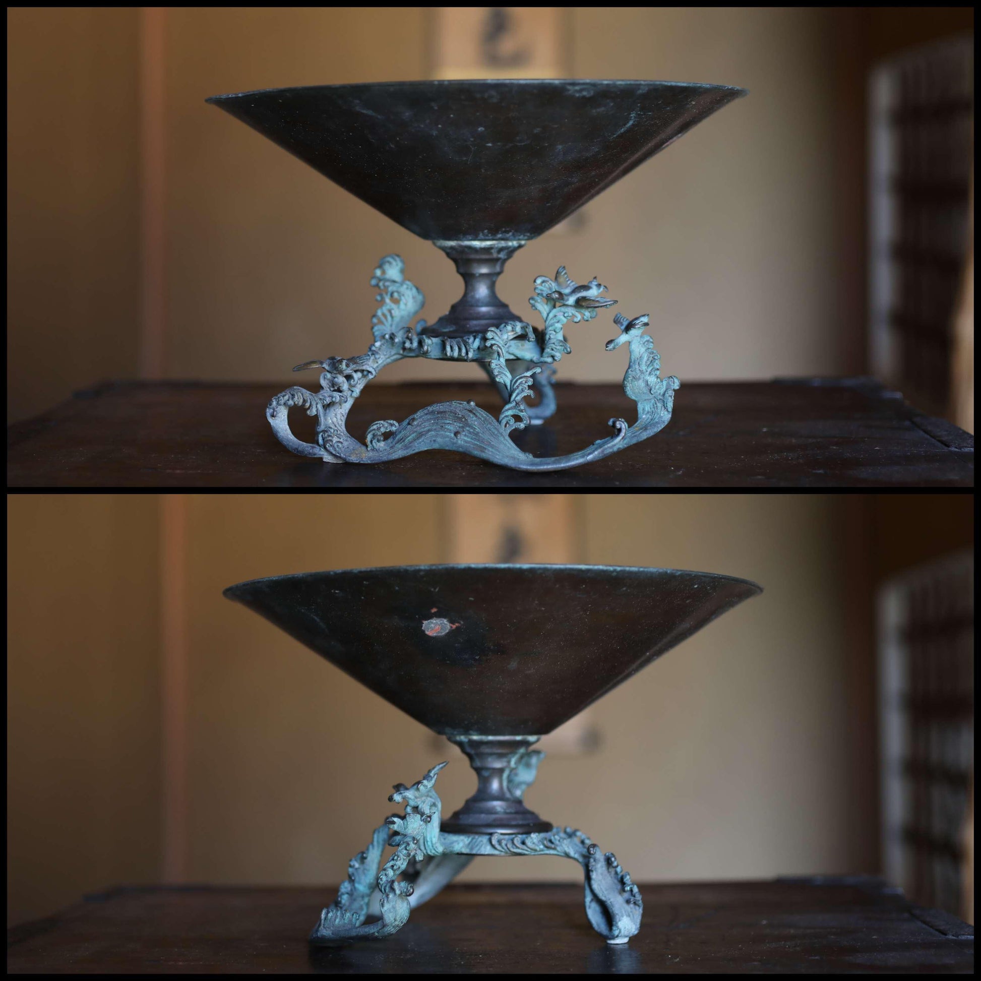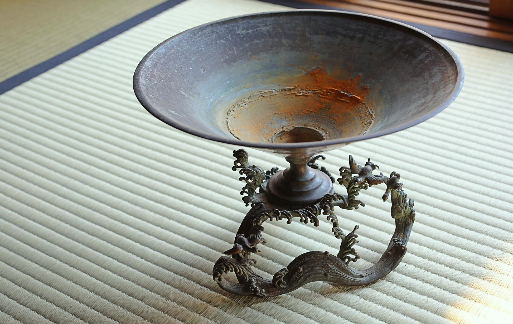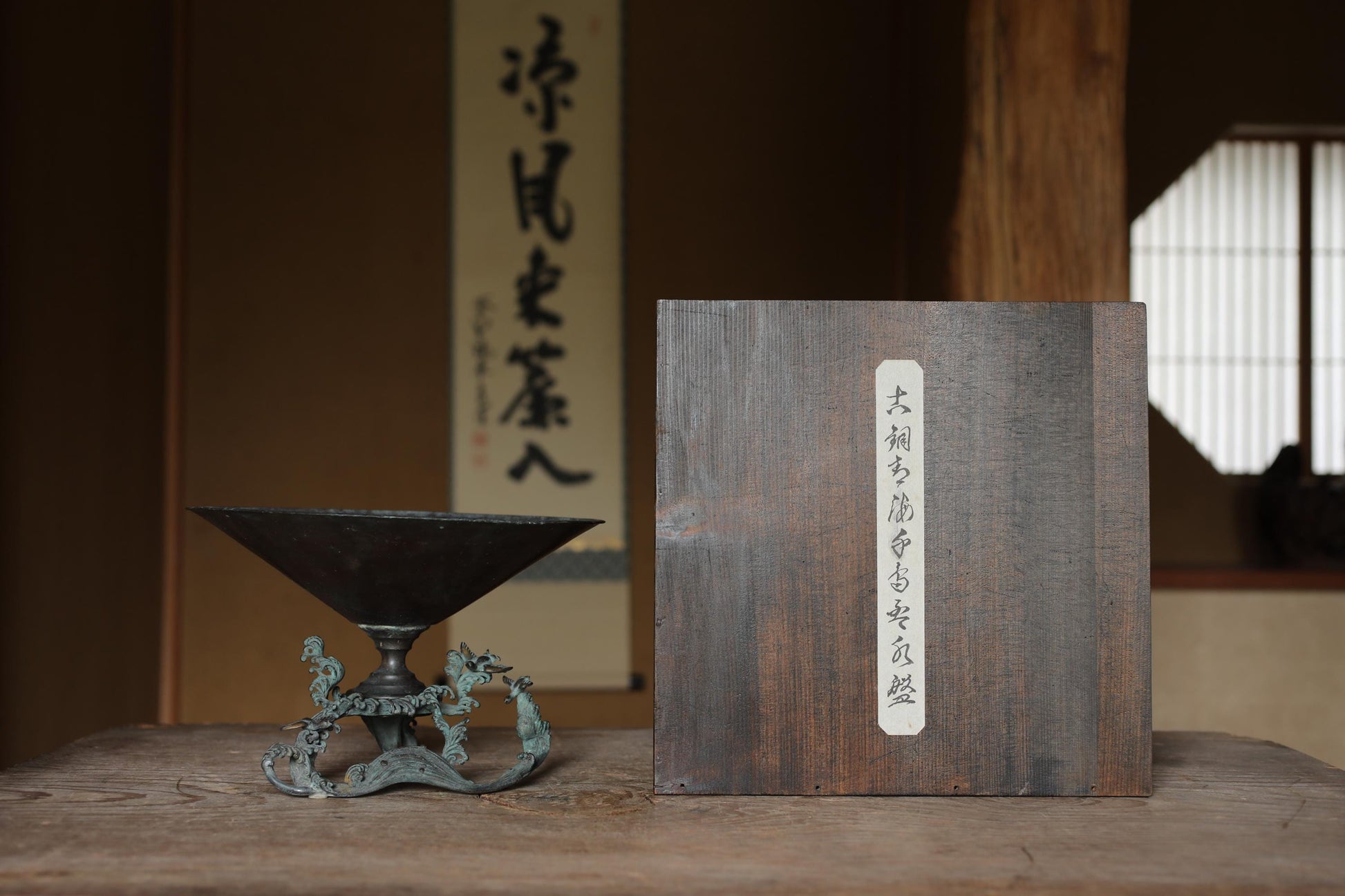FINE! Japanese antique bronze flower vase with birds & wave shaped legs, Japanese furniture temple style 1800s wooden box W10.4in/W26.5cm