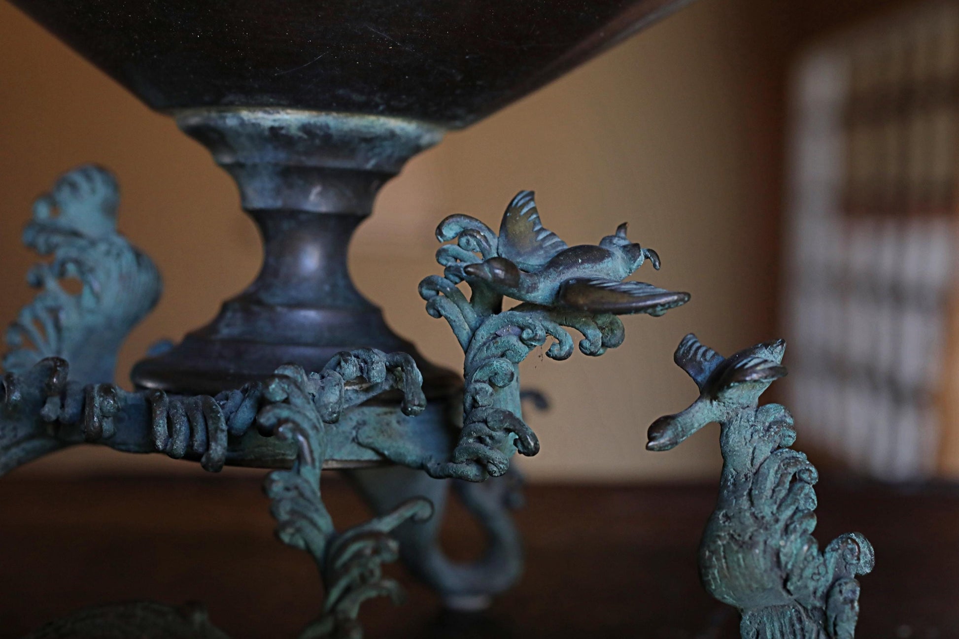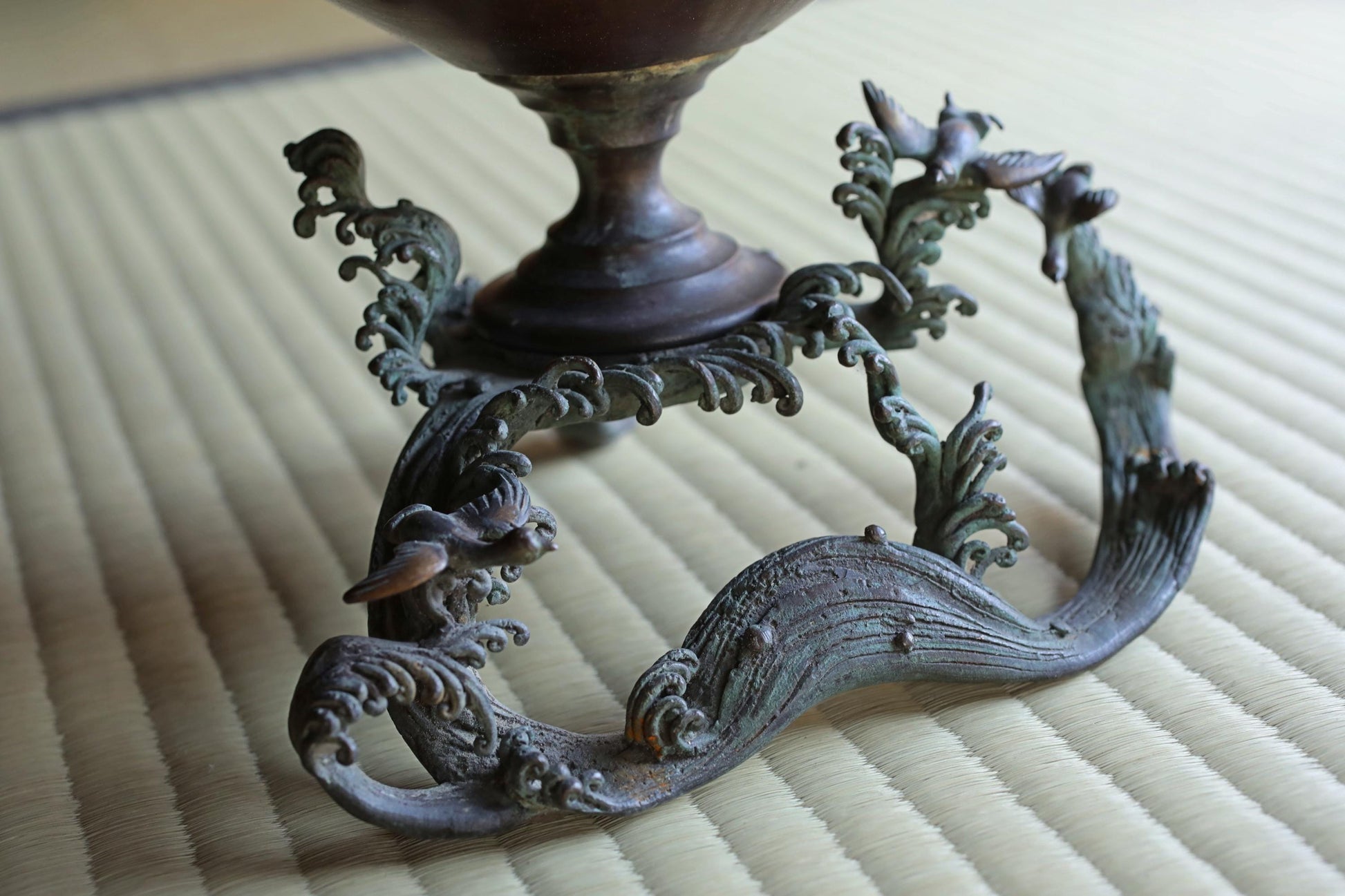 This is a very old copper vase. It is impressive with small birds flying in the waves.