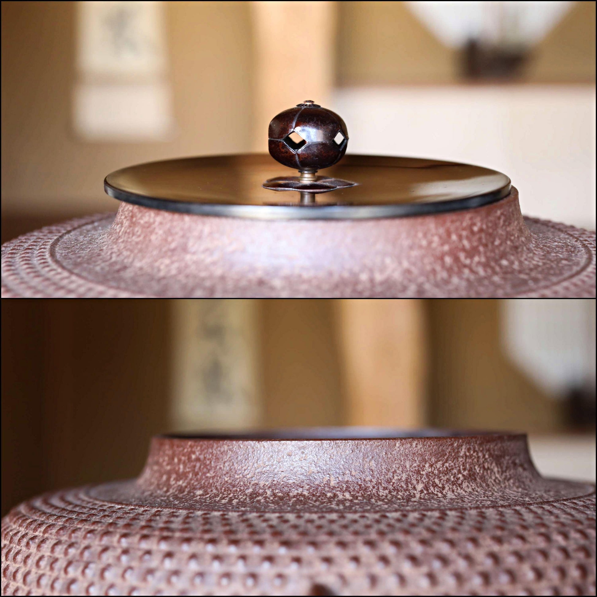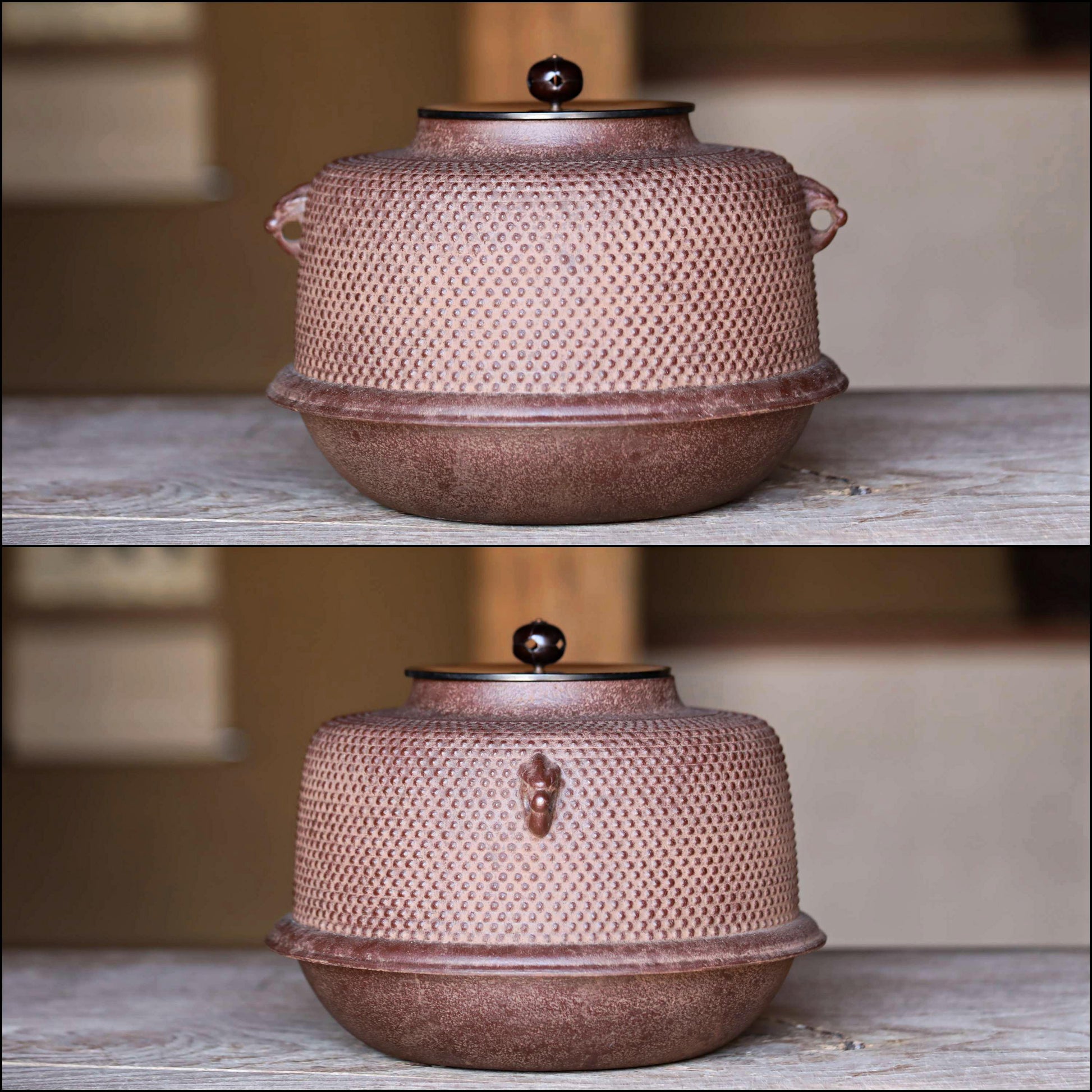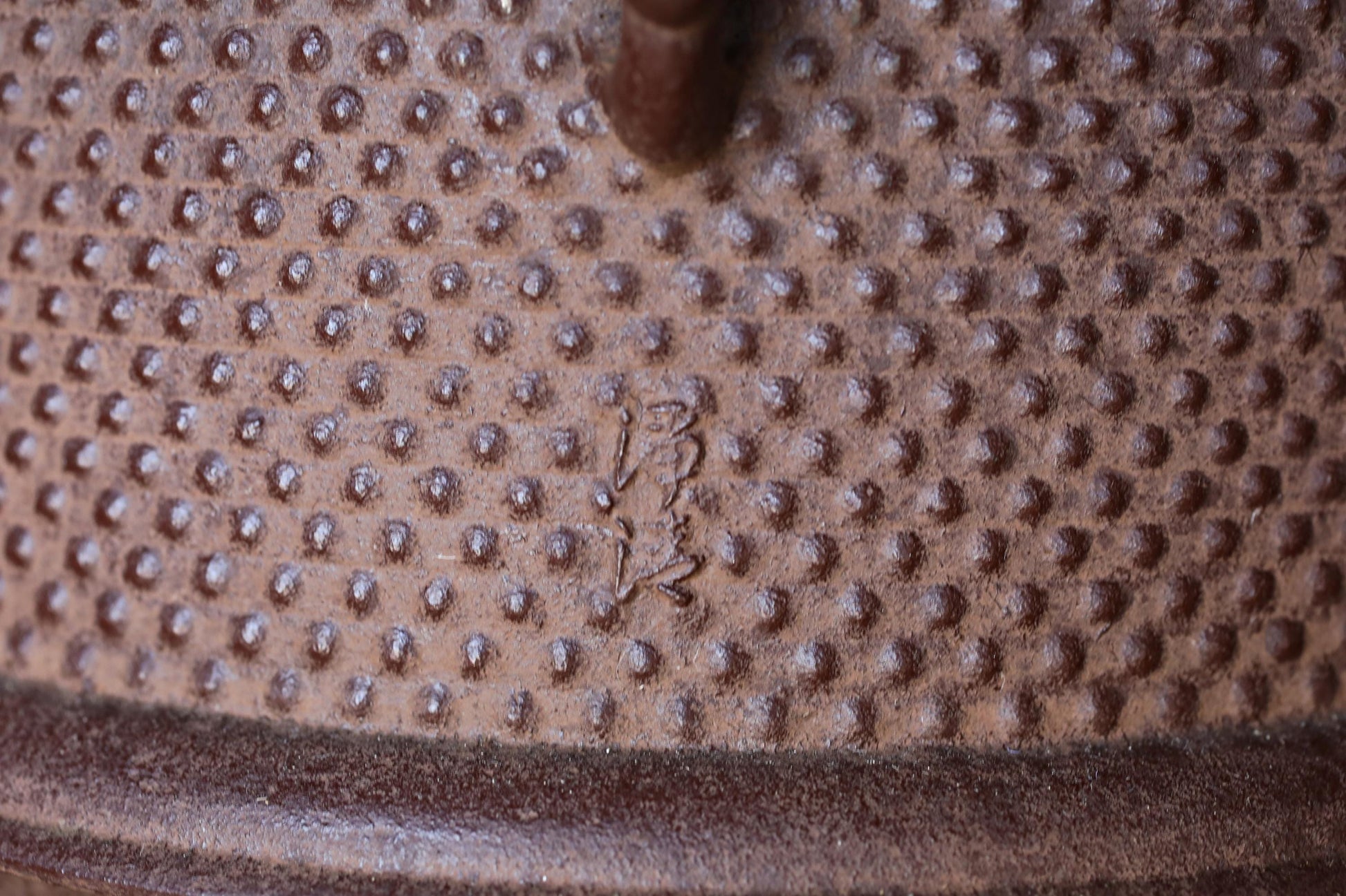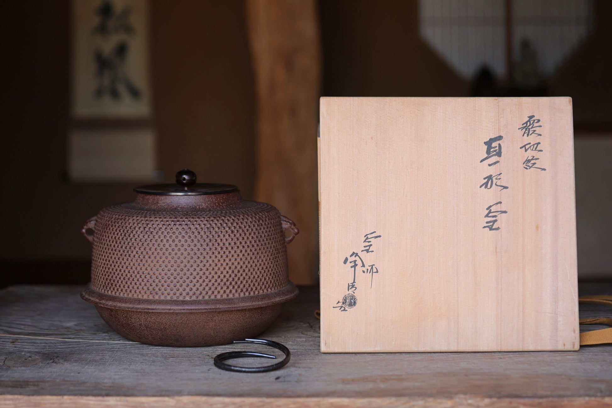 The artist, Sato Jokeiyo (1916-1996), was apprenticed to a living national treasure tea kettle master, and he himself has been honored many times by the government. He was also awarded the title of “Okama-shi” (master of tea kettles) by 大徳寺 Daitokuji Temple. This title is given to a kama-shi who understands the spirit and traditional culture of the tea ceremony and expresses them in his kettles, and is a very high honor.