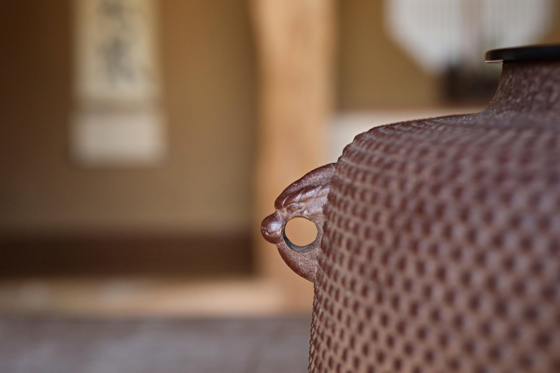 茶釜Chagama. This kettle has a shape called the 真形 Shin-nari kettleand was made by “Sato Jokei” who studied under a famous kettle master who was also a living national treasure. His name is engraved on the side. It is also considered the most prestigious form of kettle that would have been the first to be used in a tea ceremony.