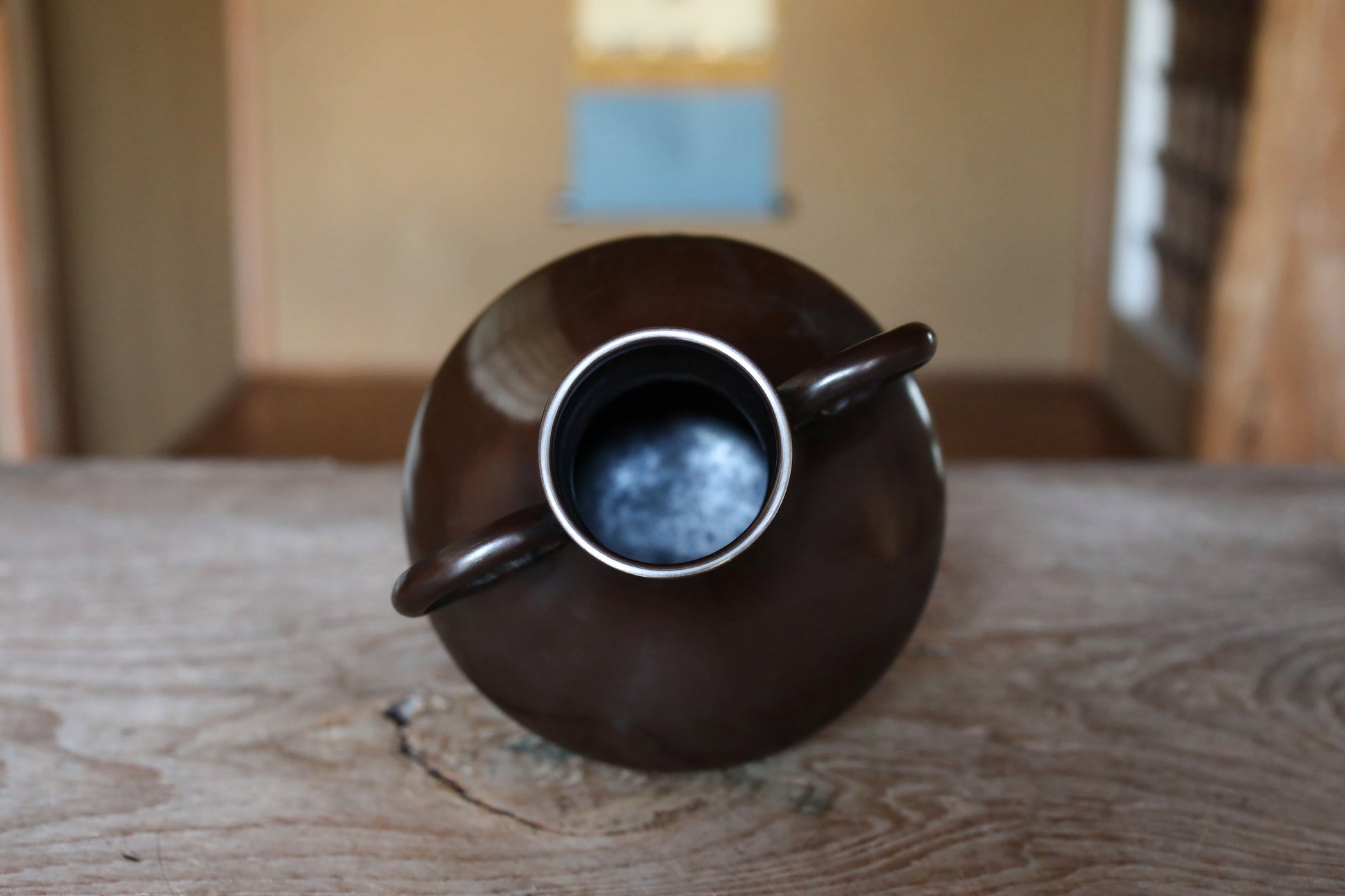 FINE! Japanese vintage 1960s Bronze flower vase dark brown with beautiful dragons ears with 天龍 sign furniture H9.4in/H24cm