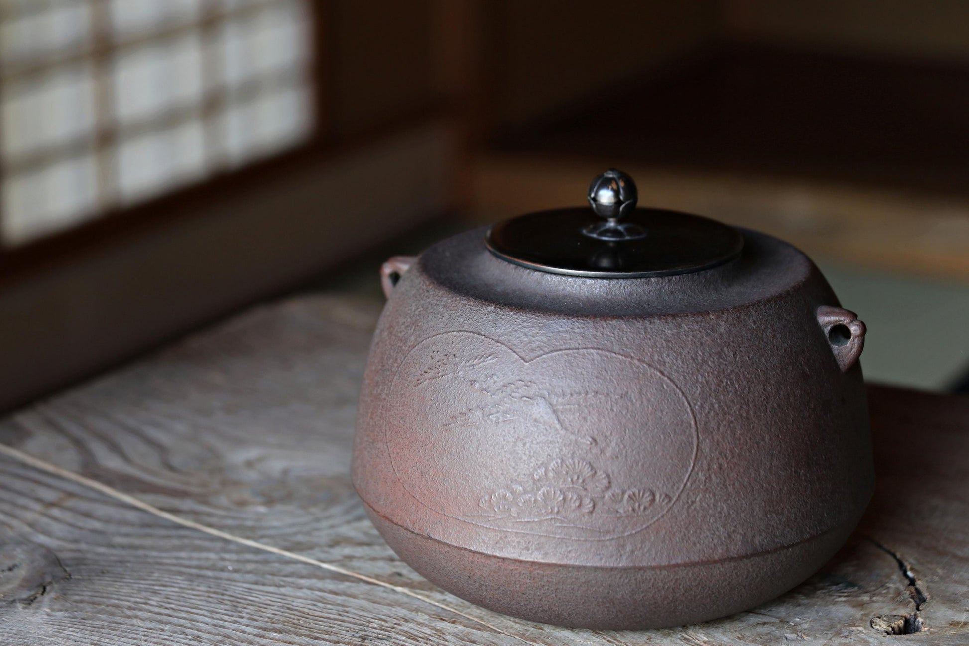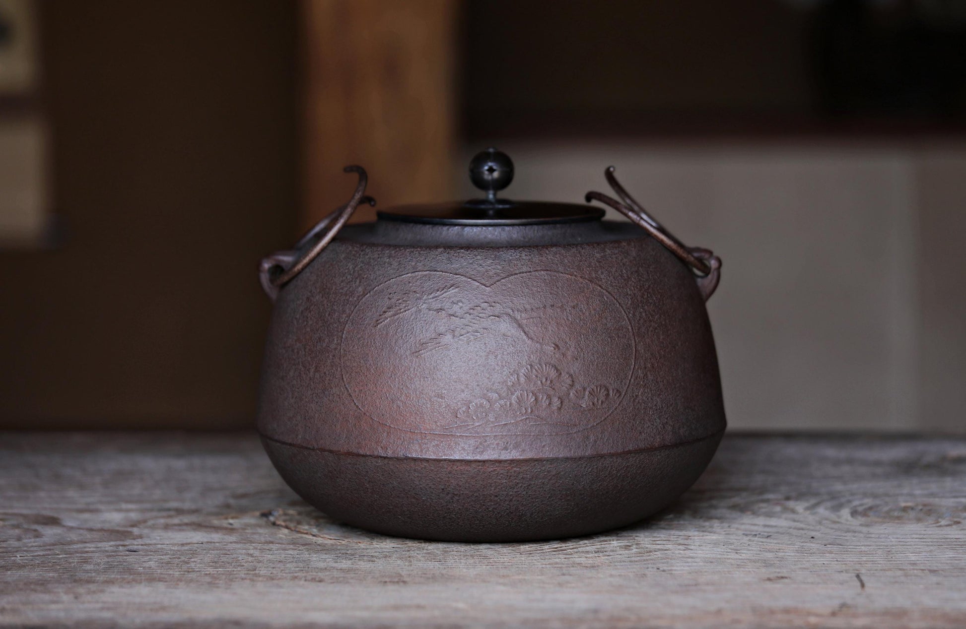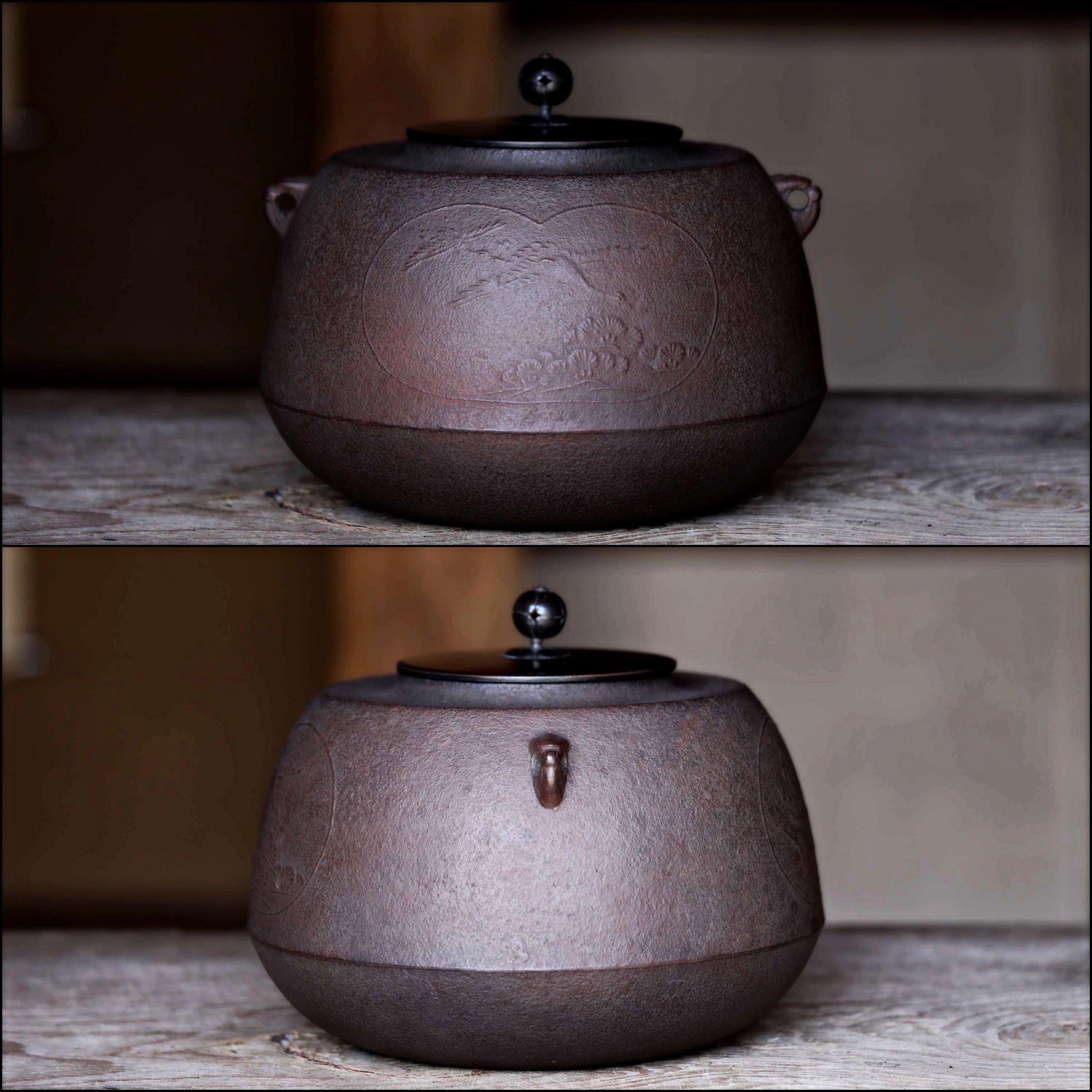 The sides are decorated with a couple of cranes flying over a pine tree and reliefs of plum and bamboo. The artist's name is also in relief under the round ring, called an ear, where a removable handle, called a ring, hangs.