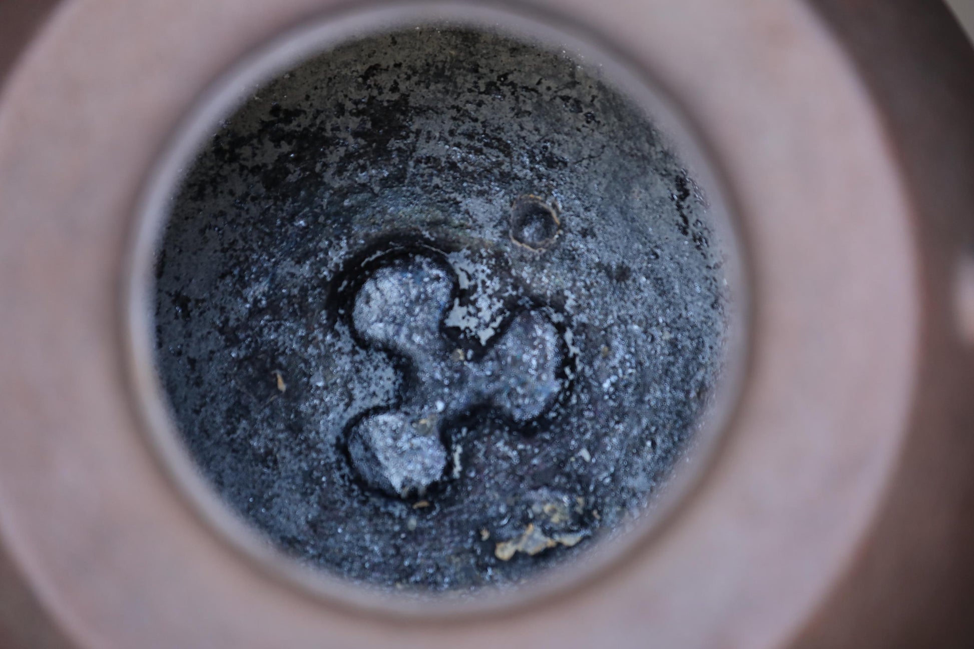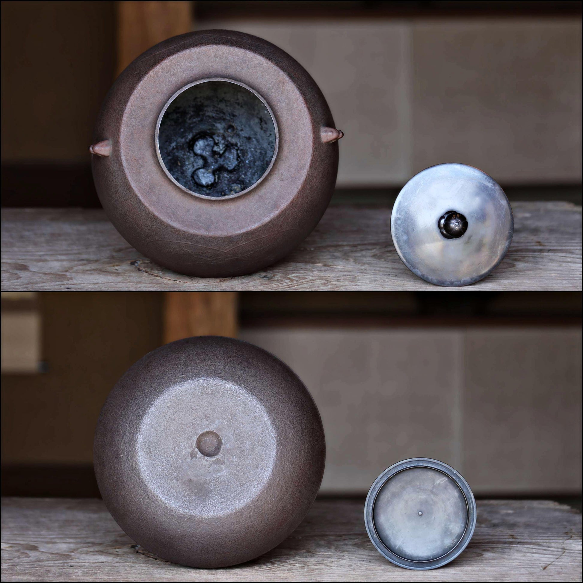 "茶釜Chagama" Teakettle for tea ceremony. This kettle is called a 田口釜 taguchi-gama, and is one of the shapes of a 茶の湯 chanoyu kettle, with a slightly smaller mouth, a slightly gouged shape with the base of the mouth lower than the shoulder, and a groove around the mouth.