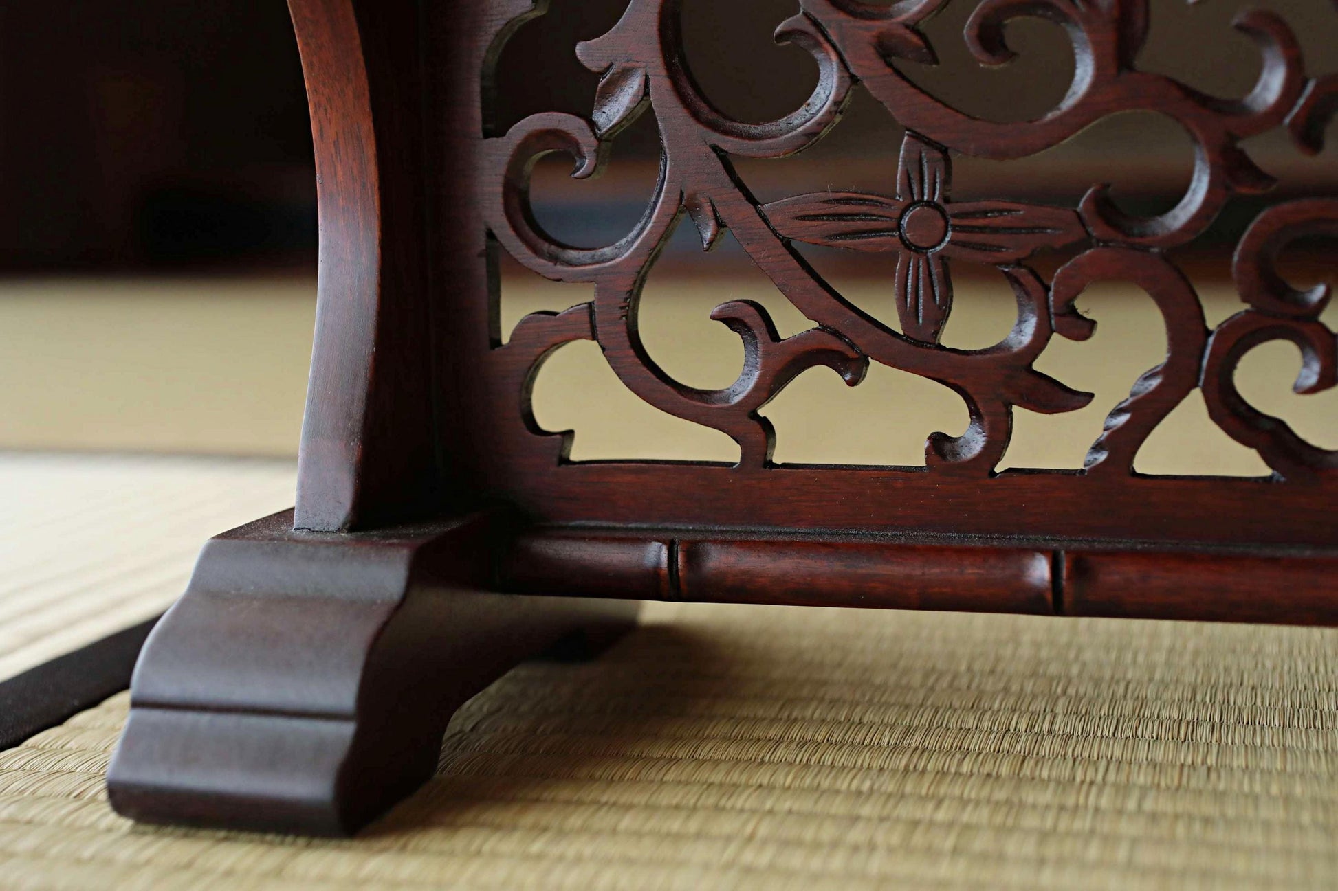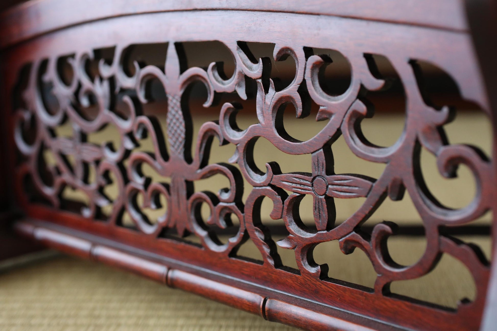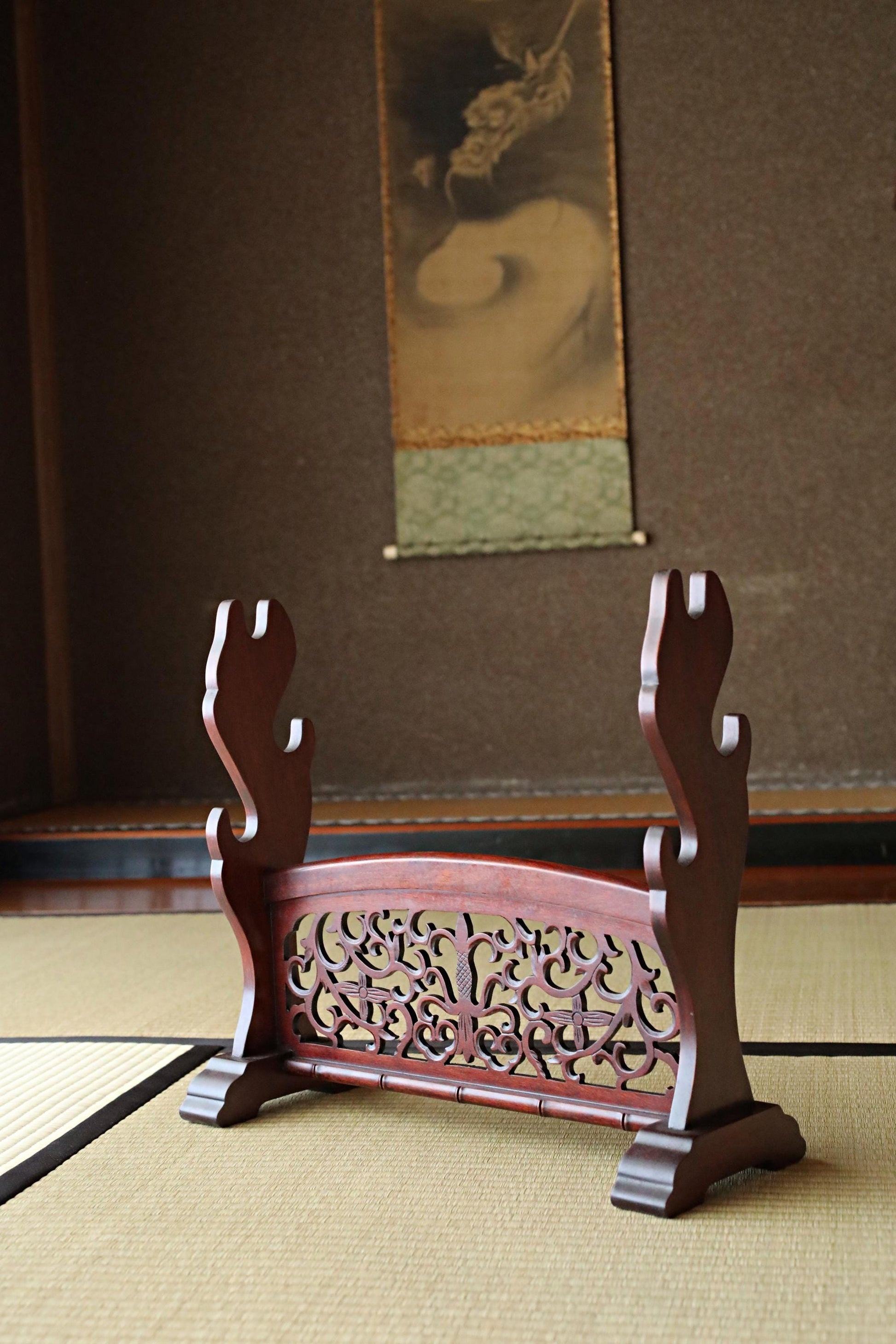 FINE! Japanese vintage furniture KARAKI rosewood wooden lacquer sword rack with openwork Shogun Sword KATANA rack H16.1×W18.4in/H41×46.7cm