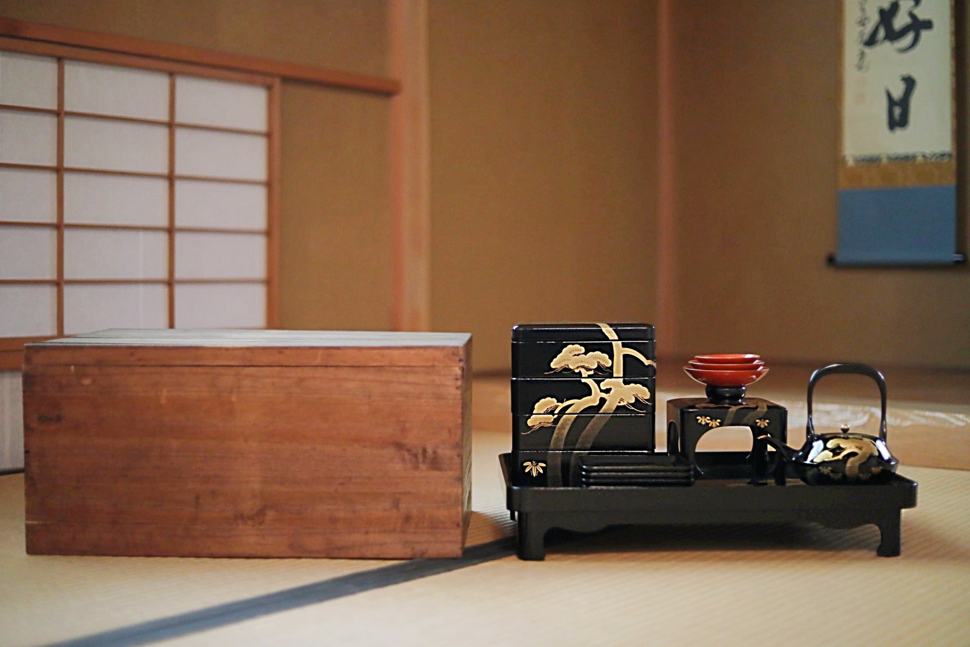 This is a New Year's table set, made of fine wood and lacquer. There are some repairs on the back of the bento box and sake cups, but overall the set is in good condition and ready to use.