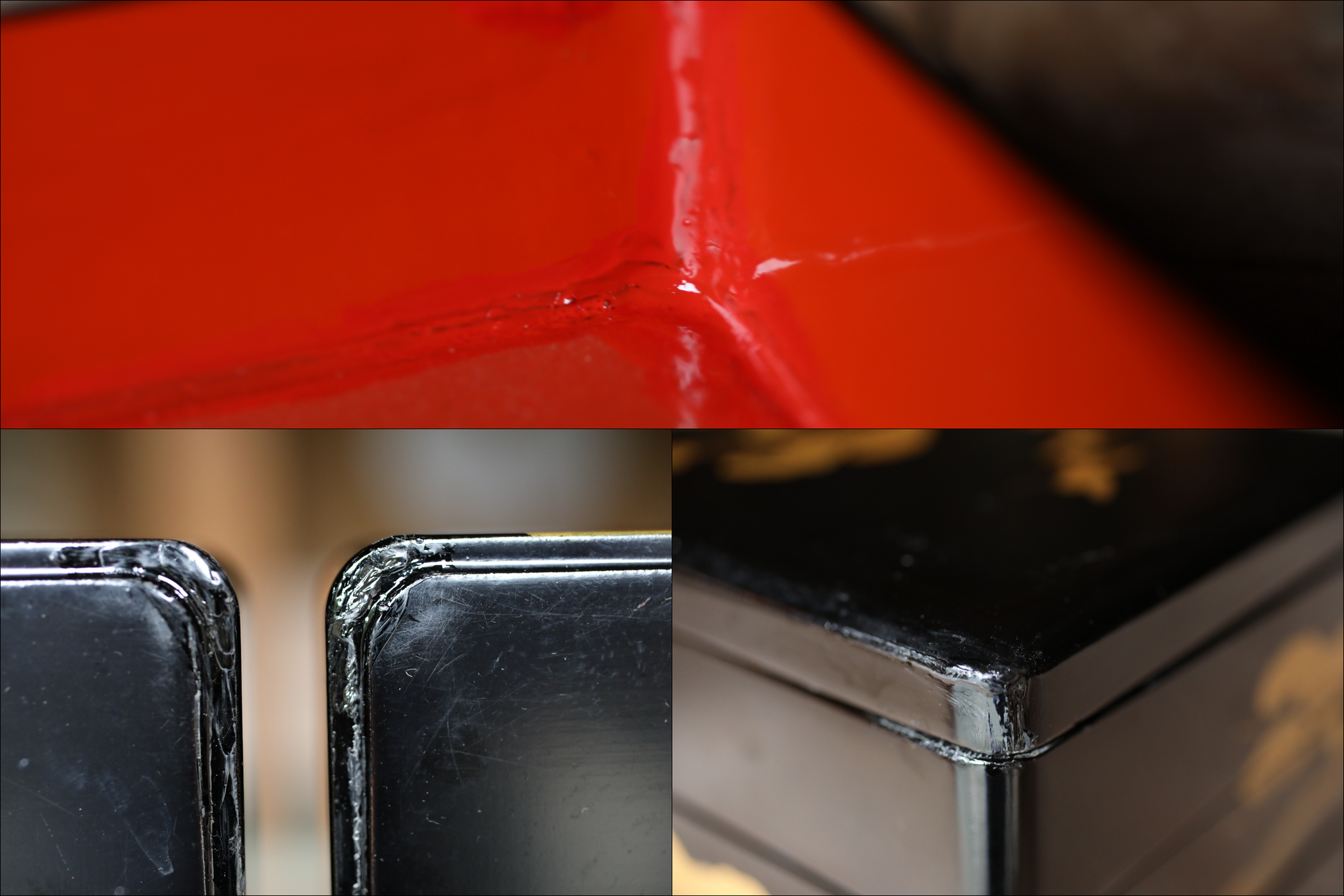 There are signs of repair on the corners of the lacquered box, but overall the set is in good condition and ready to use.
