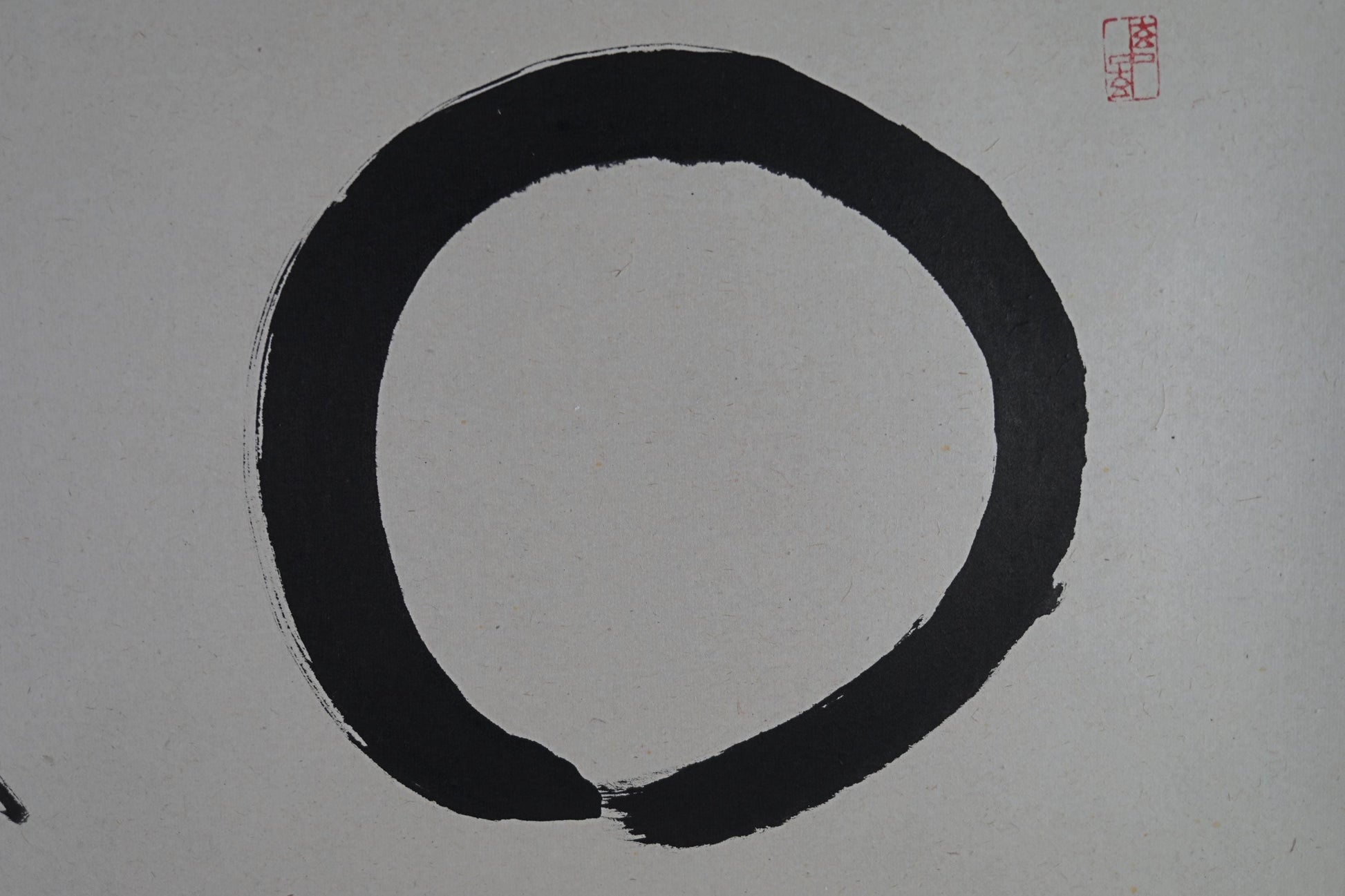 The act of drawing the Enso is a meditative practice that brings him /her into the present moment. It's a reminder to be mindful and fully present in each moment of our lives. This was drawn by "福本積應 Fukumoto Sekiou" , a zen monk, Daitokuji sect, born in 1930.