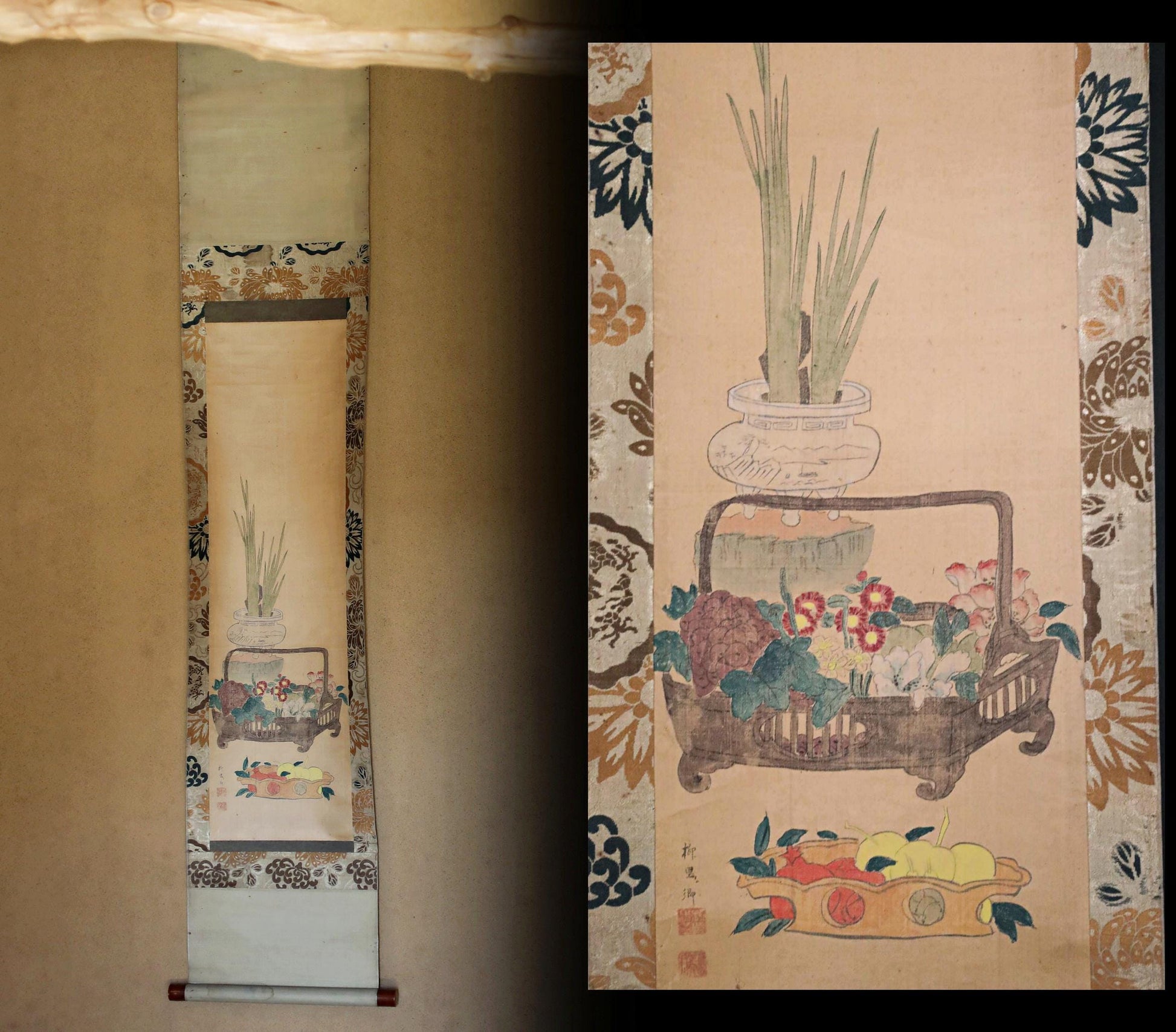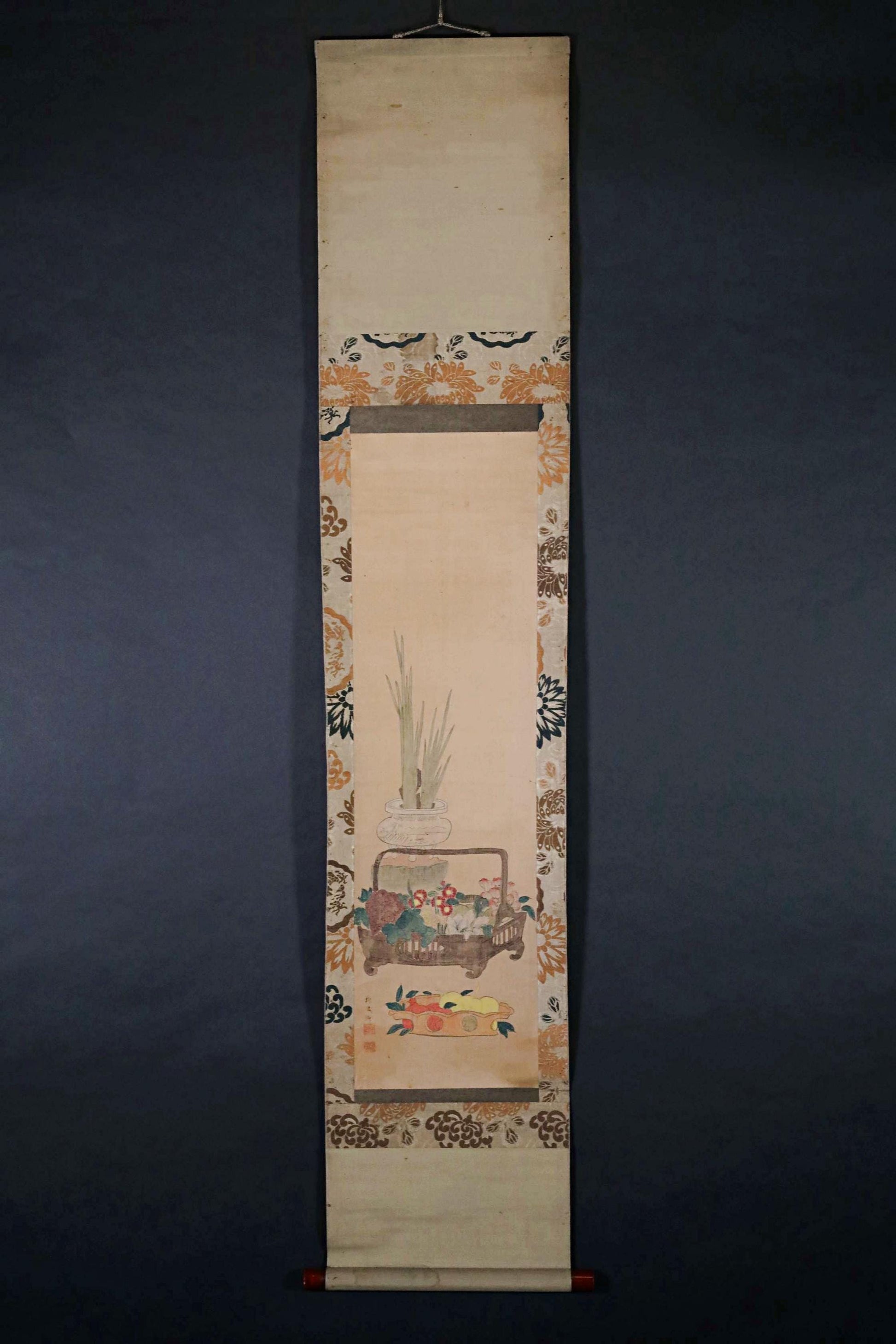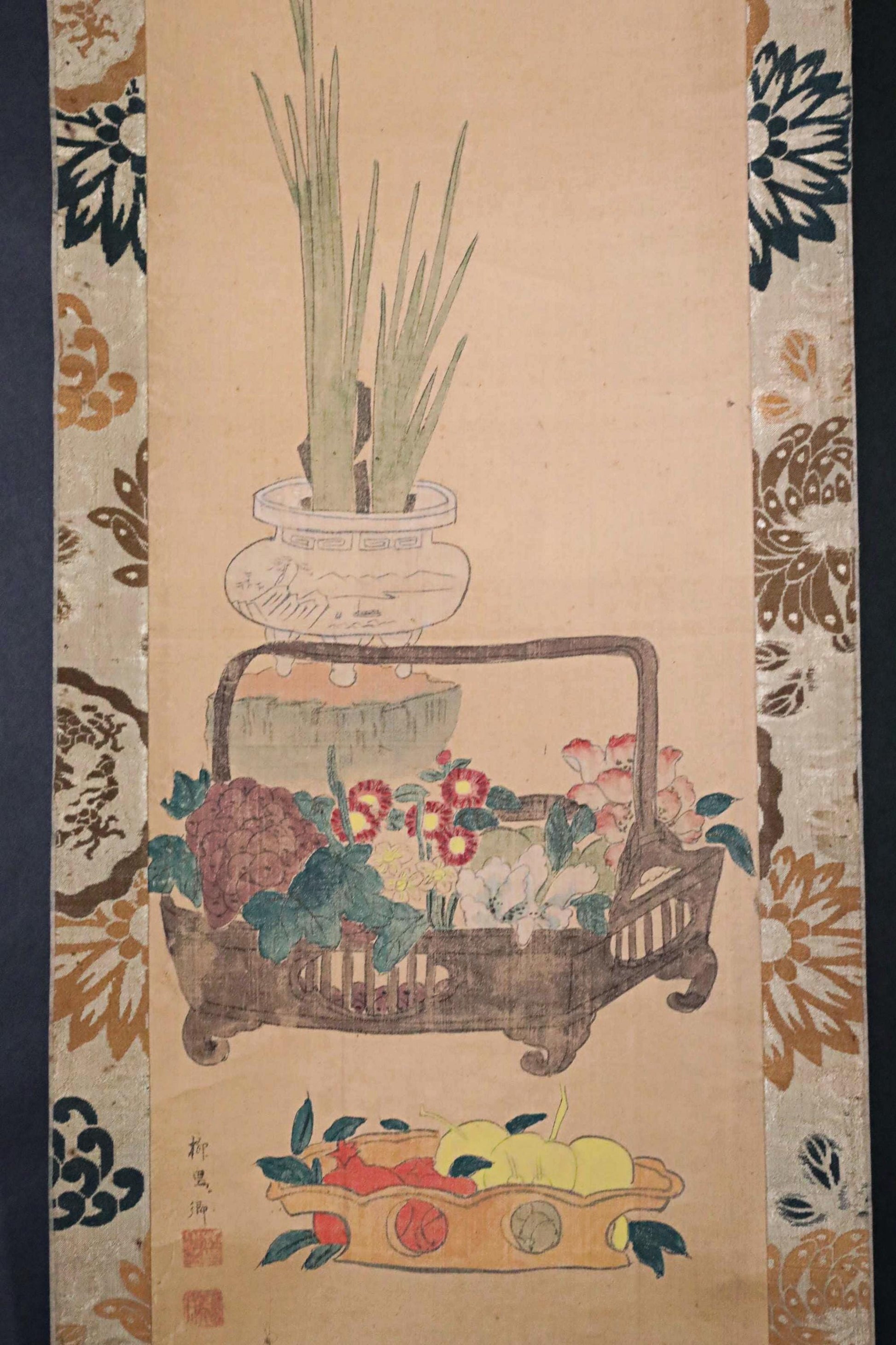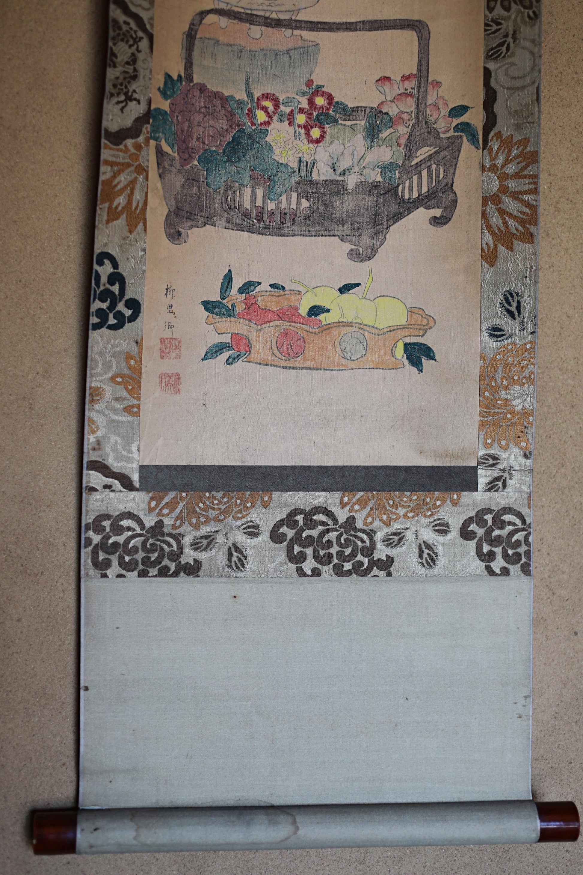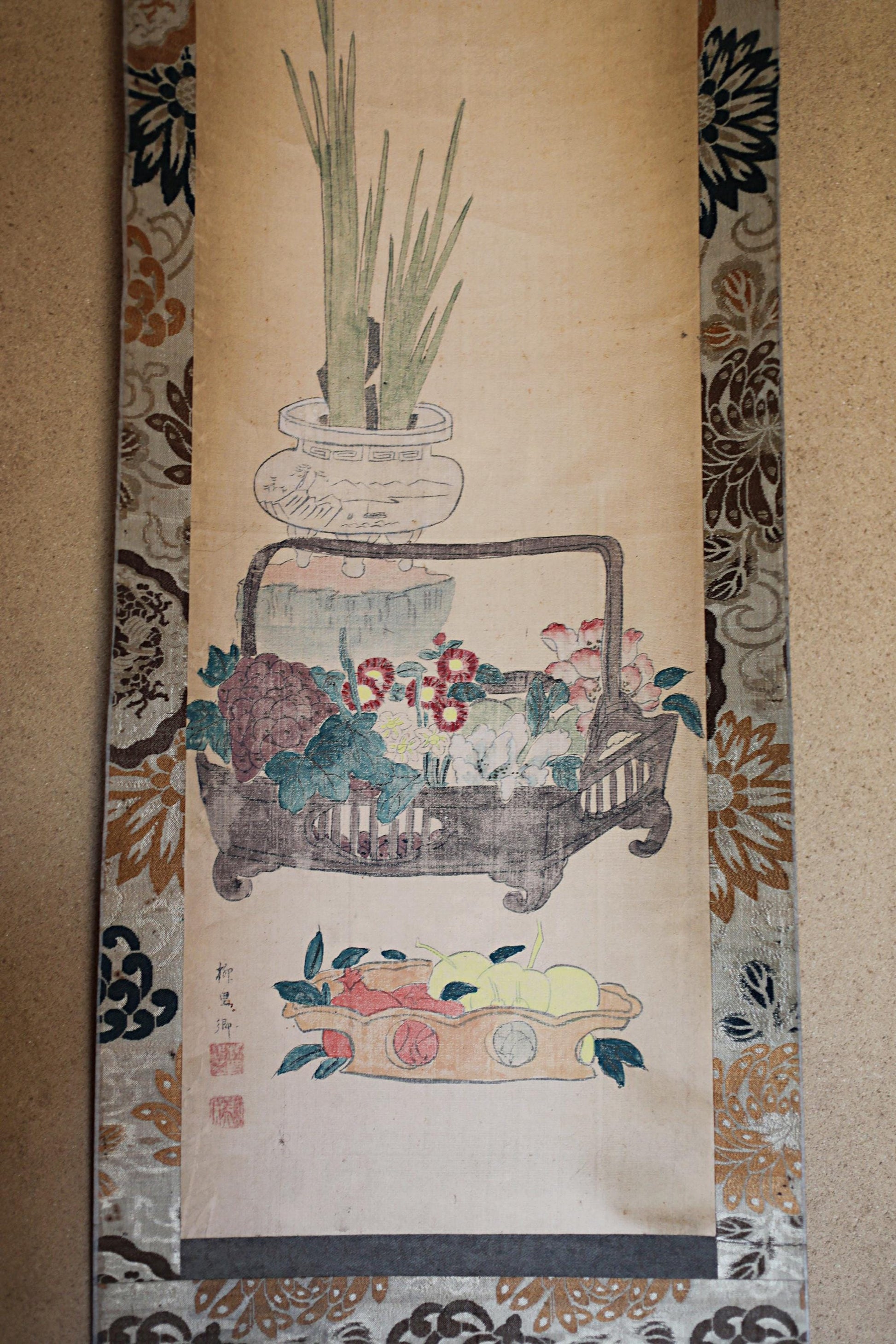 Japanese antique hanging scroll of water color painting on silk, ikebana, flower basket, Fruits KAKEJIKU with BOX 1920s H61in/H155cm