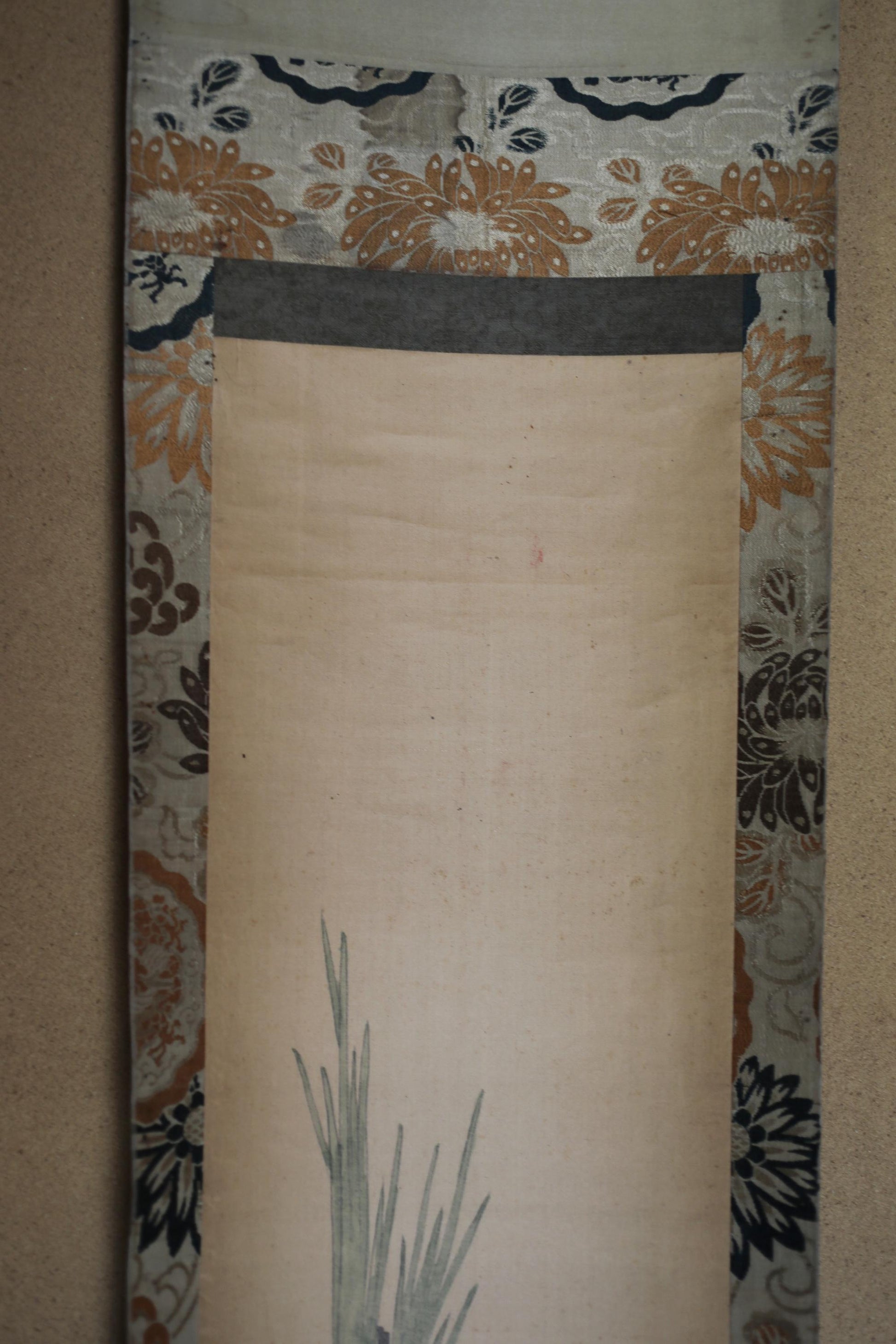 This hanging scroll is very old and beautiful with a very old silk ground around it. The overall atmosphere of age as a hanging scroll is cool.