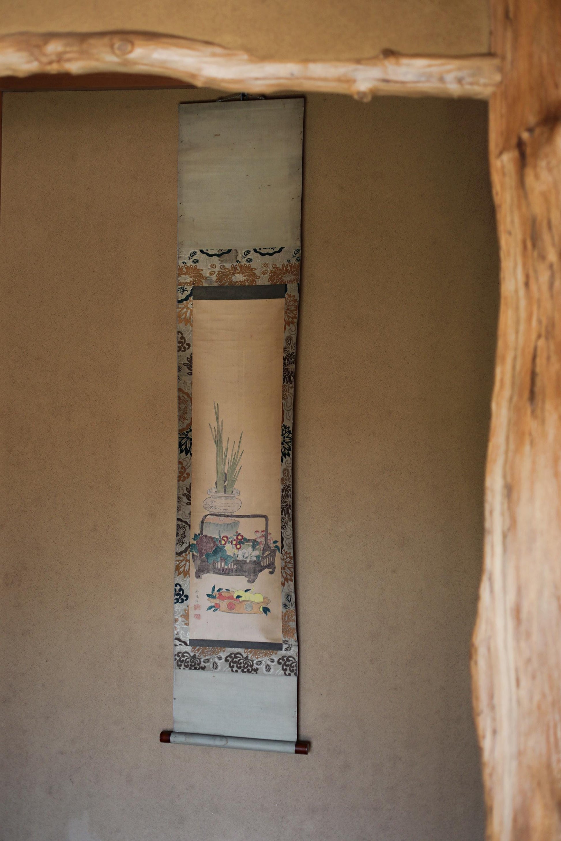 It is signed Ryu-rikyo. This artist was born in Nara Prefecture in the mid-Edo period and was one of the pioneers of literati painting. The painting is thought to be a copycat, but the surrounding fabric is so old and luxurious that it was probably made for the amusement of the rich.