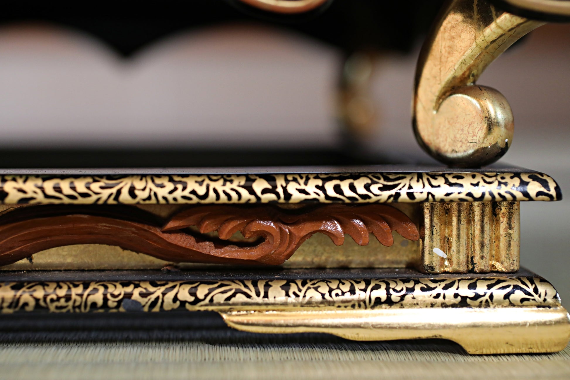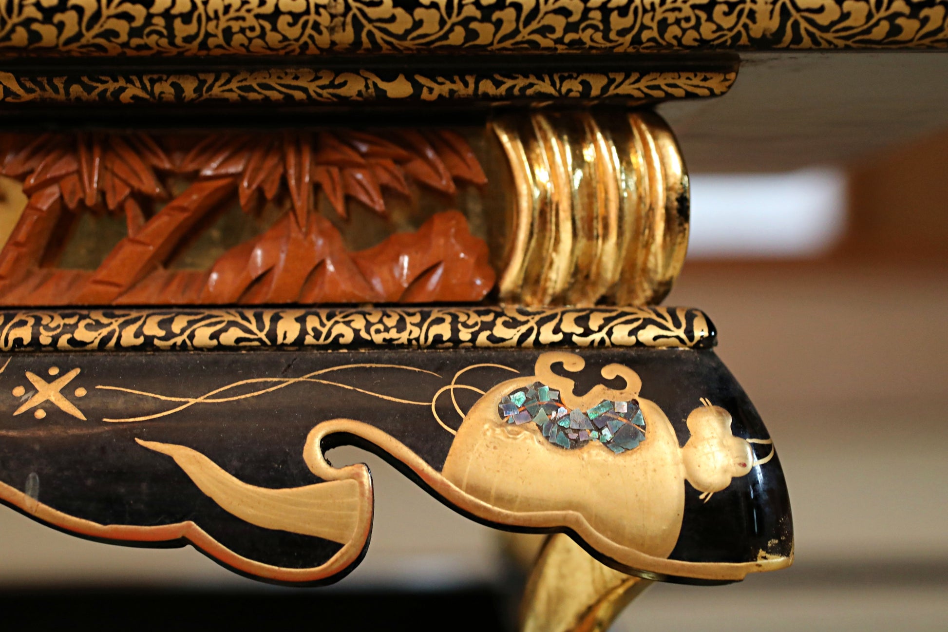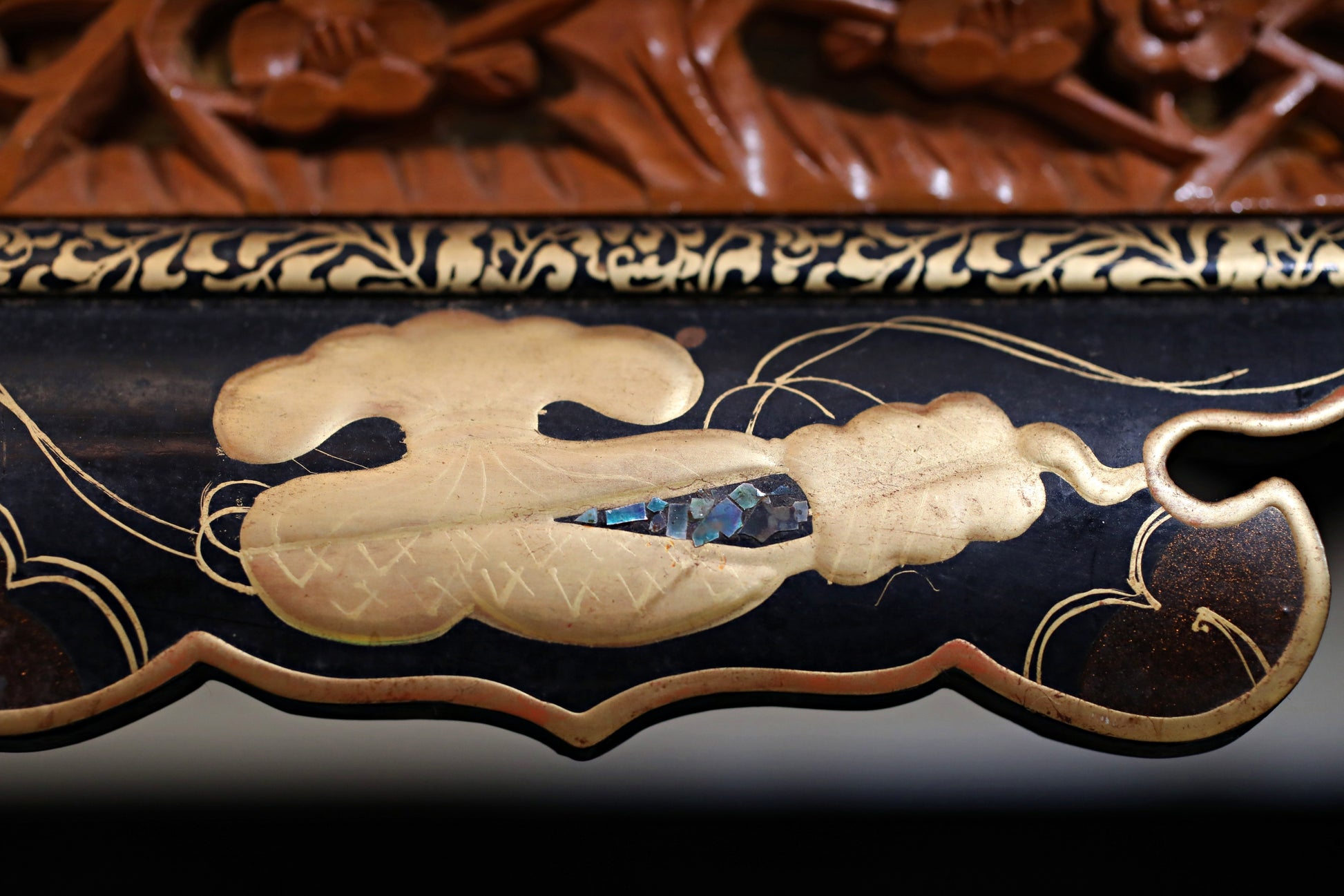 This is a beautiful antique sutra desk that was used in a temple. It is decorated with lacquer and gold leaf, a technique known as maki-e. Furthermore, shells are embedded in it using a technique called raden, giving it a beautiful, lustrous appearance. The flowers and birds carved from the reddish wood are also a joy to look at.