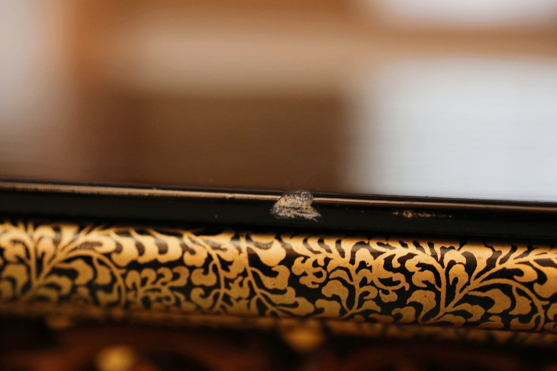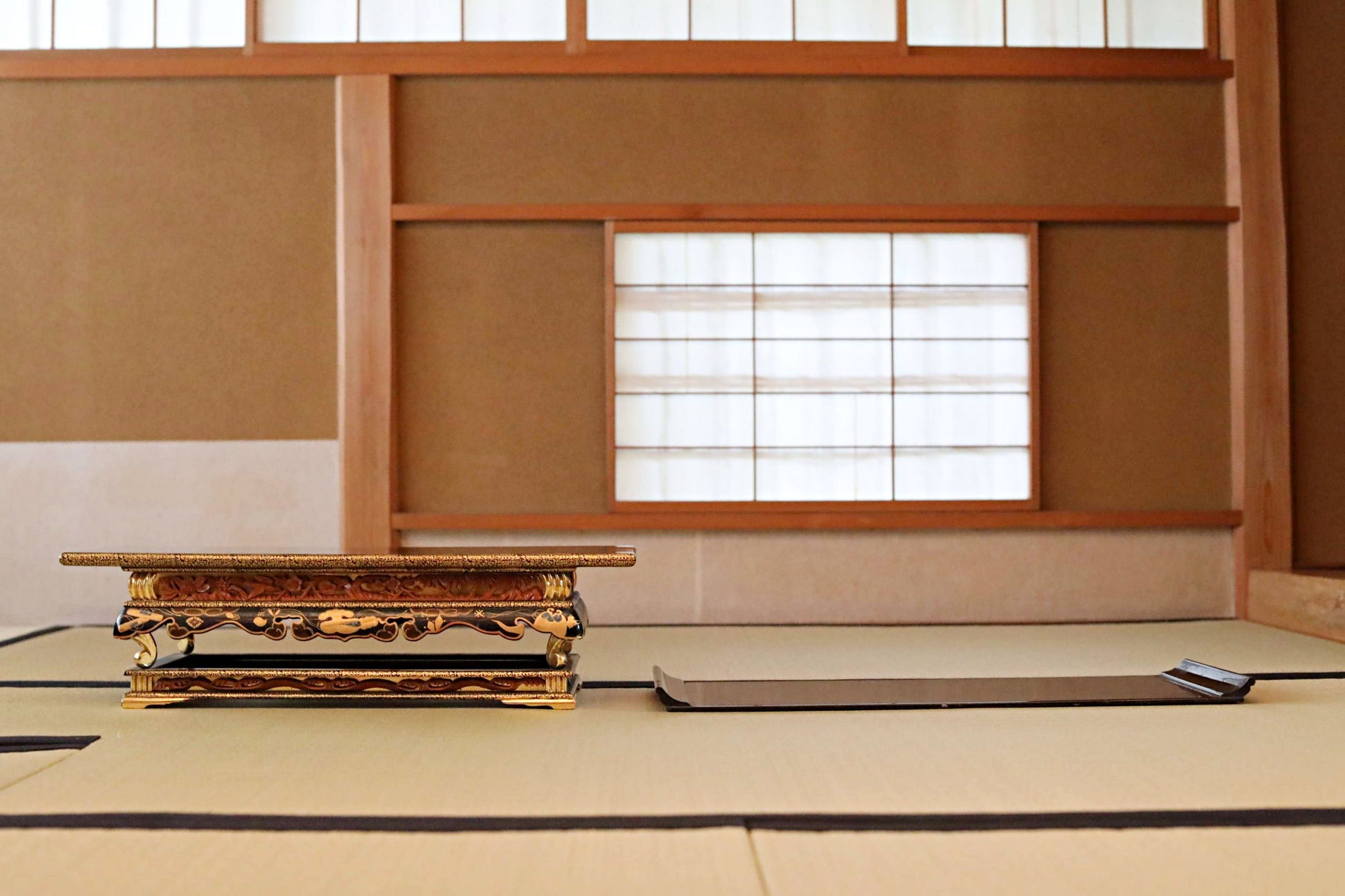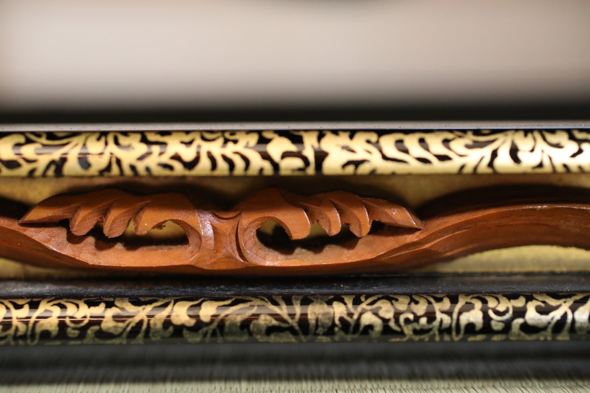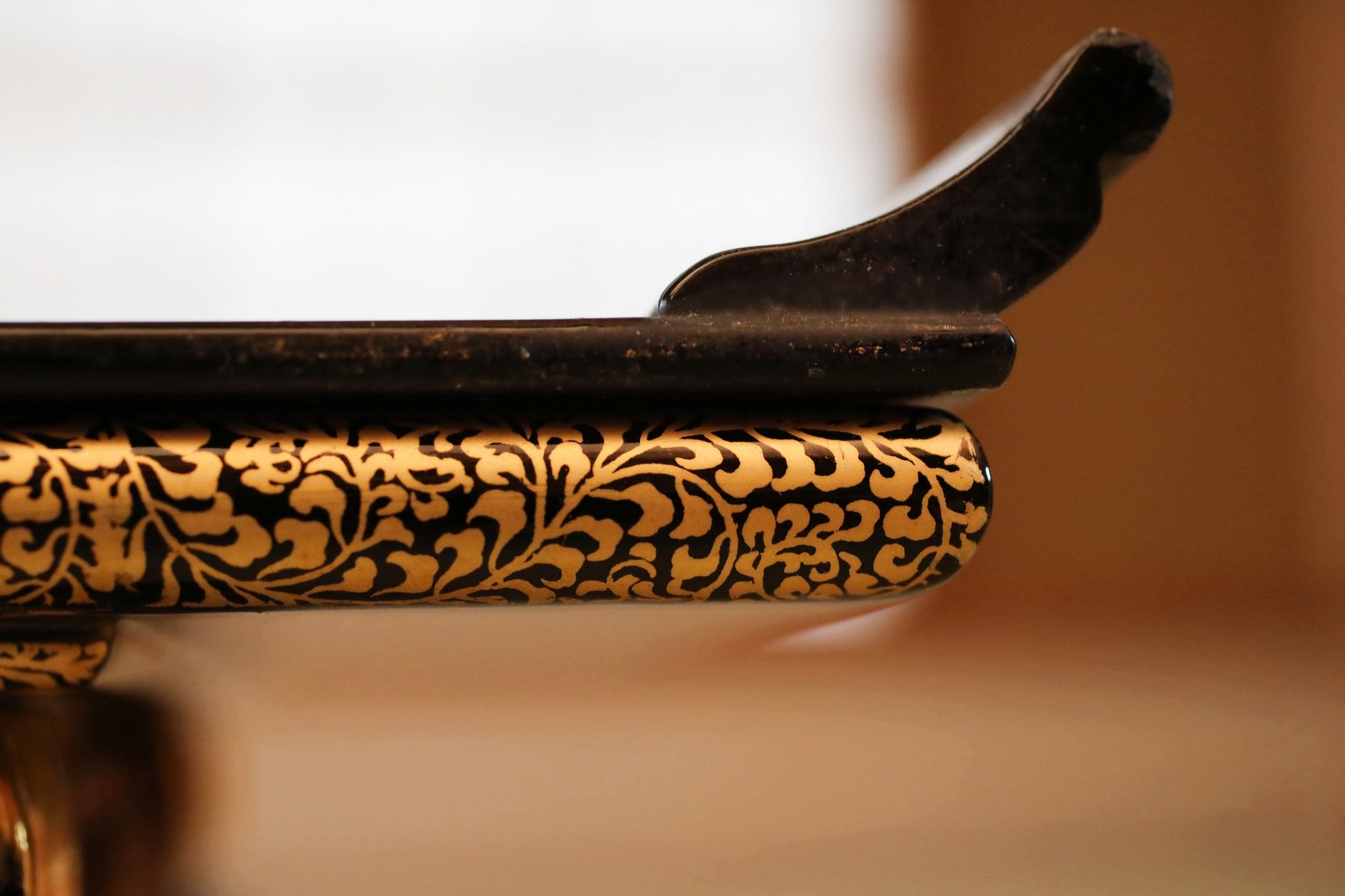 This is a beautiful antique sutra desk that was used in a temple. It is decorated with lacquer and gold leaf, a technique known as maki-e. Furthermore, shells are embedded in it using a technique called raden, giving it a beautiful, lustrous appearance. The flowers and birds carved from the reddish wood are also a joy to look at.