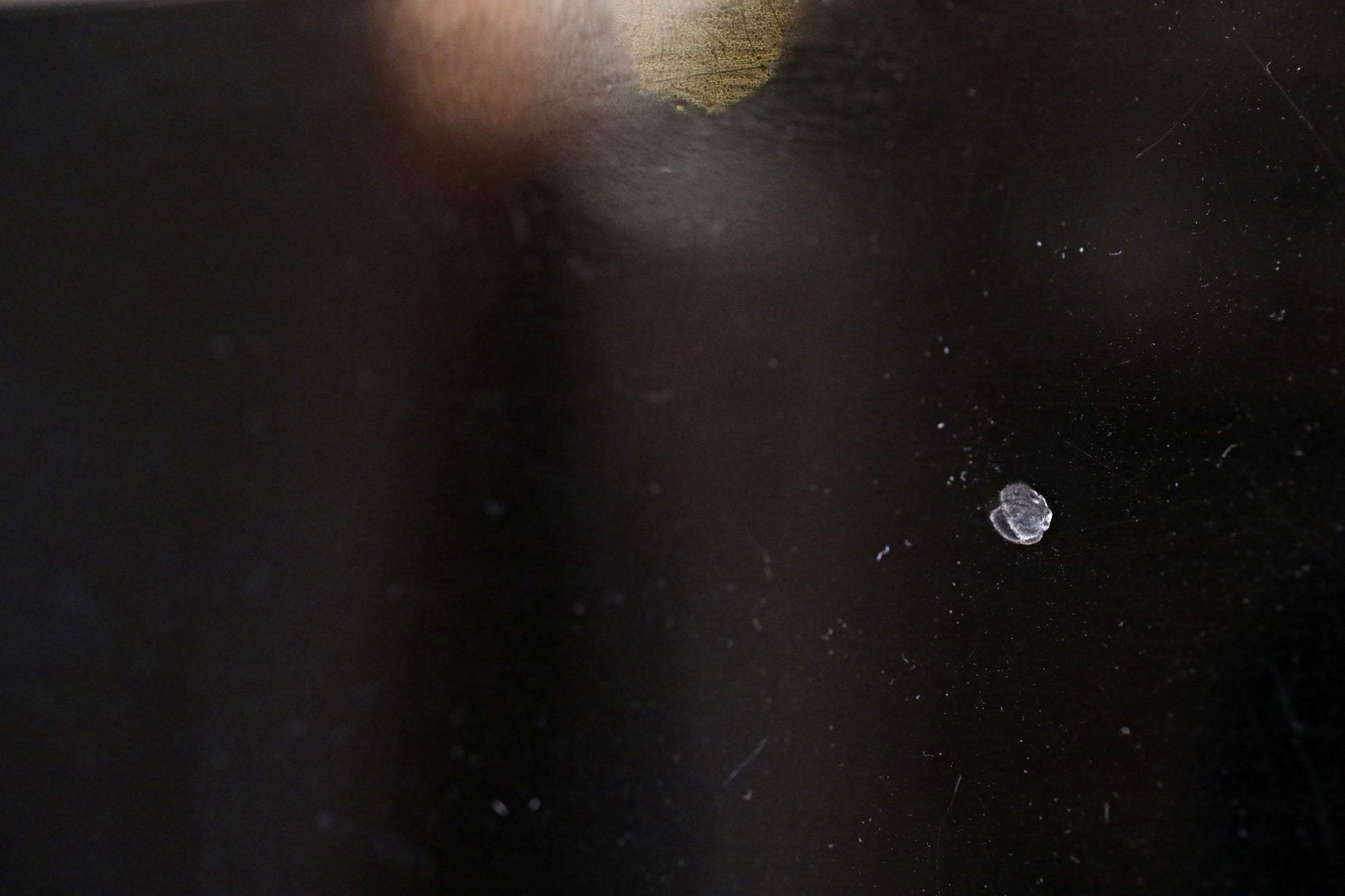 There is a small dent on the desk top. There are no scratches that would affect use.