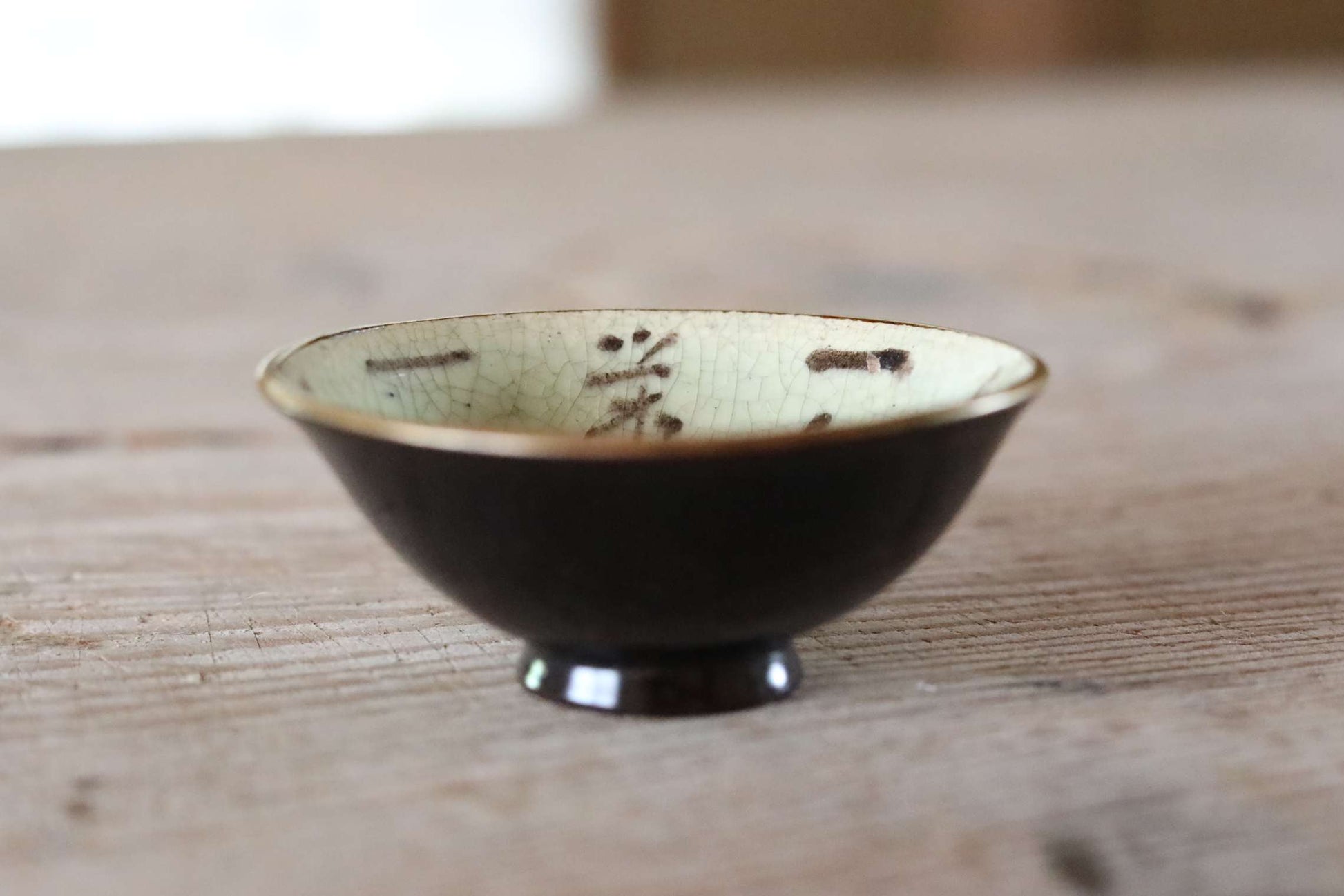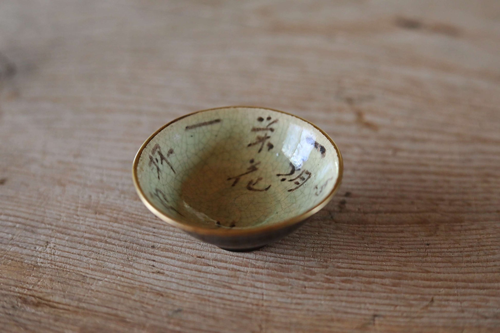 The outer surface is black urushi with a golden grass-like design in maki-e (gold lacquer). The inside is a pale yellowish green glaze with Chinese characters such as “flower” and “willow” written on it, giving it a unique poetic atmosphere. The rim is gold.