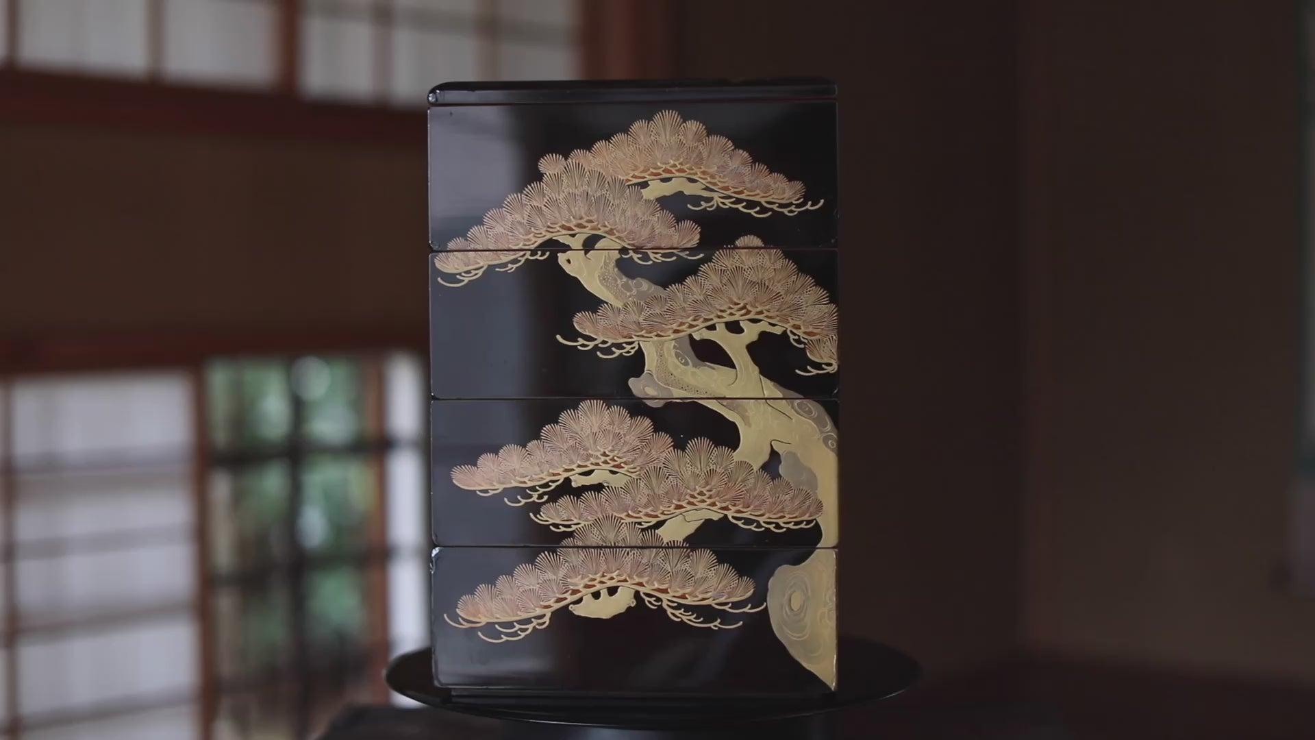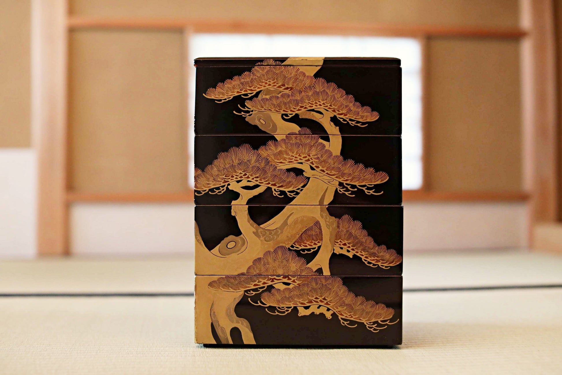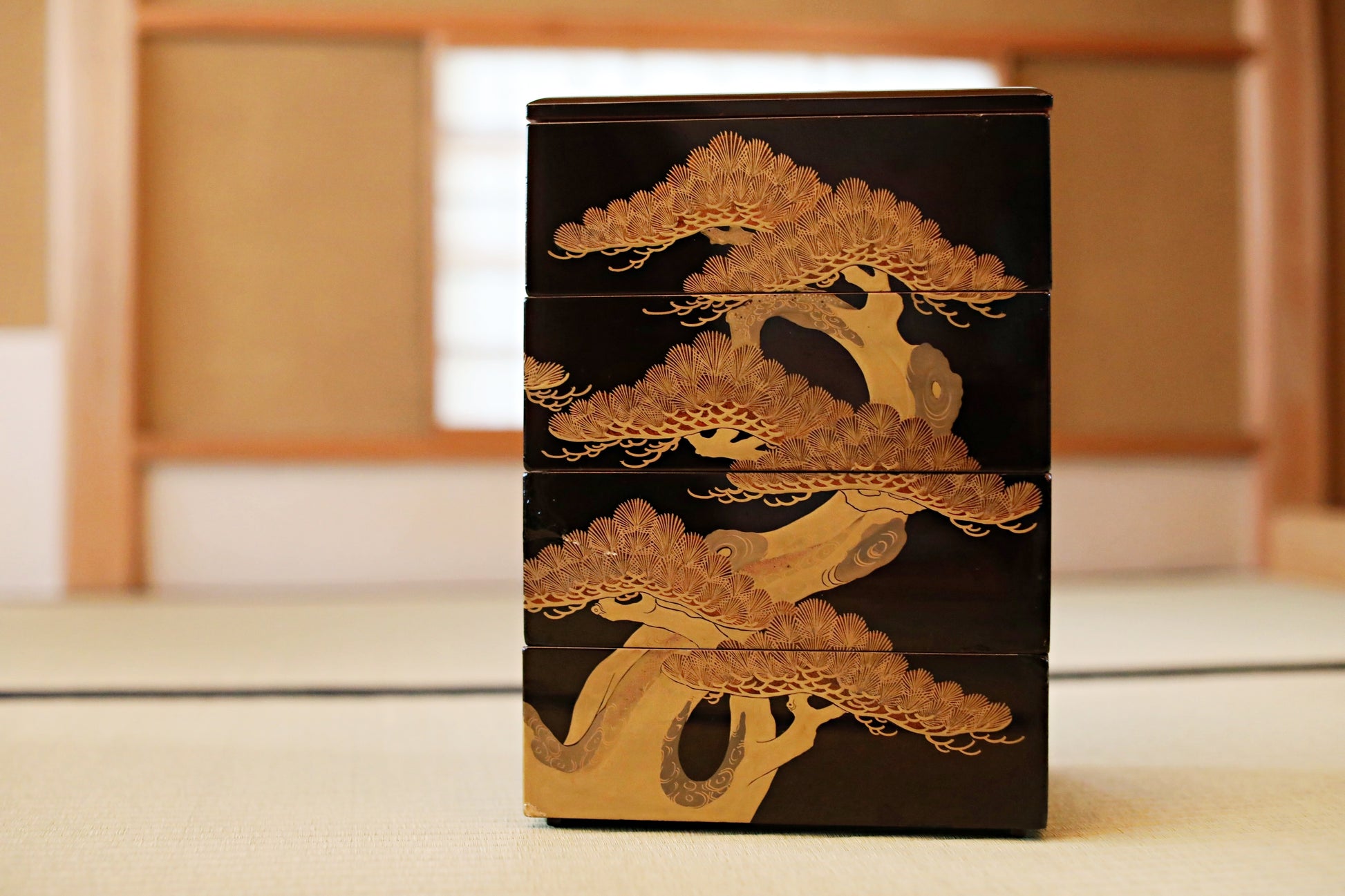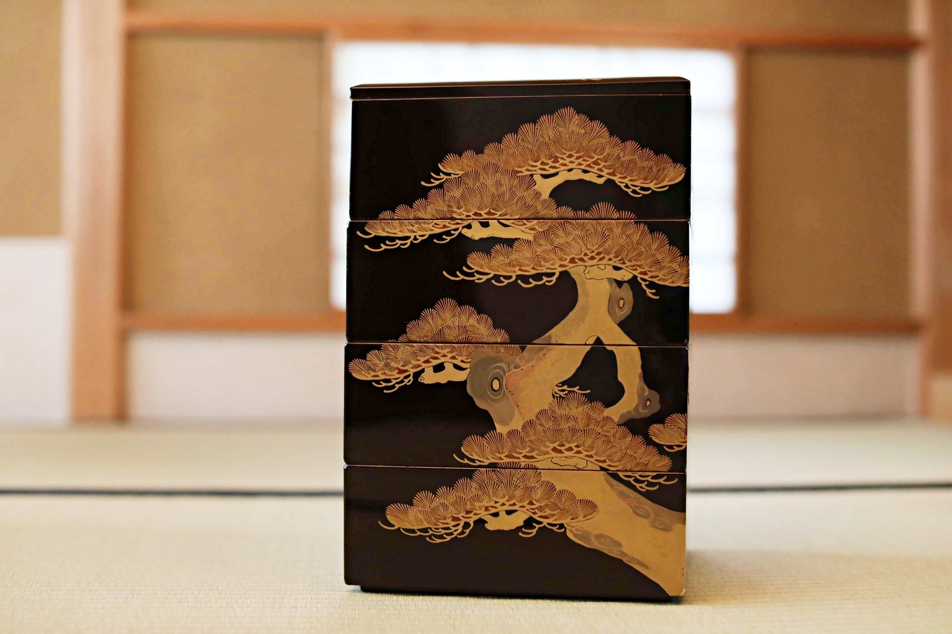 Antique Japanese Lacquer Jubako Box: Edo Pine Tree Makie, 4-Tiered
