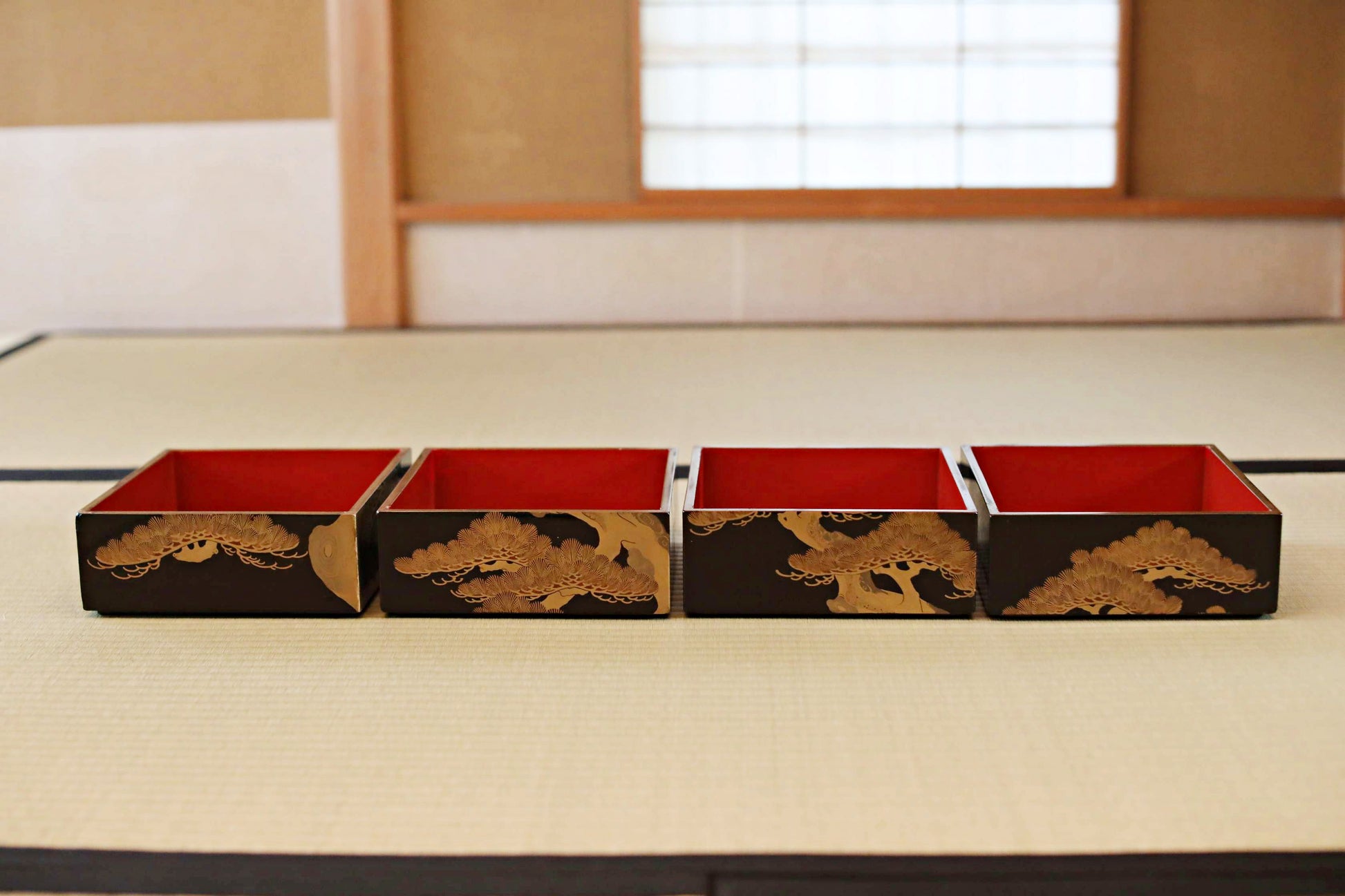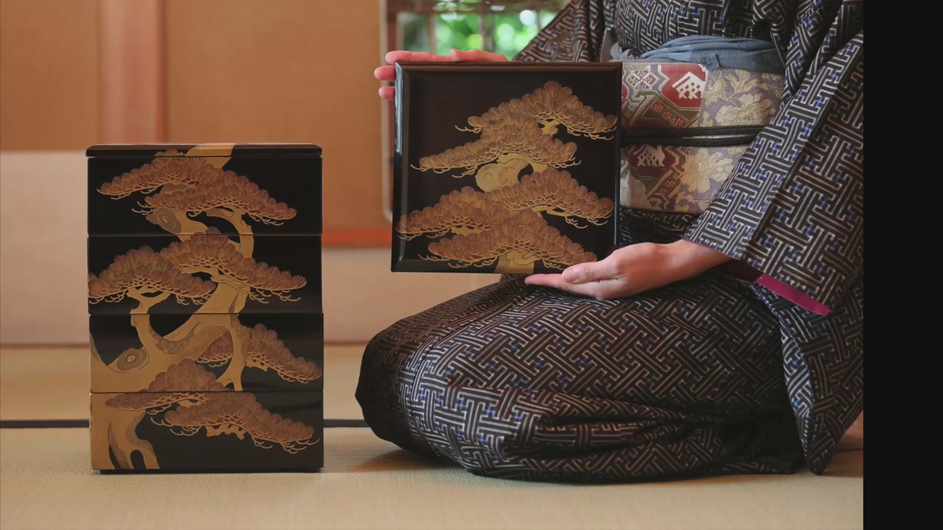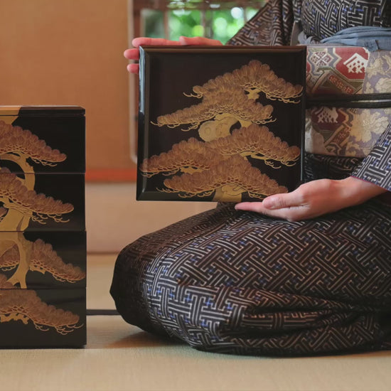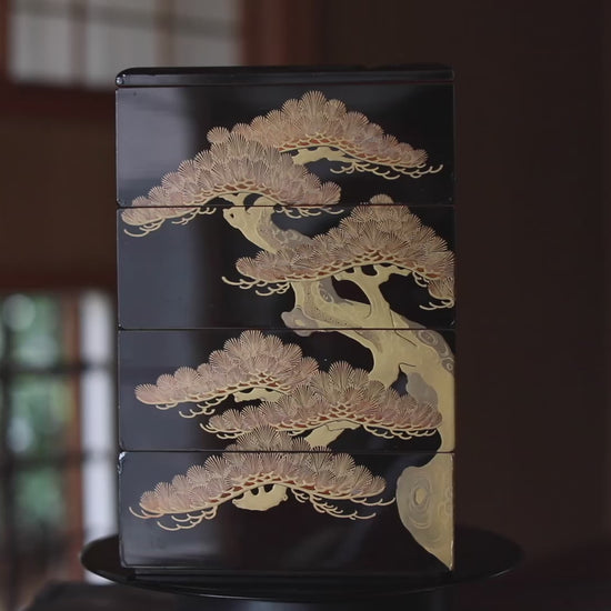 The traditionally deformed form of the pine is finely drawn using the makie (gold lacquer) and raden (mother-of-pearl inlay) techniques. A dynamic pine design is painted on each of the four sides, but the design on one side connects seamlessly with the pine motif on the lid. Upon opening the lid, the interior is revealed to be coated in a vibrant red lacquer, which dramatically enhances the visual splendor of the contents.