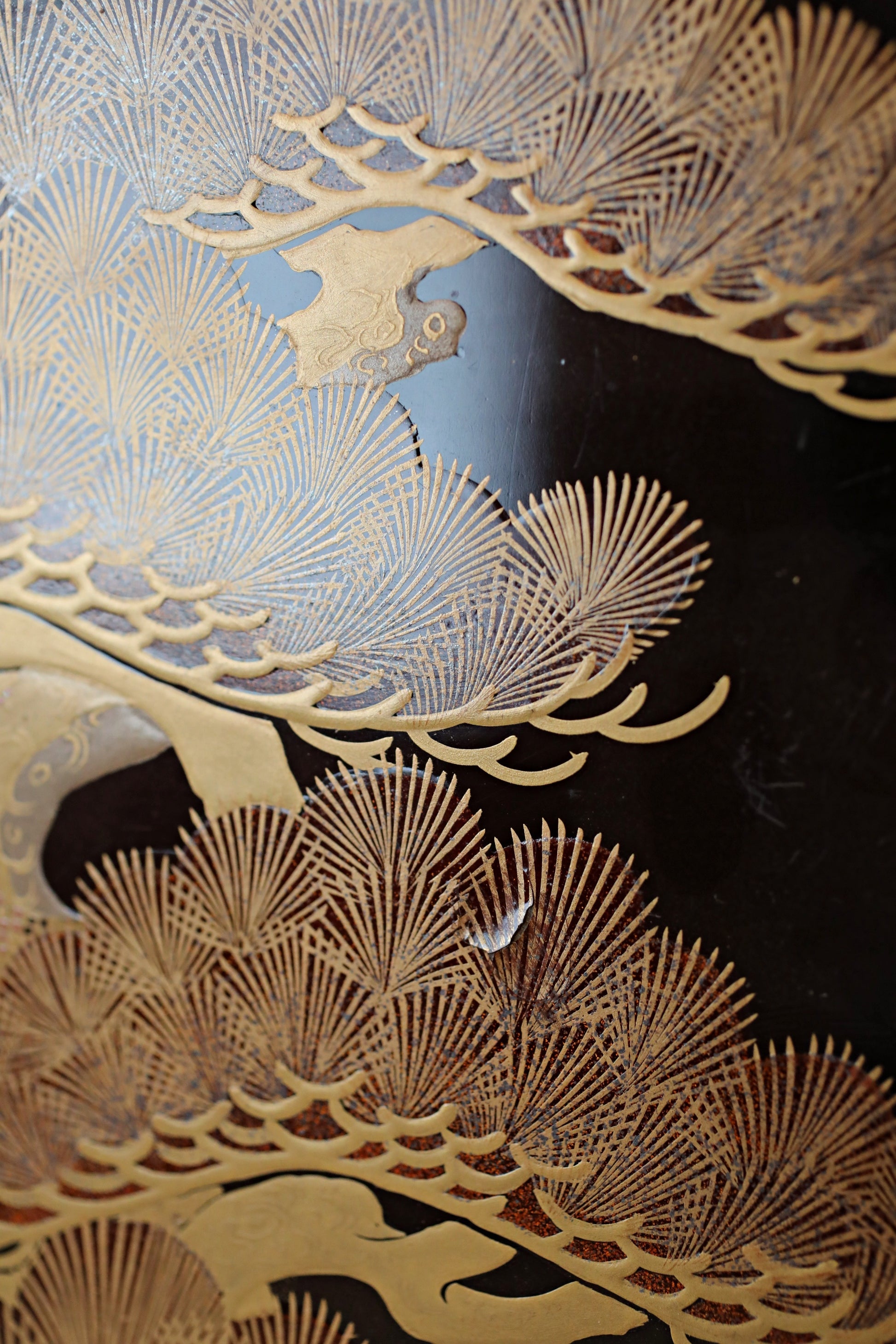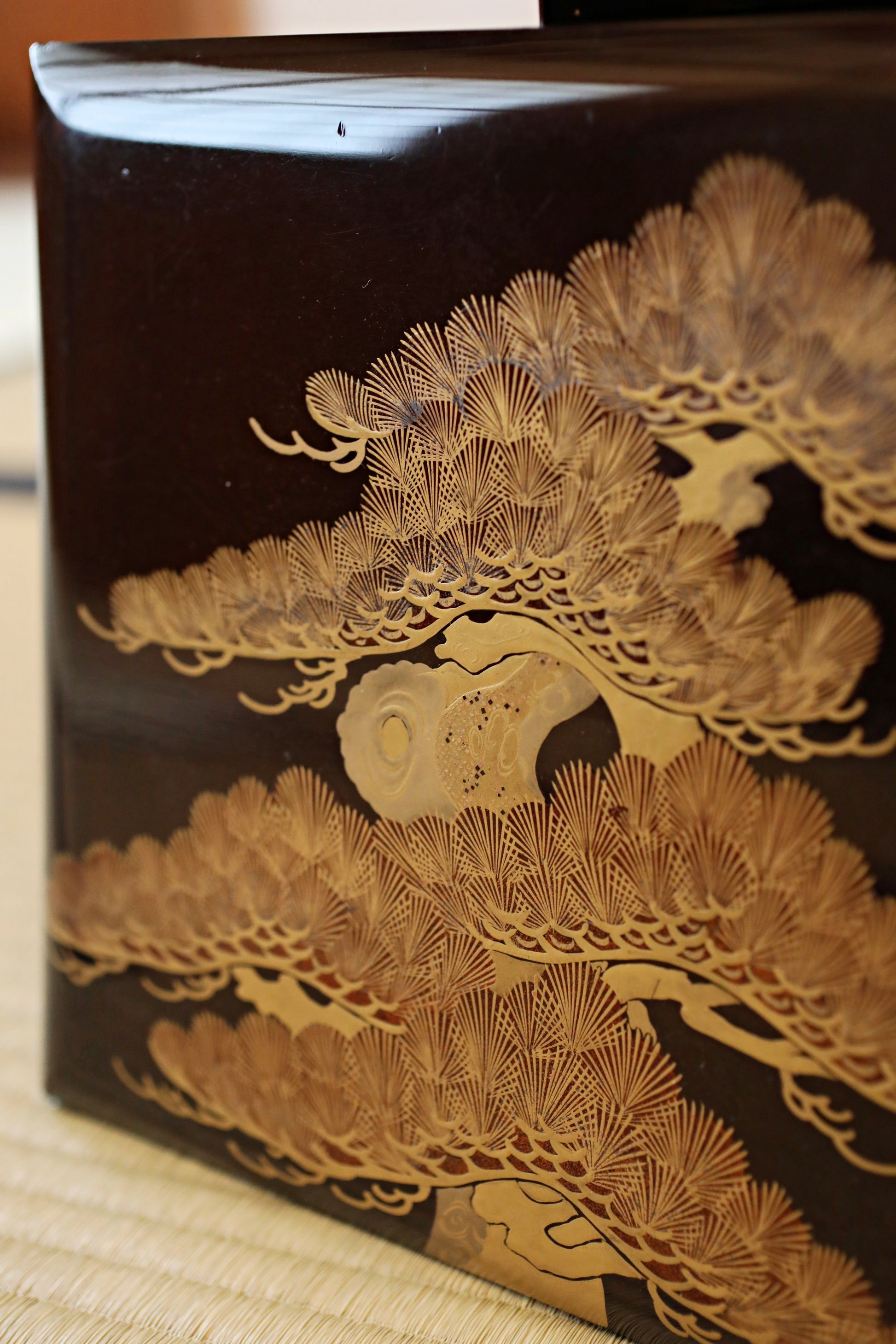 The overall motif of the box is an old pine tree which is a highly revered symbol in art and landscaping, conveying deep philosophical meaning. The pine's primary symbolism is longevity and endurance. Being an evergreen, its needles stay green through winter, symbolizing eternal youth and resilience. An old pine with a weathered, gnarled trunk and stretching branches embodies profound dignity and nobility. Having stood for centuries, it signifies an unchanging spiritual foundation in traditional arts such as Noh, Sumi-e, gardens.