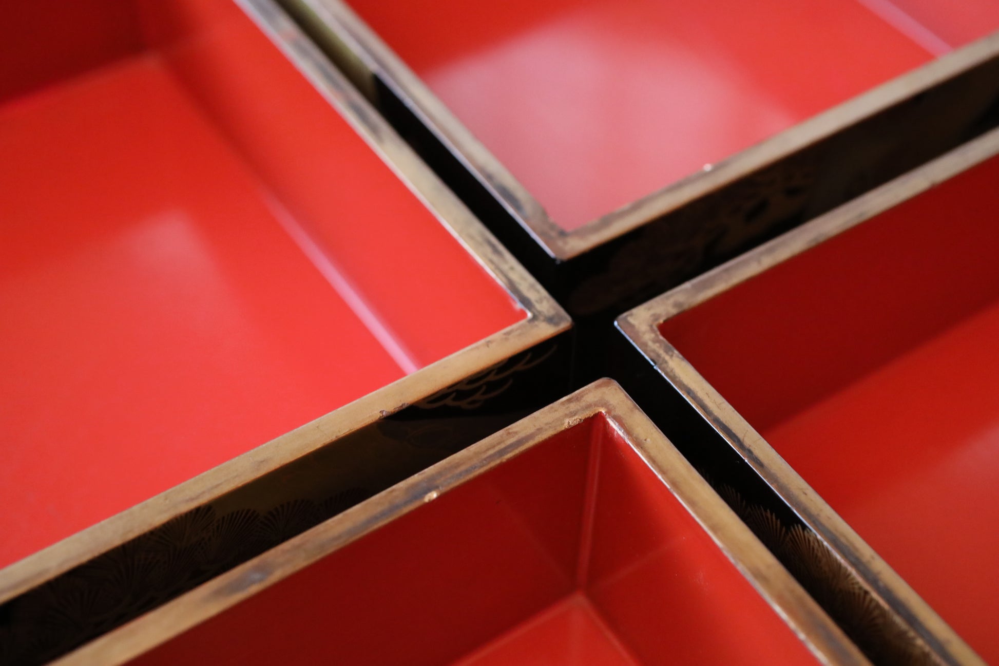 It is said that the 重箱jubako first appeared in the Muromachi period (1333-1573), but it was not until the Edo period (1603-1868) that it became commonplace. In particular, samurai families and feudal lords used to carry dishes in maki-e lacquer-work stacked boxes when they went "hunting" or "cherry blossom viewing. Therefore, the quality of maki-e on these old stacked boxes is very high, and you will be surprised at the delicacy of the maki-e when you see them up close.