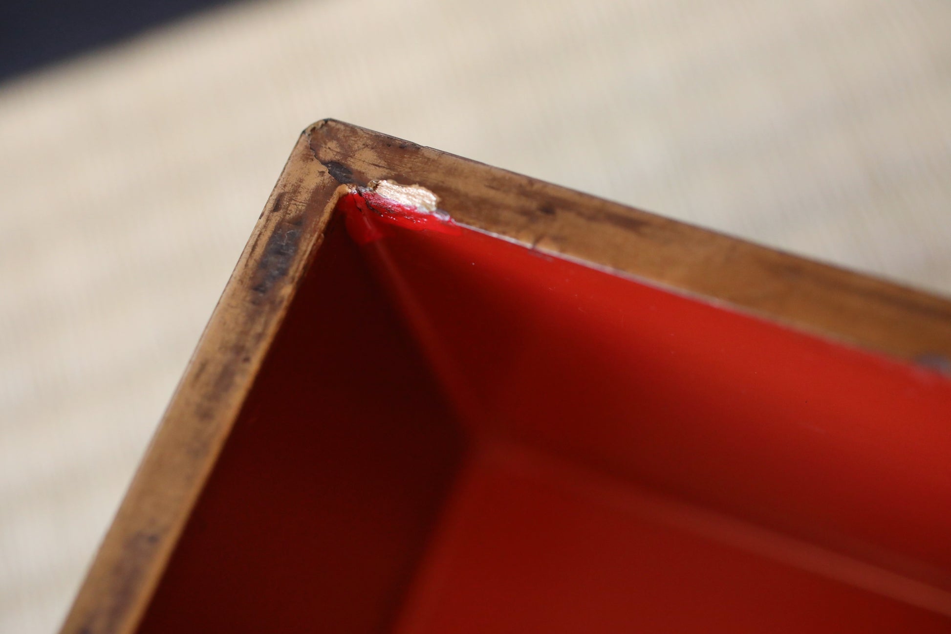 It is overall in good condition. However, there are several areas that have been restored or where the lacquer has peeled off.