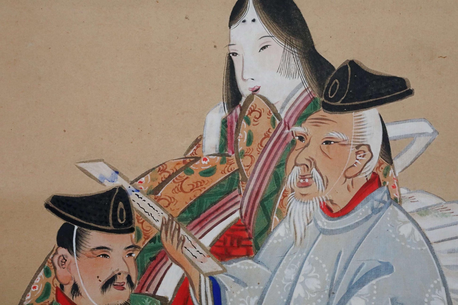 This is a portrait depicting three nobles enjoying a poetry contest, a popular pastime among Heian period aristocrats. The painting is filled with a cheerful atmosphere, with all three nobles wearing smiles. They seem to play "Renga" , a genre of Japanese linked verse, in which two or more poets collaborate to create a longer poem.