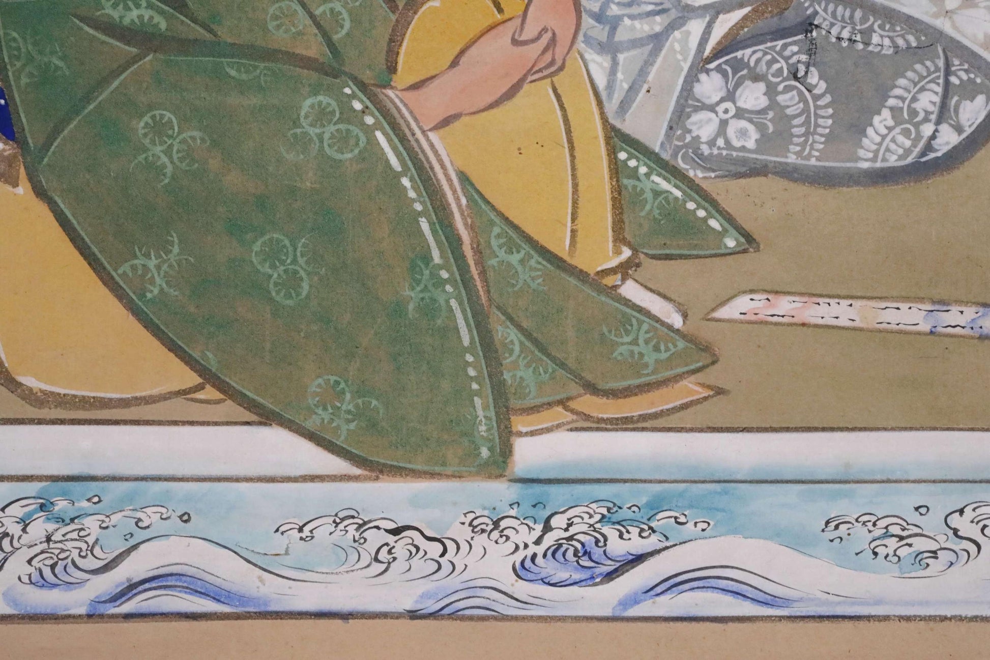 A short poem slip with the first verse is placed on the tatami mat, and a young man is reciting it, while an older man seems to be responding with the second verse. Judging from everyone's laughter, it's possible the young man recited a love poem to a young woman, and before she could reply with the second verse, the older man quickly added his own, teasing the young man.