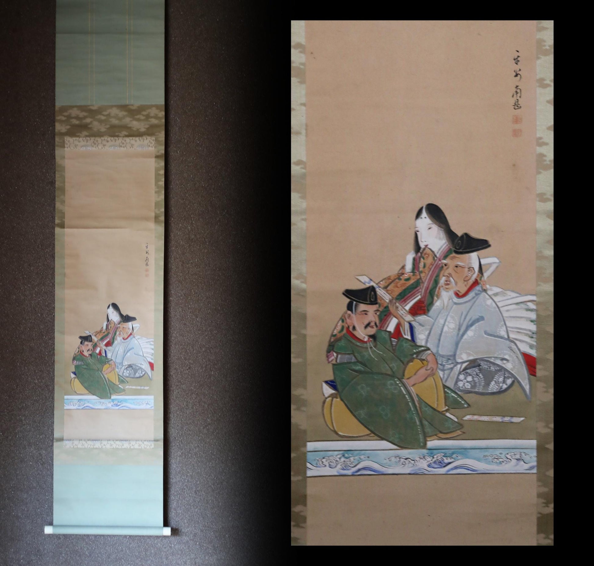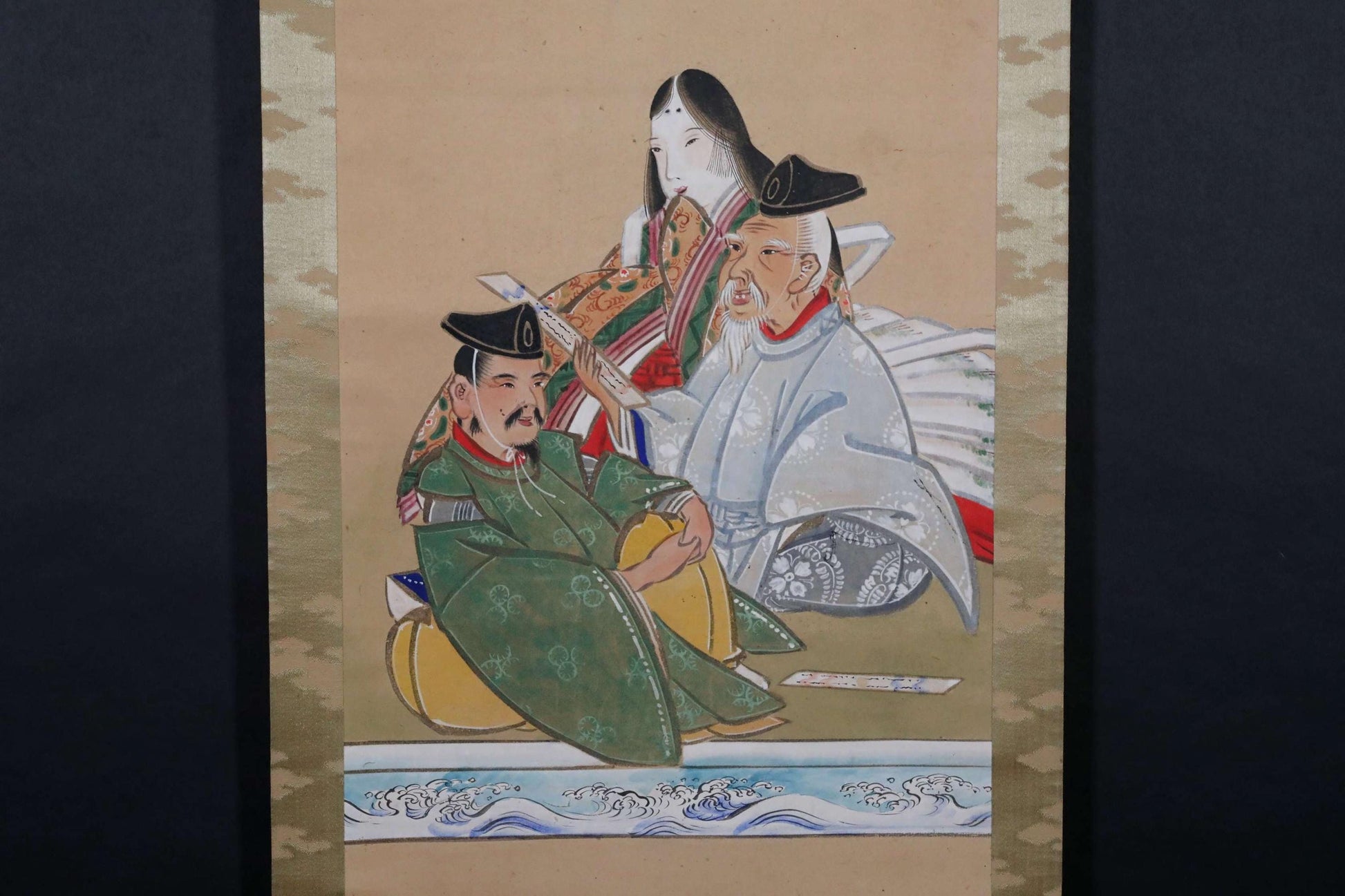 Japanese antique watercolor painting scroll of three nobles by Nangaku imitation, KAKEJIKU with BOX in 1900s Kanji signature H72in/H183cm