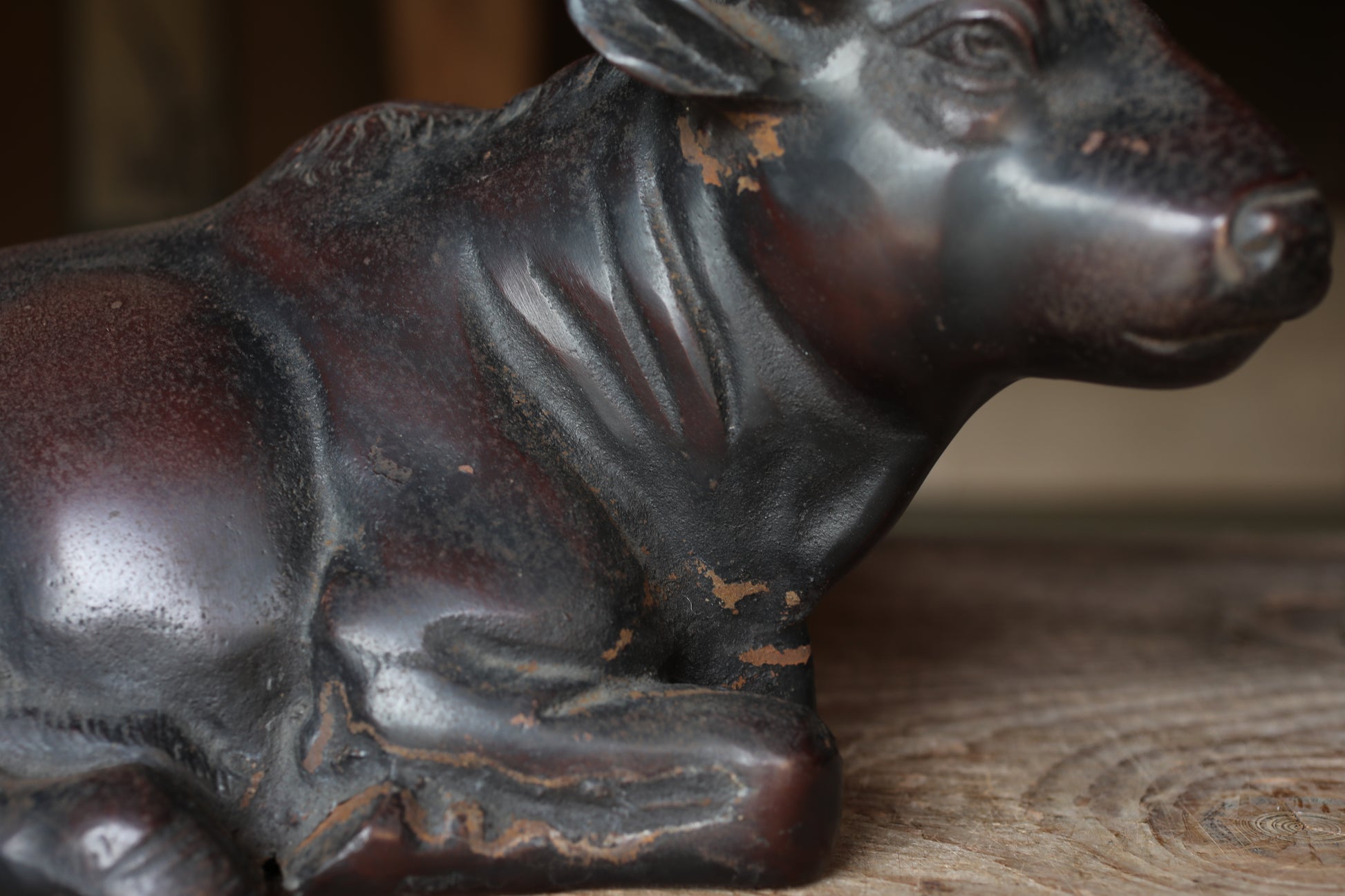 This vintage piece is rare not only for its impressive size (over 16 inches wide) but also for its profound presence. The heavy, cool touch of the cast iron and its serene posture create an atmosphere of absolute calm. Whether placed in a restaurant, a business entrance for good fortune, or a home garden as a centerpiece, this "Guardian Cow" stands as a timeless symbol of stability and well-being.