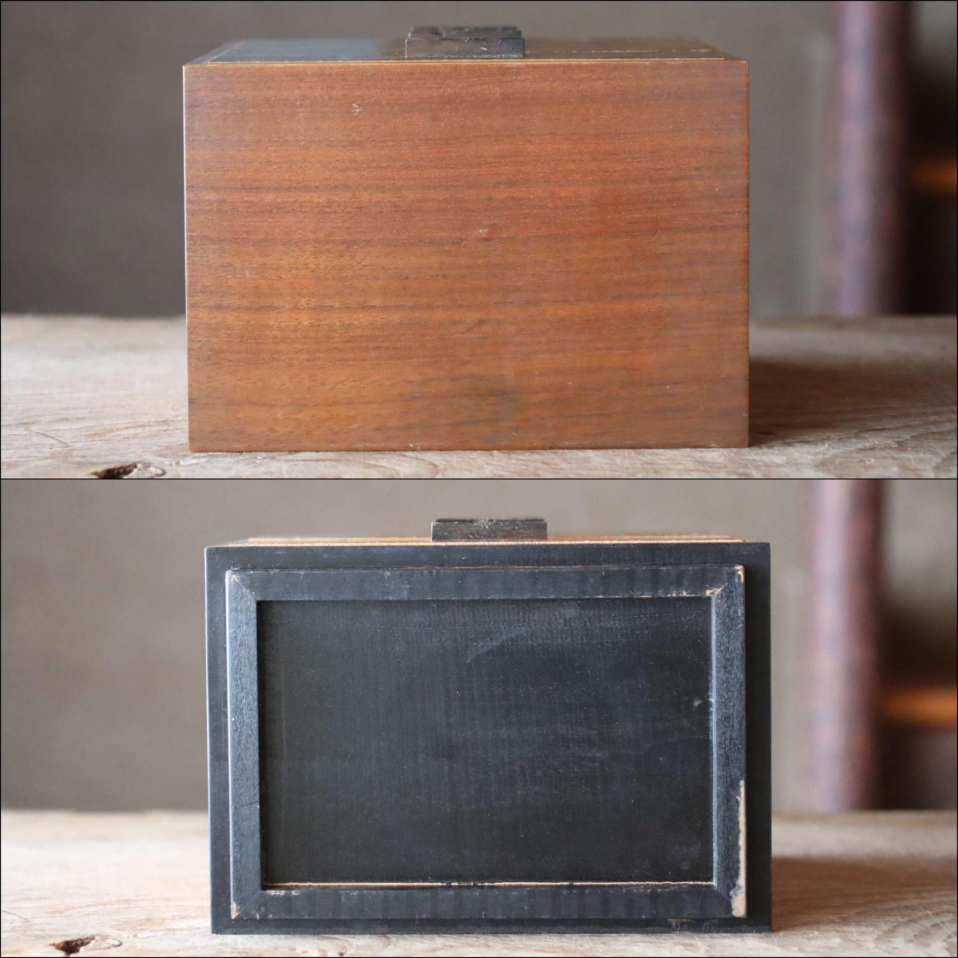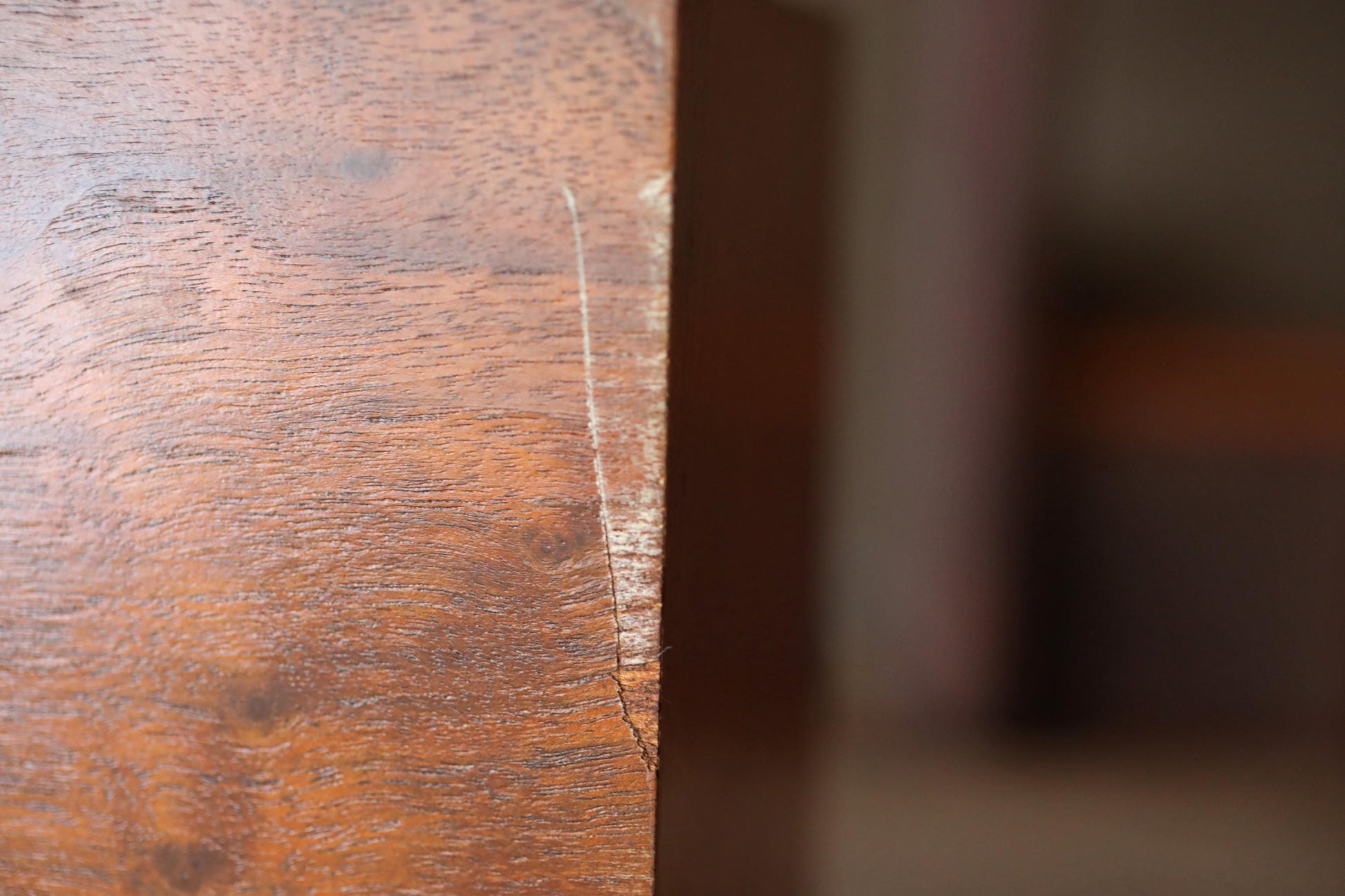 It is in very good condition, but there are small scratches and dirt due to aging. It's ready to use. There are scratches on the back side and some peeling on the surface, but it is usable. The inside of the drawer is lined with felt.