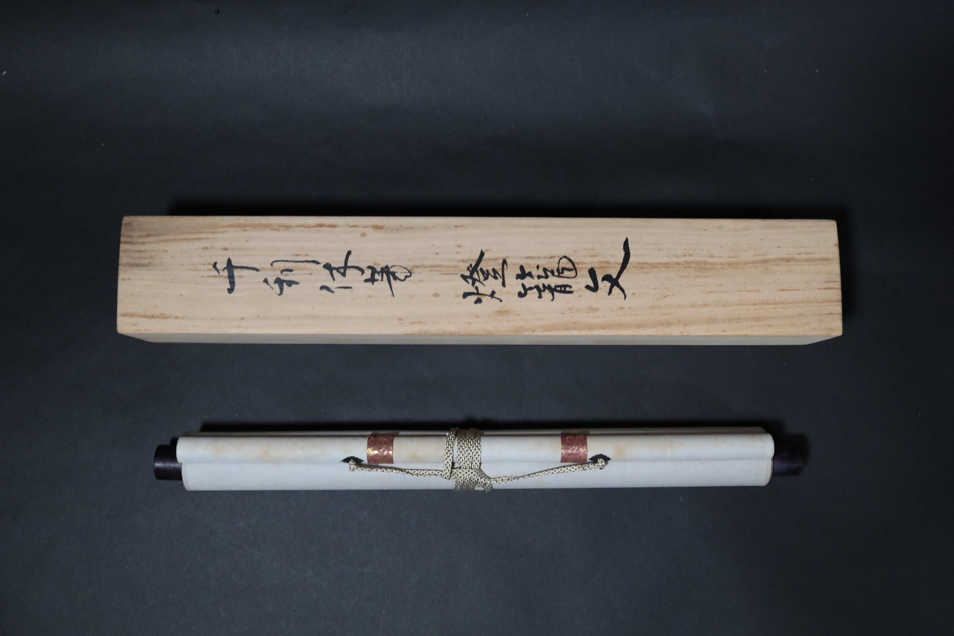 Japanese hanging scroll for tea room with Kanji calligraphy by 利休 Rikyu printed ZEN words with wooden box H42.5in/108cm.