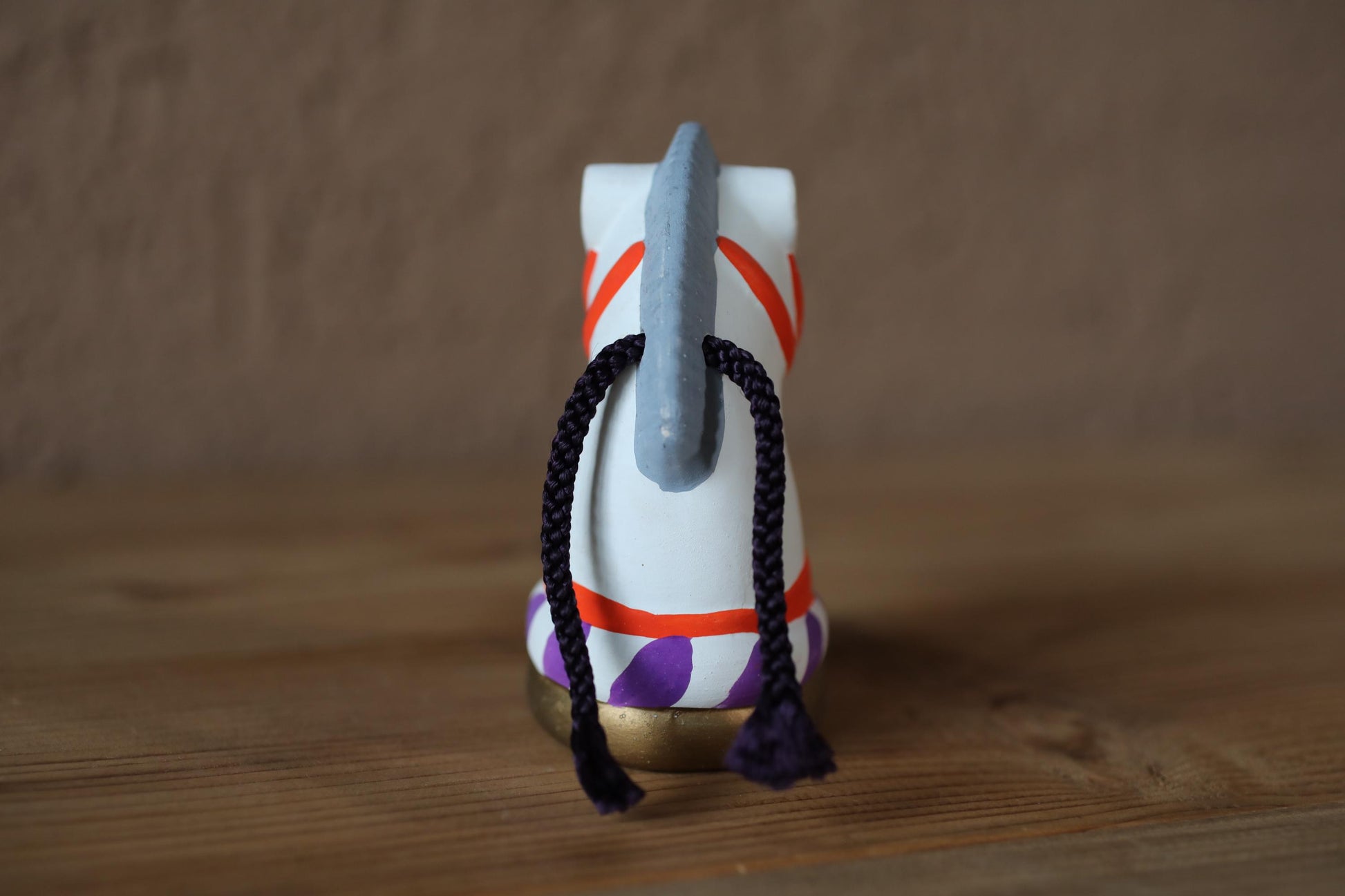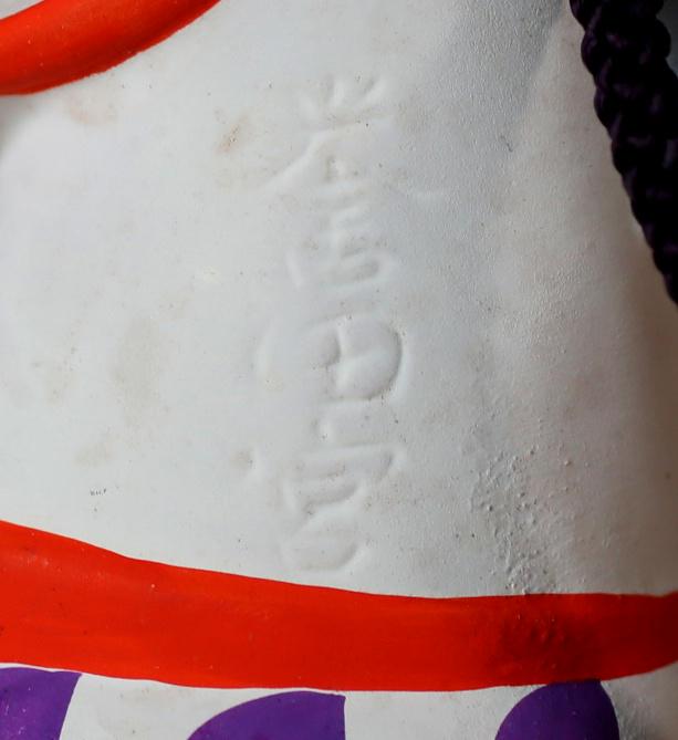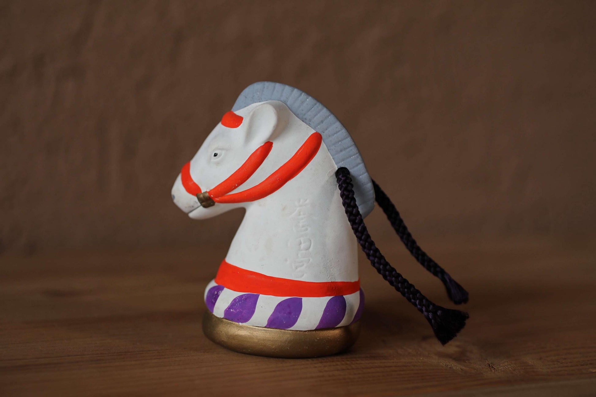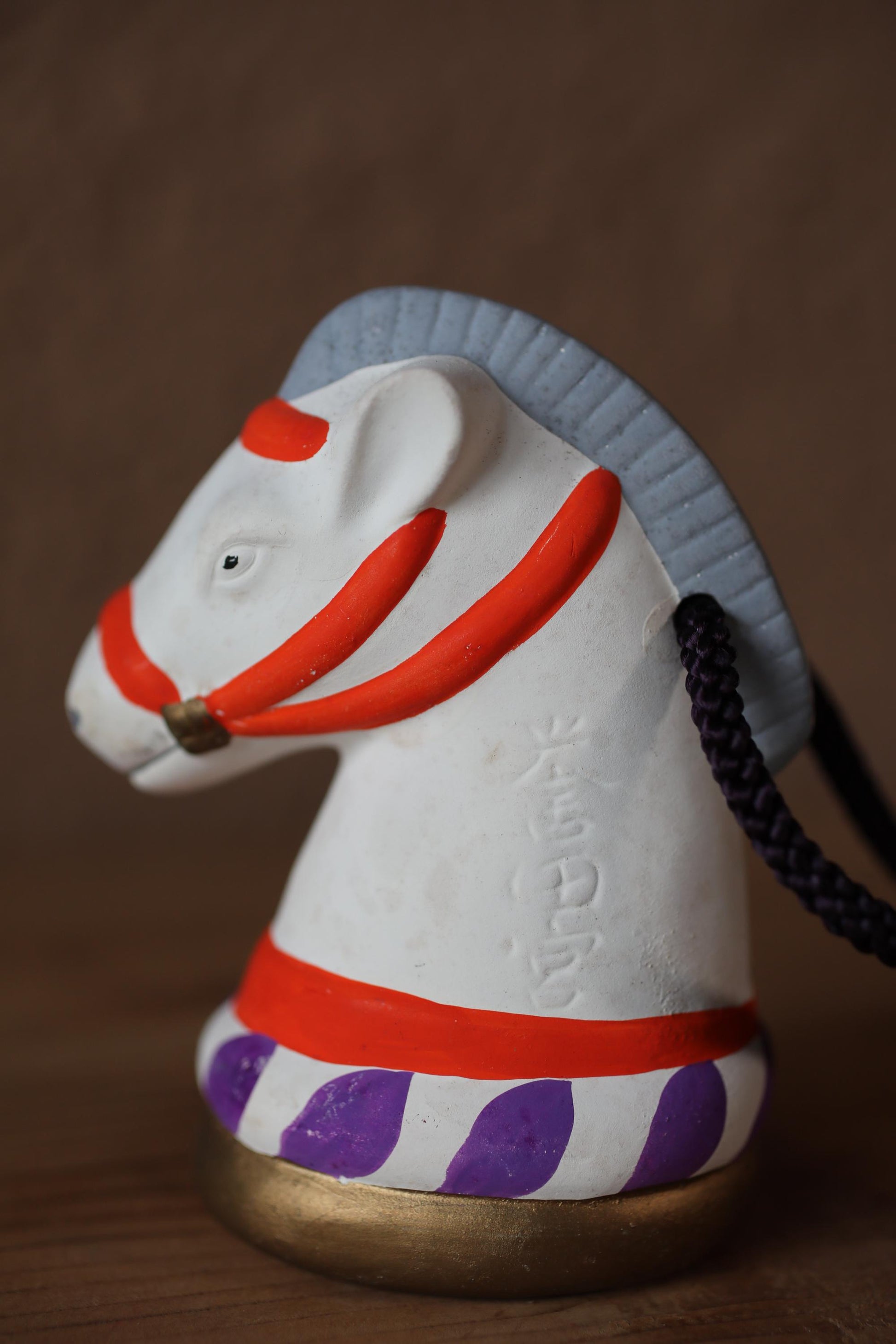 This is an amulet doll from a historical shrine in Osaka. The motif is a white horse. The body is decorated with the name “誉田宮 Konda-miya” in relief. This means 誉田Konda- 八幡宮 Hachimangu Shrine. The shrine was built in 559, and in the Nara period (710-794), a Buddhist priest named 行基 Gyoki built a temple on the shrine grounds. The shrine is also famous for the harnesses and other items that were made using the most advanced technology of the time and stored at the shrine.