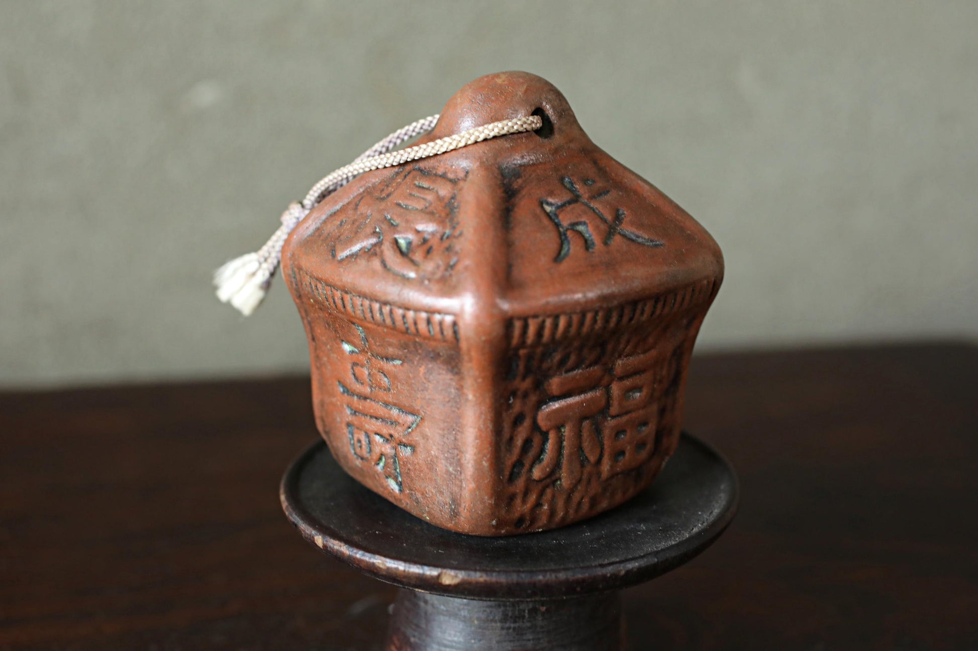 Japanese small pottery bell old house shaped amulet with Kanji Buddhist fortunate words Ornaments vintage small bell H3.9in/10cm.