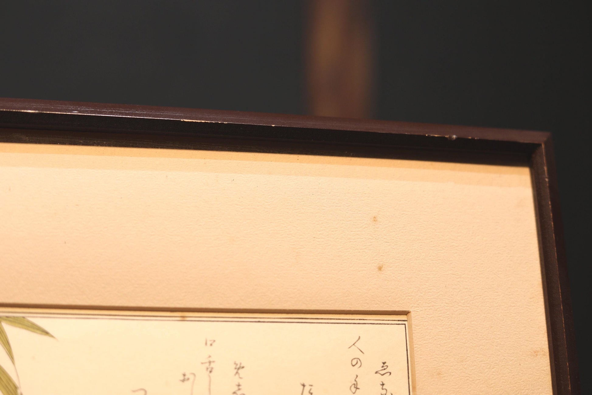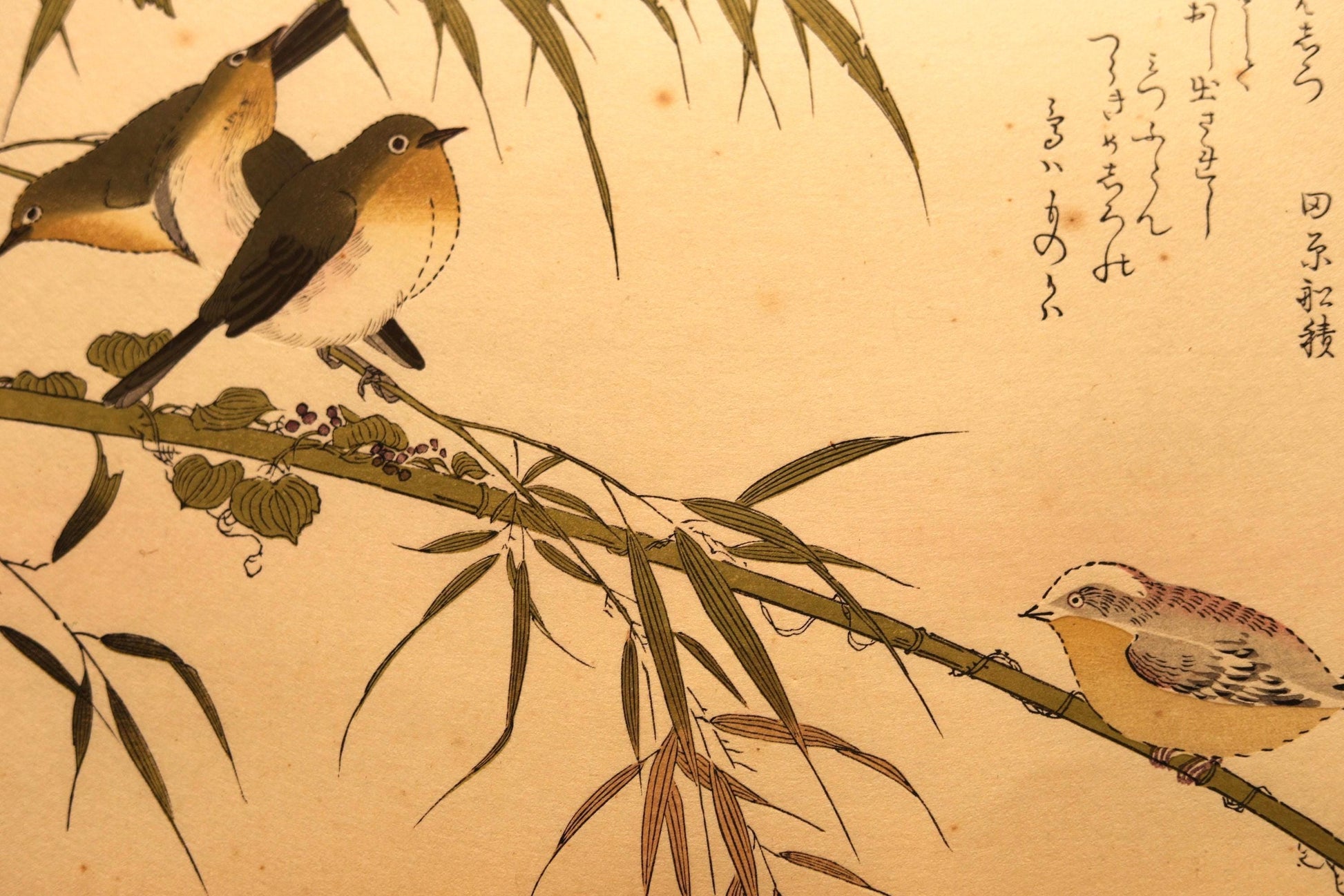 Japanese vintage art of birds white-eye, Long-tailed and Kanji calligraphy poem ,block printing with flame, wall deco picture H16.3×W21.1in
