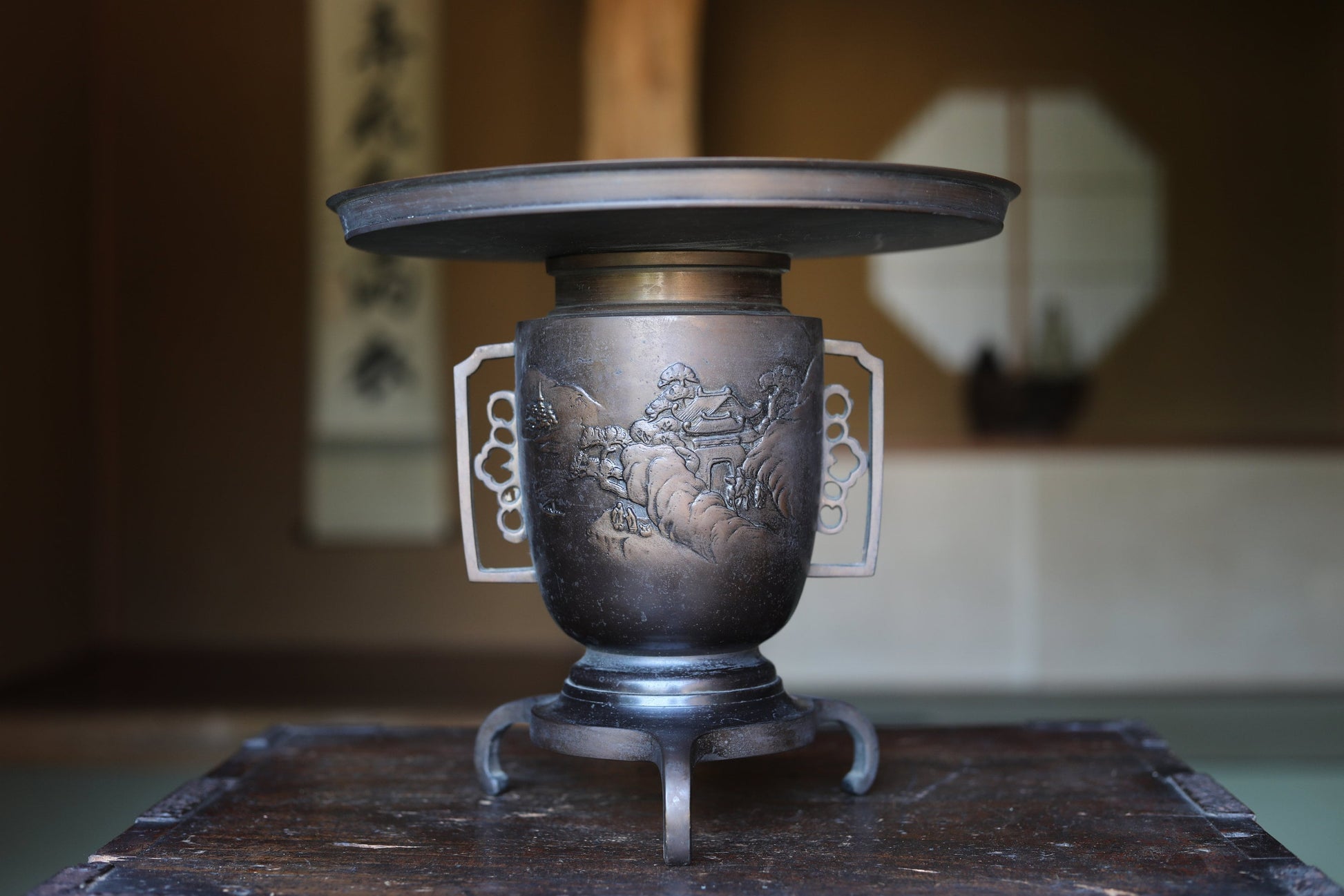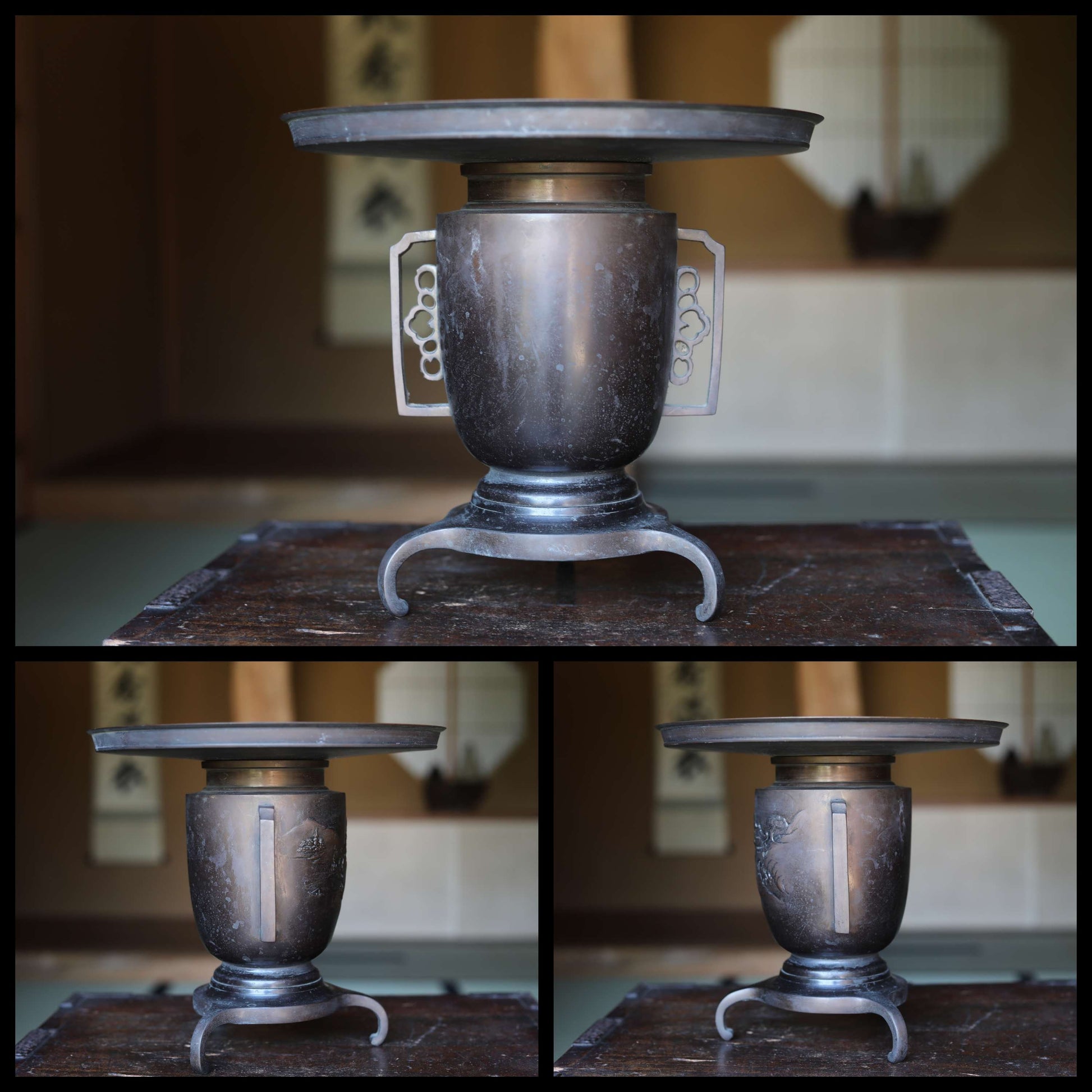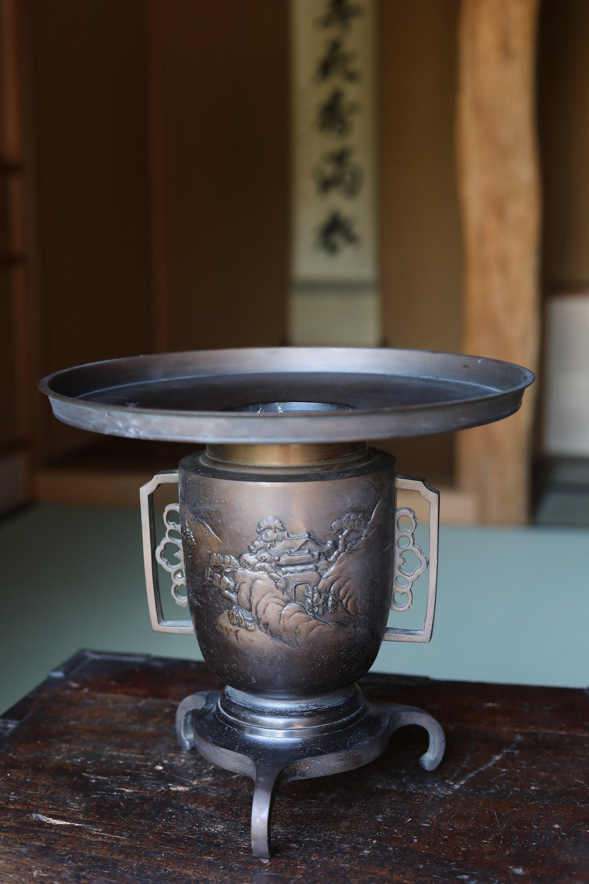 A vase of this shape is called a Usu-bata薄端. One of the metal vases introduced from China in the Muromachi period (1336-1573). The body of the vase has a wide, shallow upper plate, and the center opening can be removed. It is used in the Ikenobo and Koryu schools of ikebana.