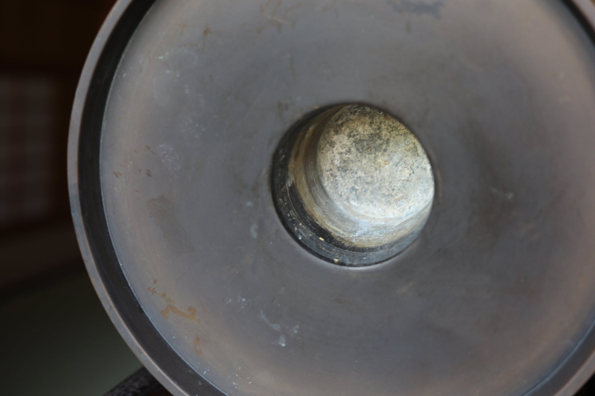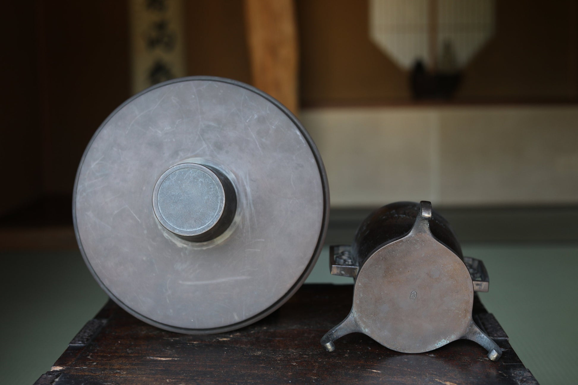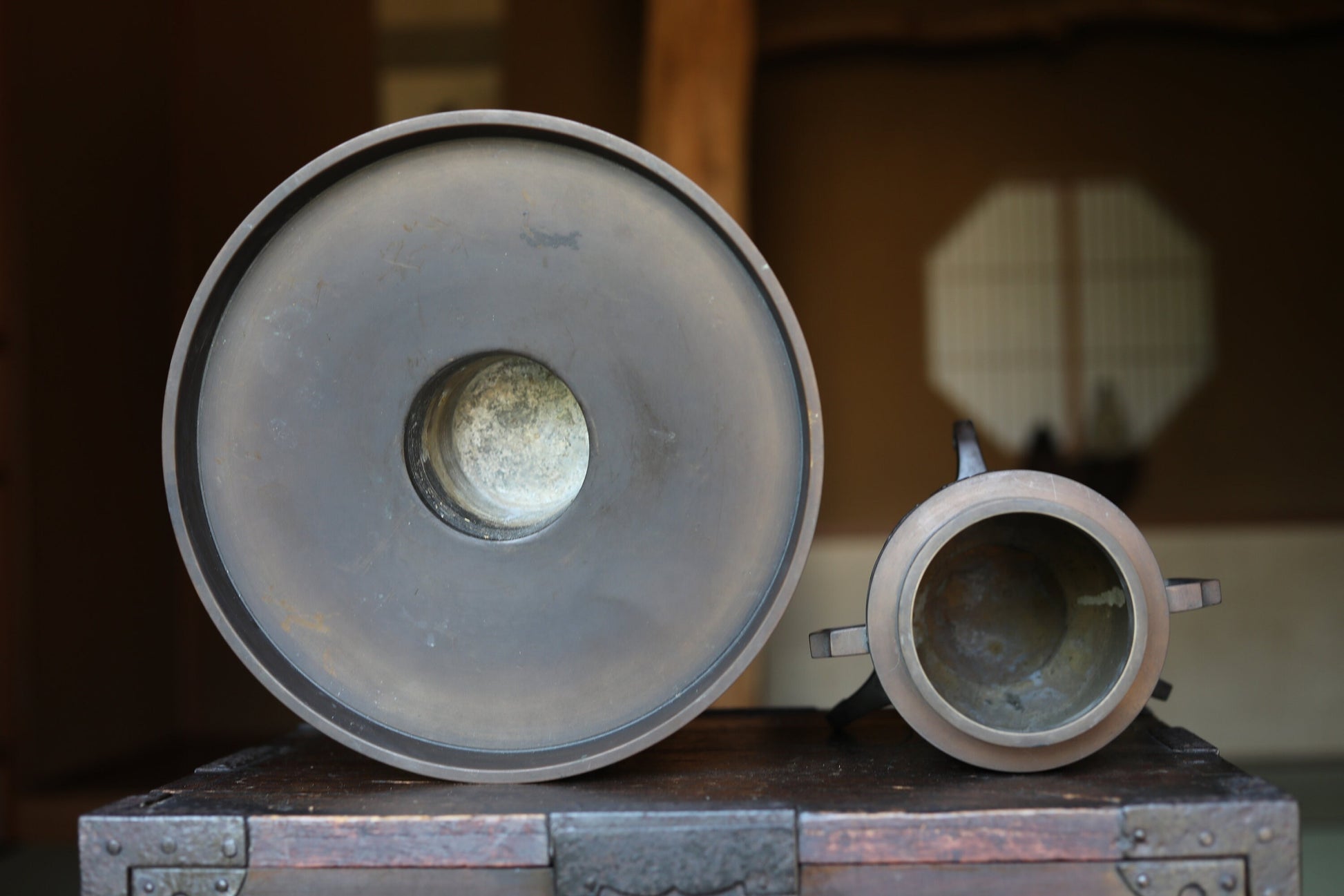 A vase of this shape is called a Usu-bata薄端. One of the metal vases introduced from China in the Muromachi period (1336-1573). The body of the vase has a wide, shallow upper plate, and the center opening can be removed. It is used in the Ikenobo and Koryu schools of ikebana.