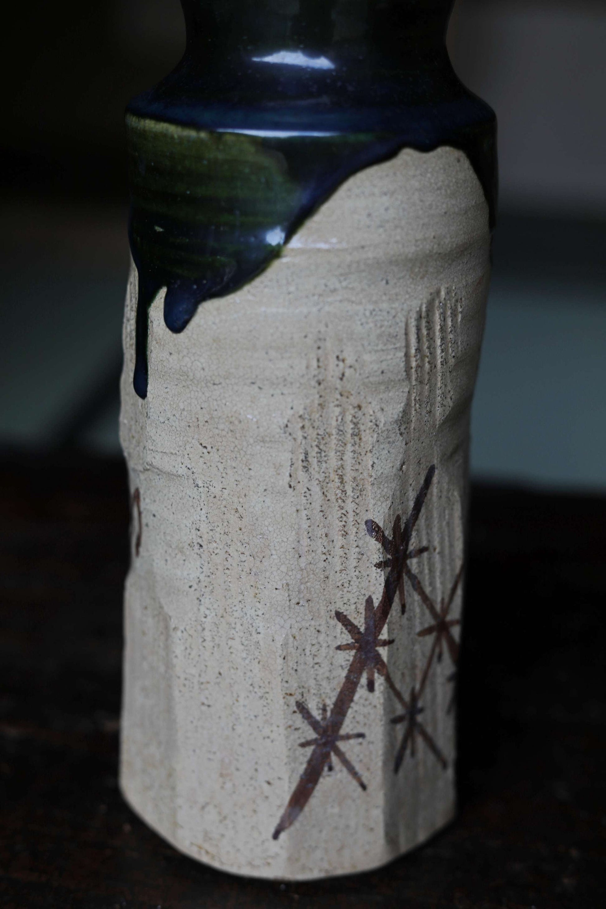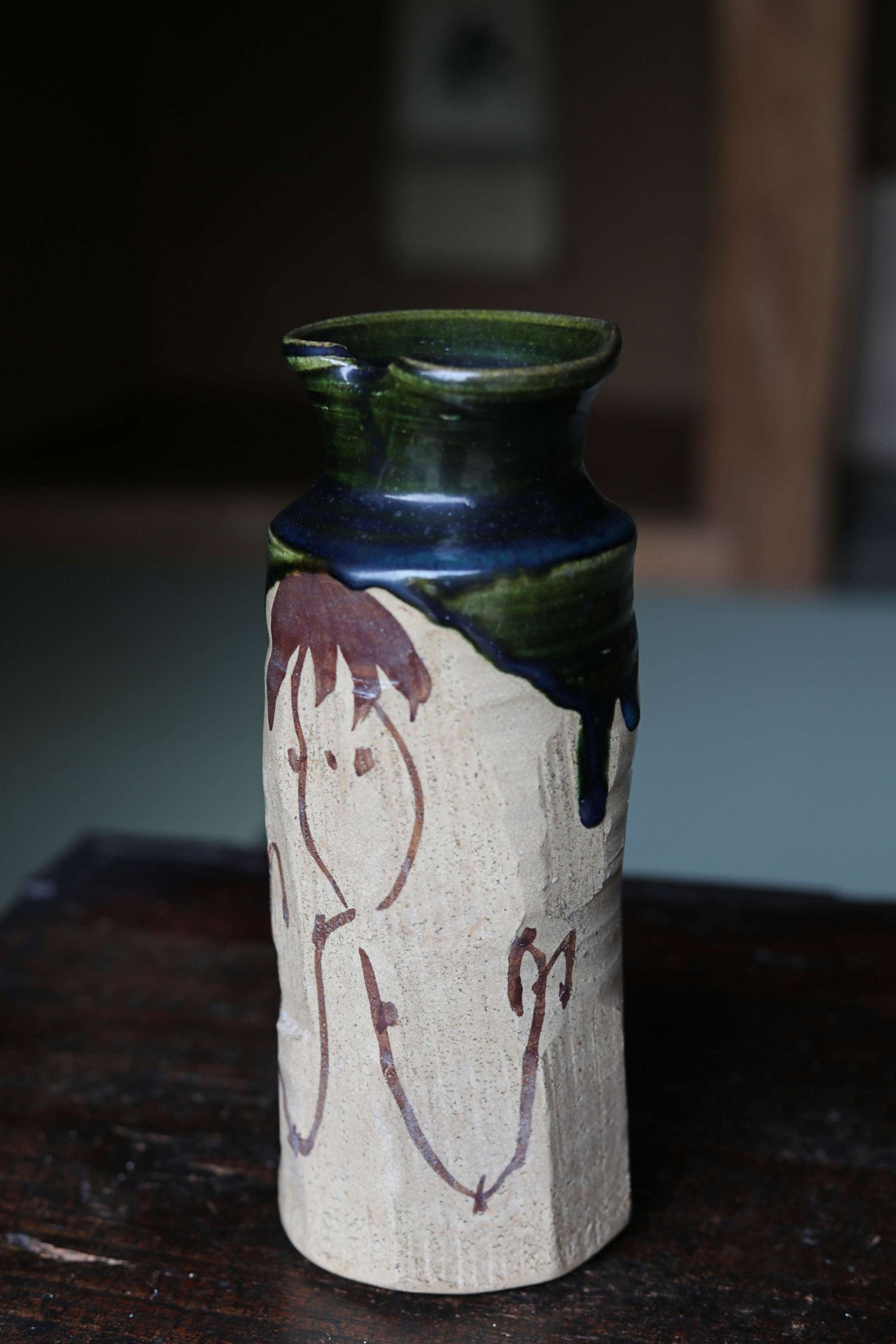 Japanese vintage ceramic flower vase jar hand made ORIBE ware dark green color IKEBANA with box For GIFT H9.3×3.5in/H23.5×9cm