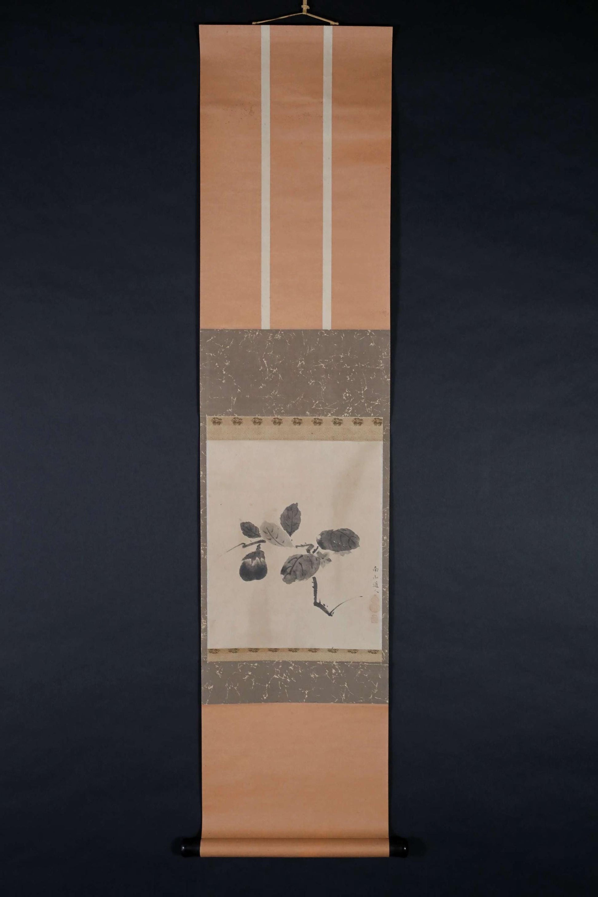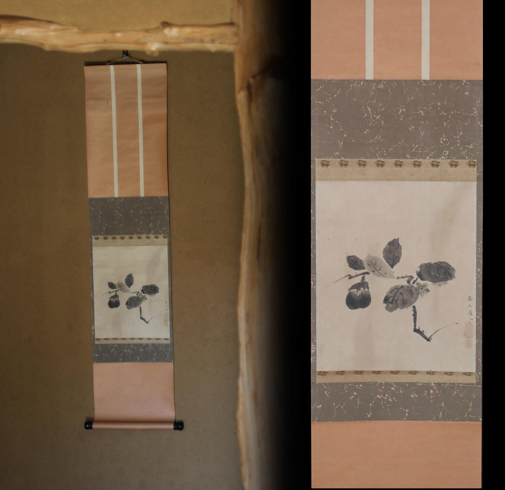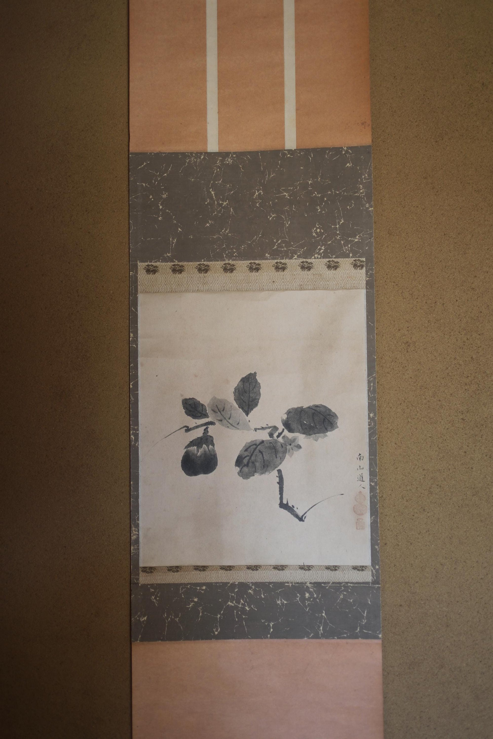 Japanese vintage hanging scroll for tea room Ink painting of eggplant with sign by buddhist monk sign box reproduction H45.7in/116cm