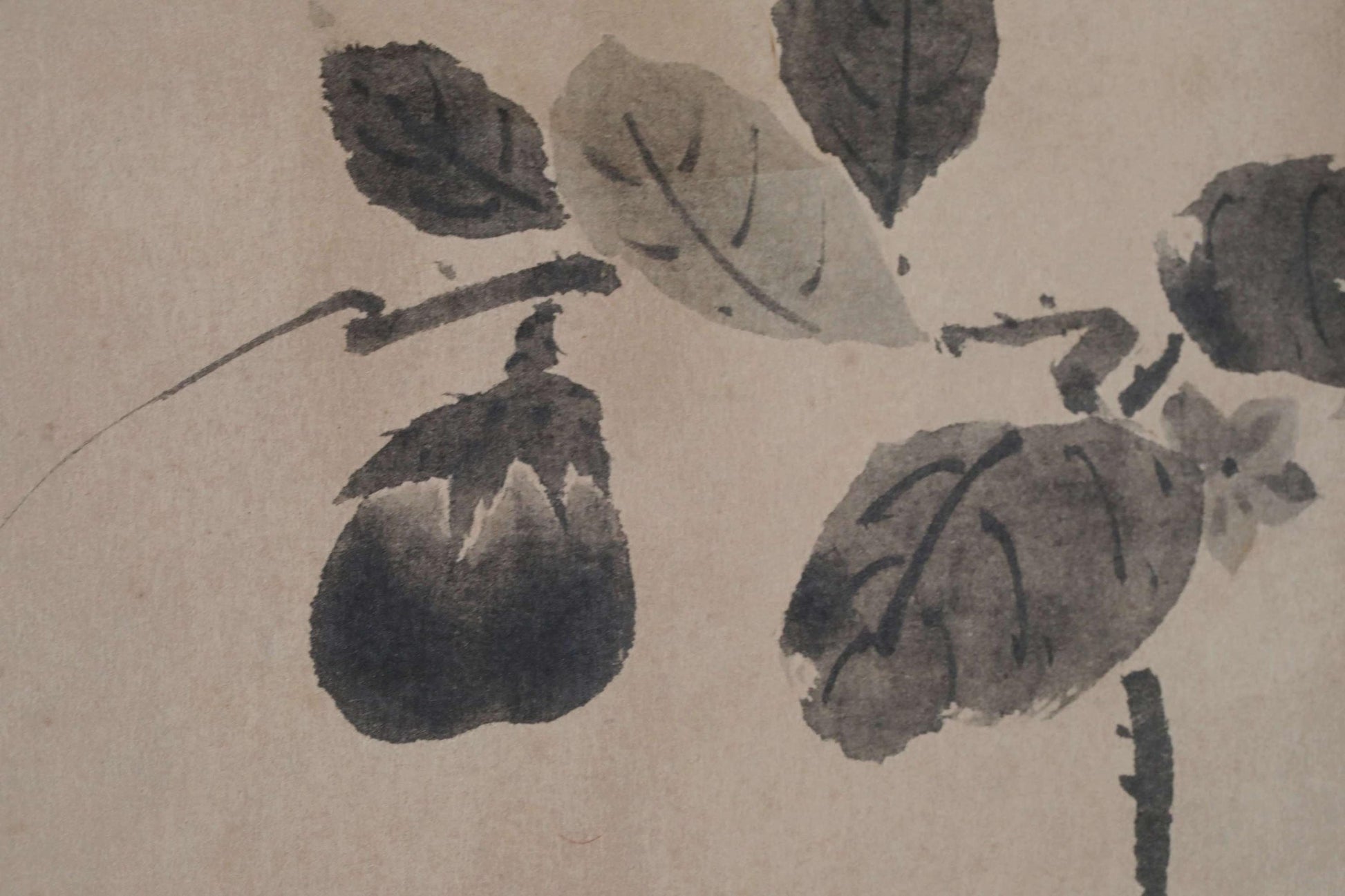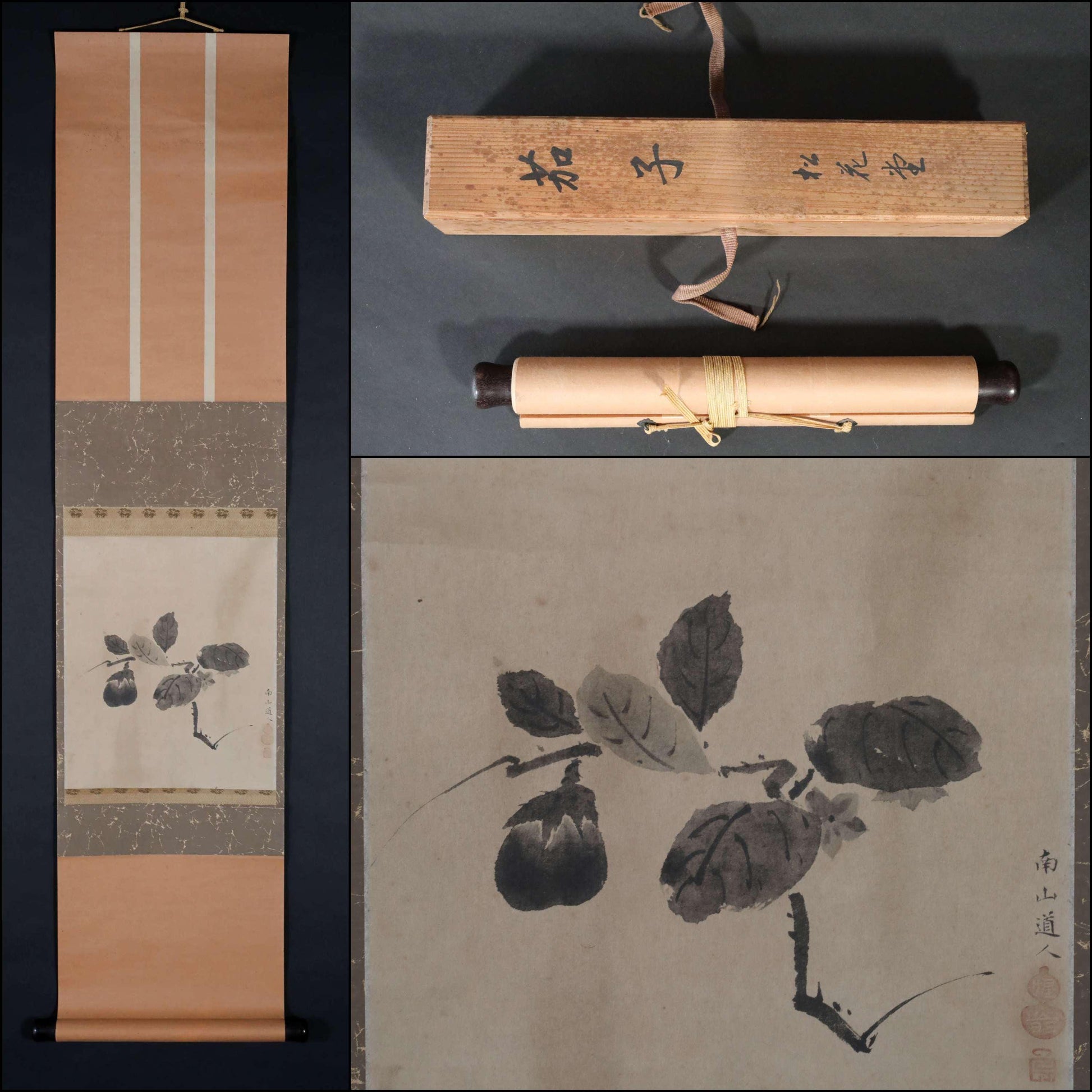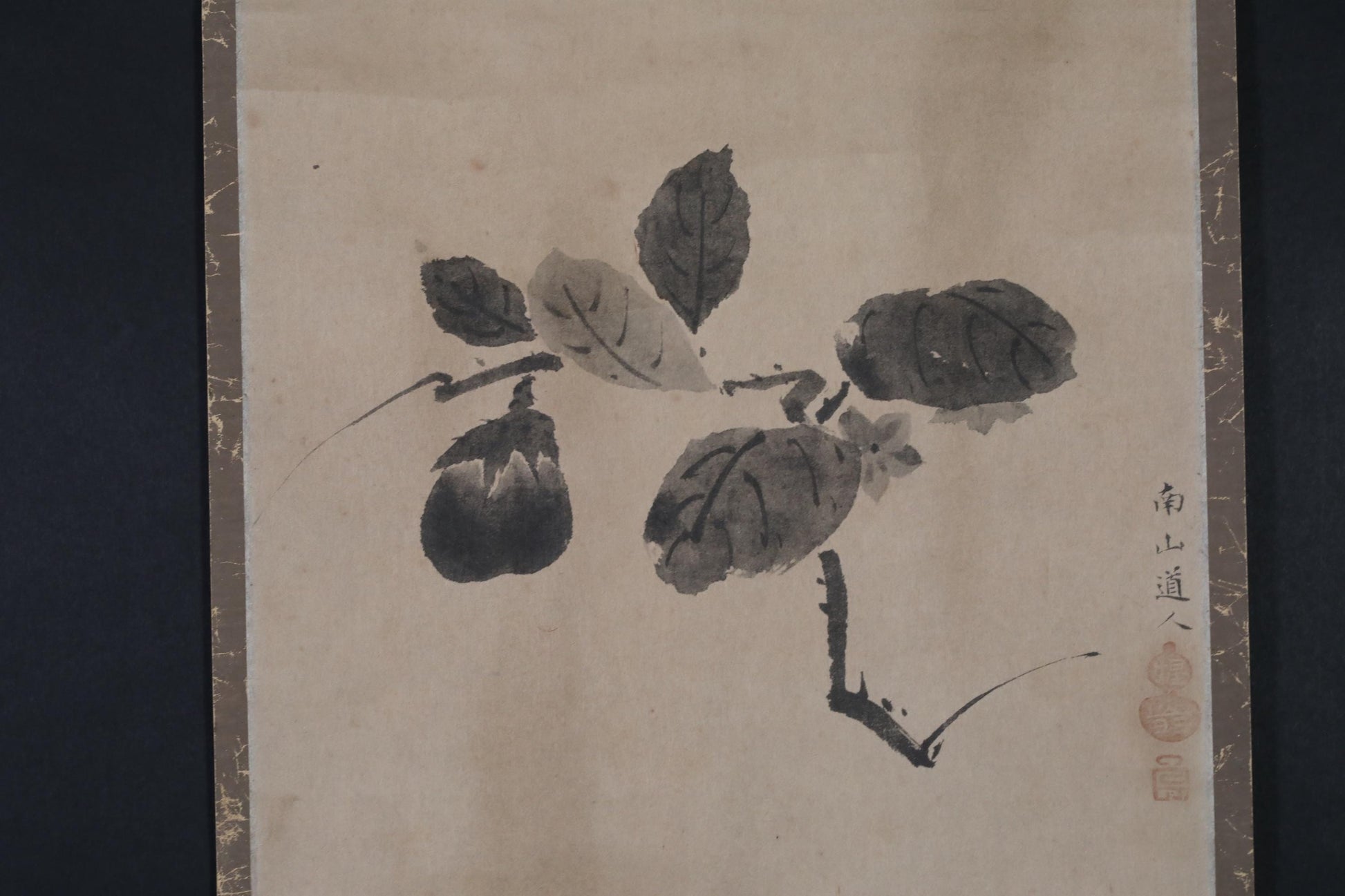 Japanese vintage hanging scroll for tea room Ink painting of eggplant with sign by buddhist monk sign box reproduction H45.7in/116cm