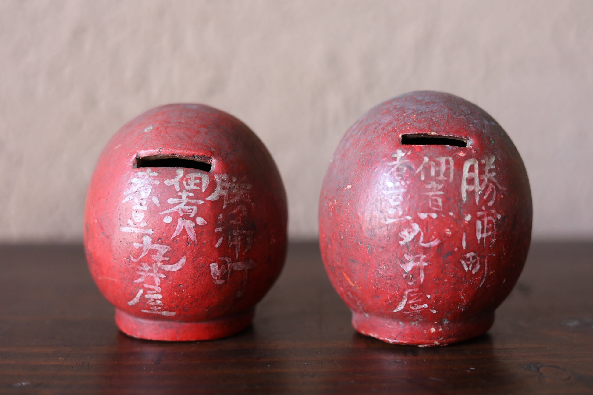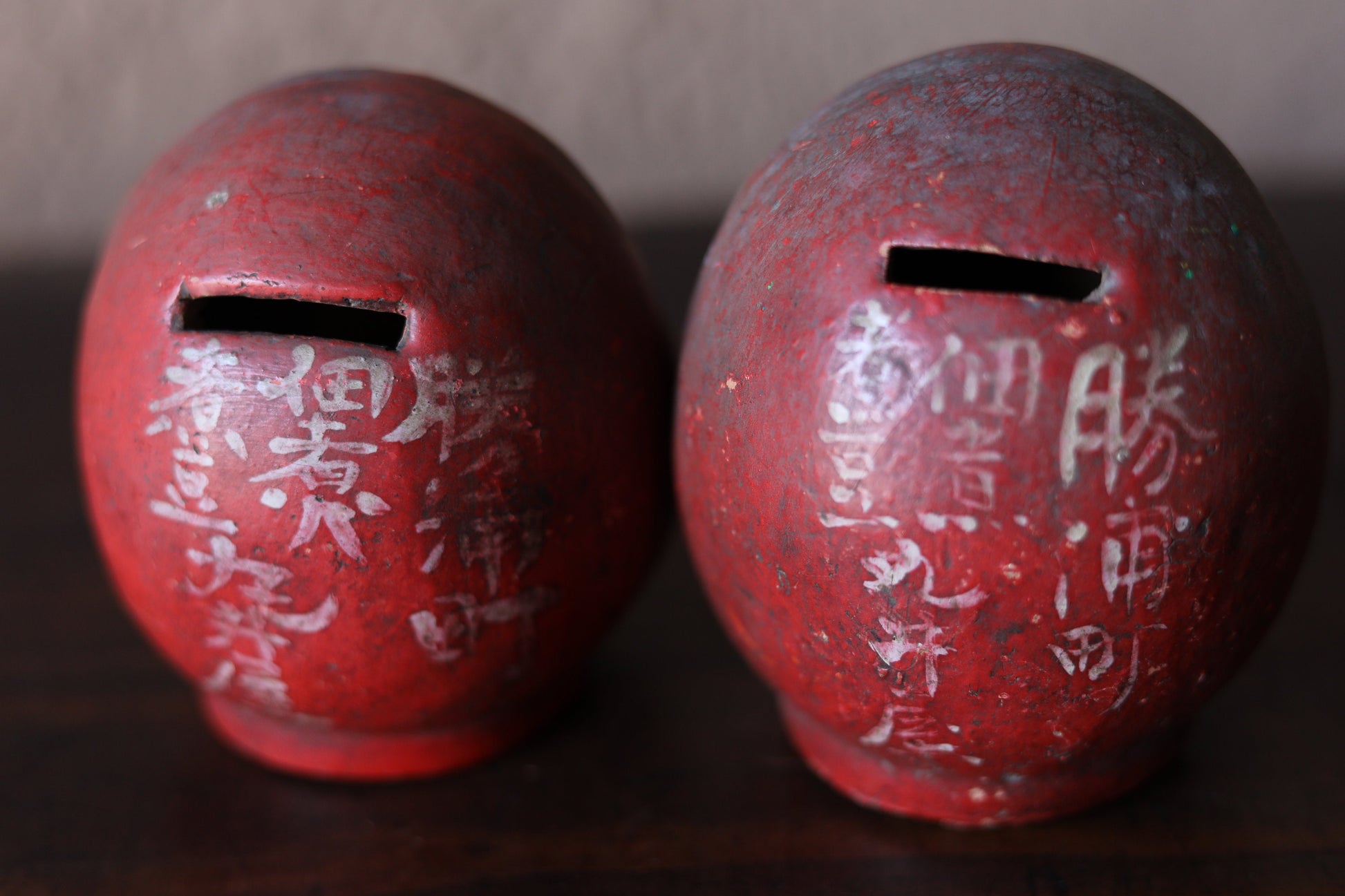 Pair of Japanese vintage "Daruma" doll statue, ceramic statue Buddhist monk priest ZEN master bank box H4.1in/H10.5cm.