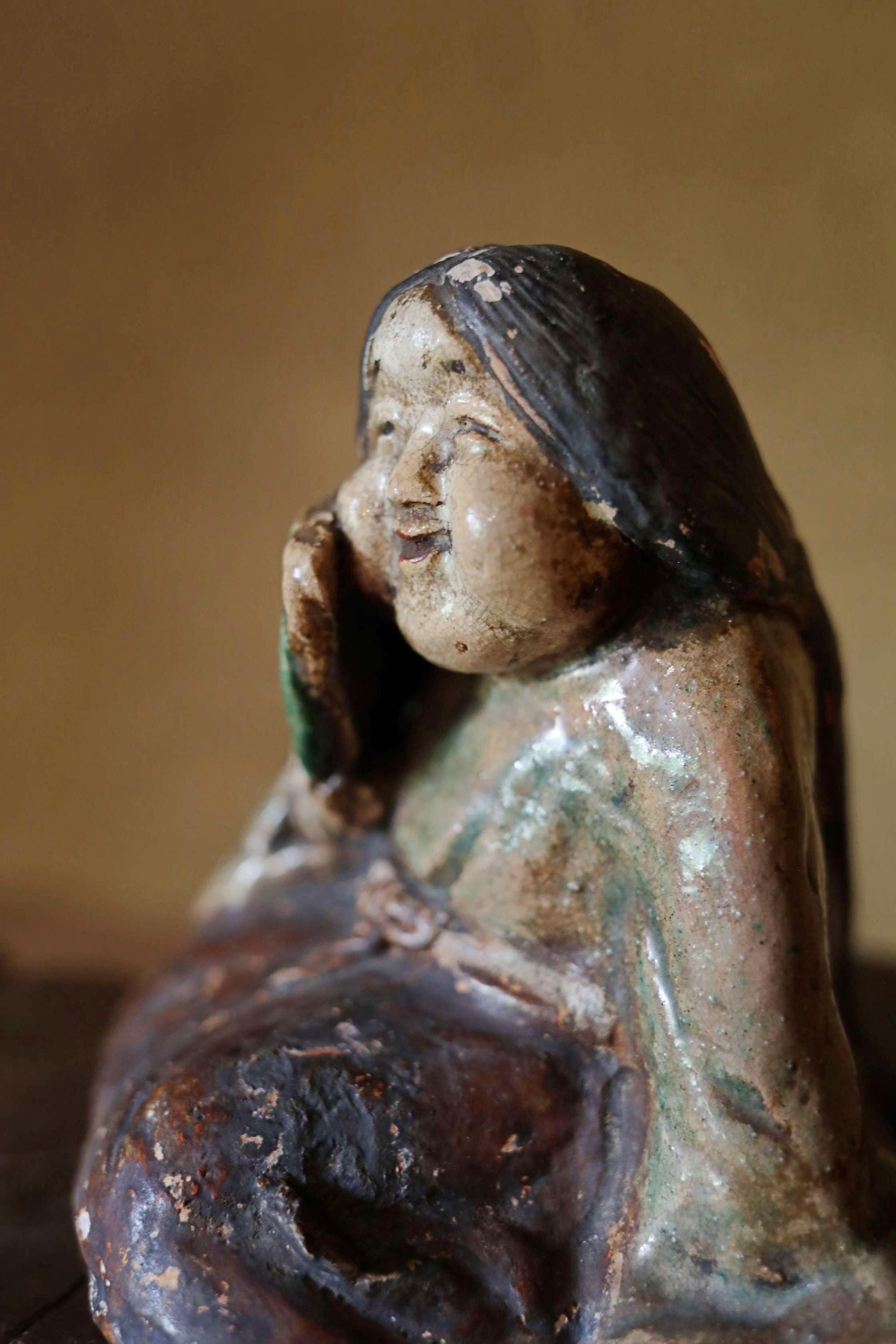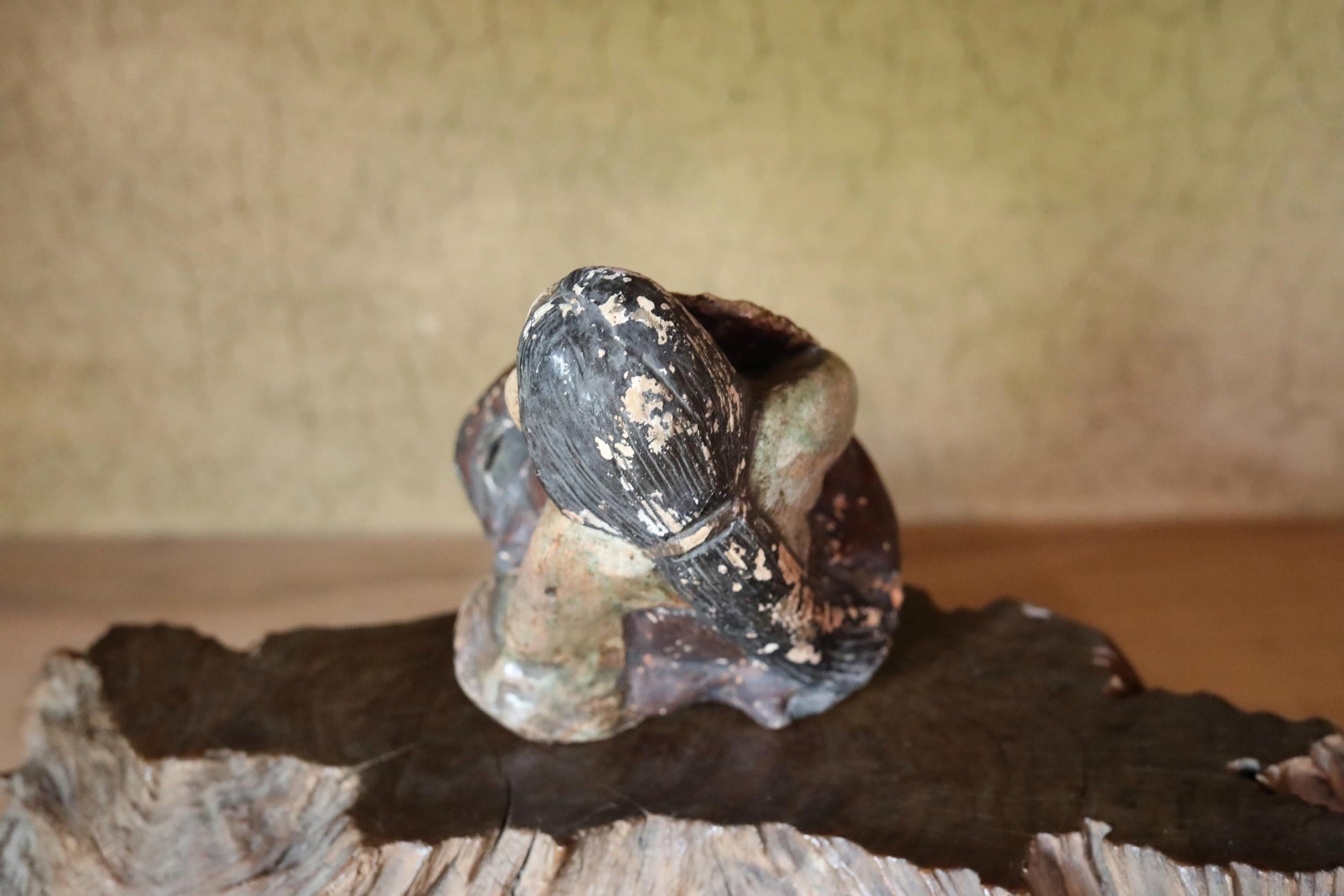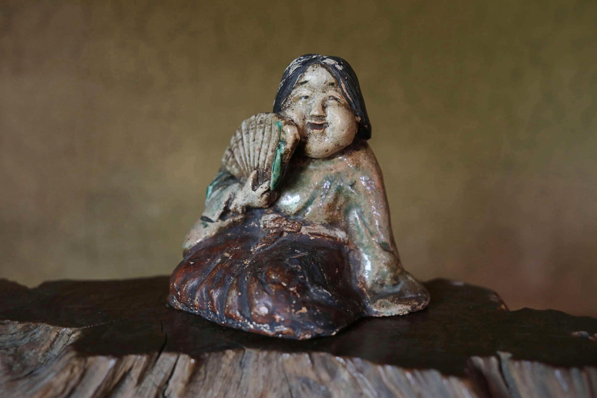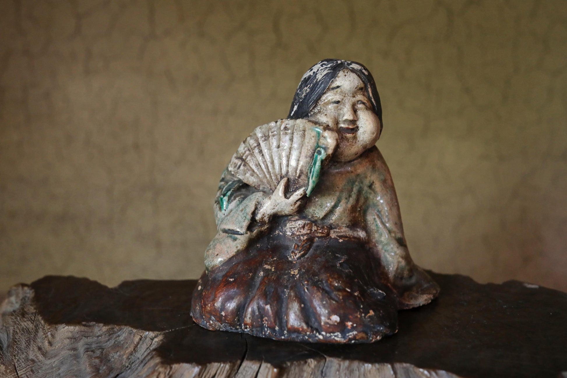 RARE!!Japanese antique ceramic doll お多福OTAFUKU OKAME ornament happy smile woman with folding fan Edo 1800s H5.1×5.3in/ H13×13.5cm