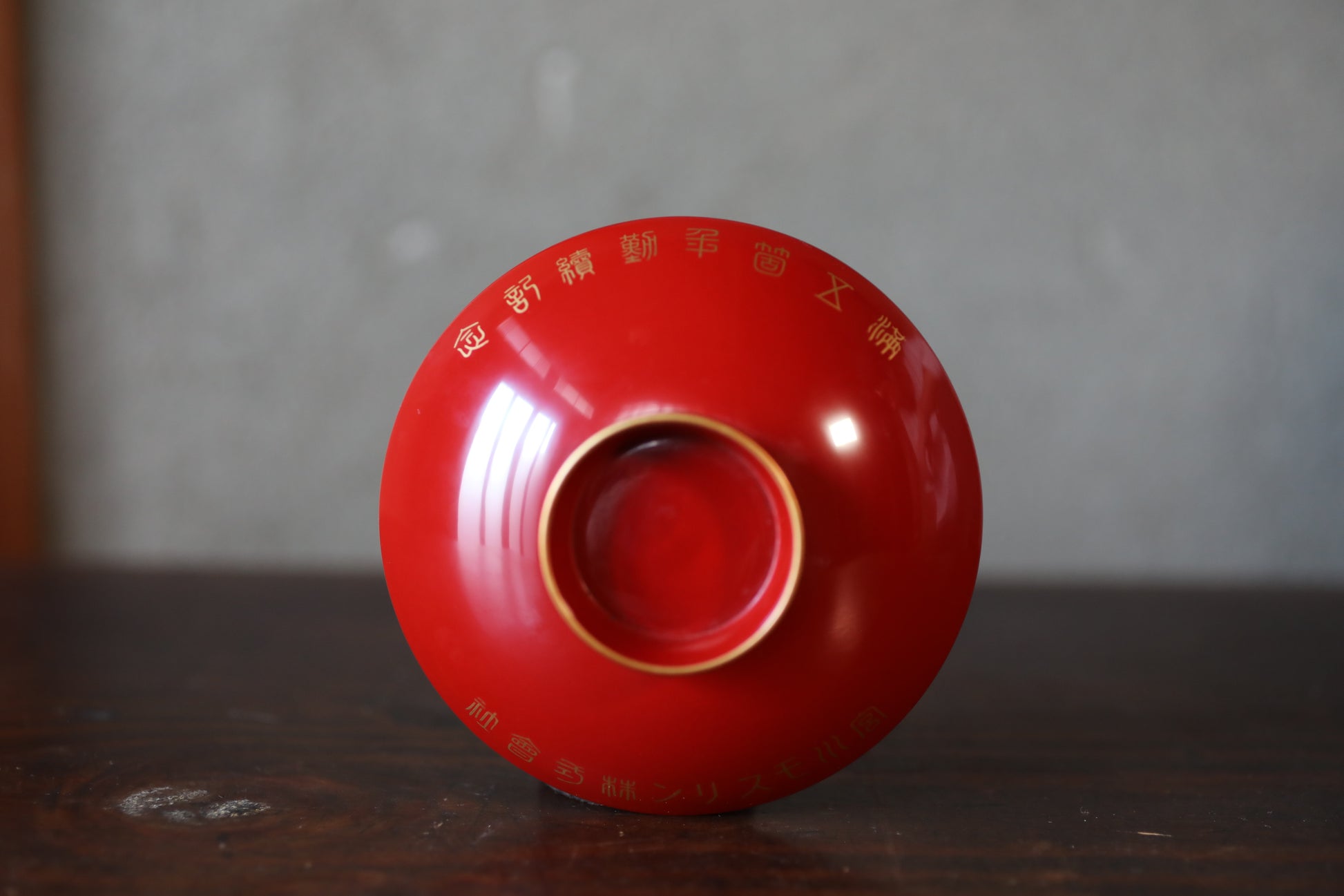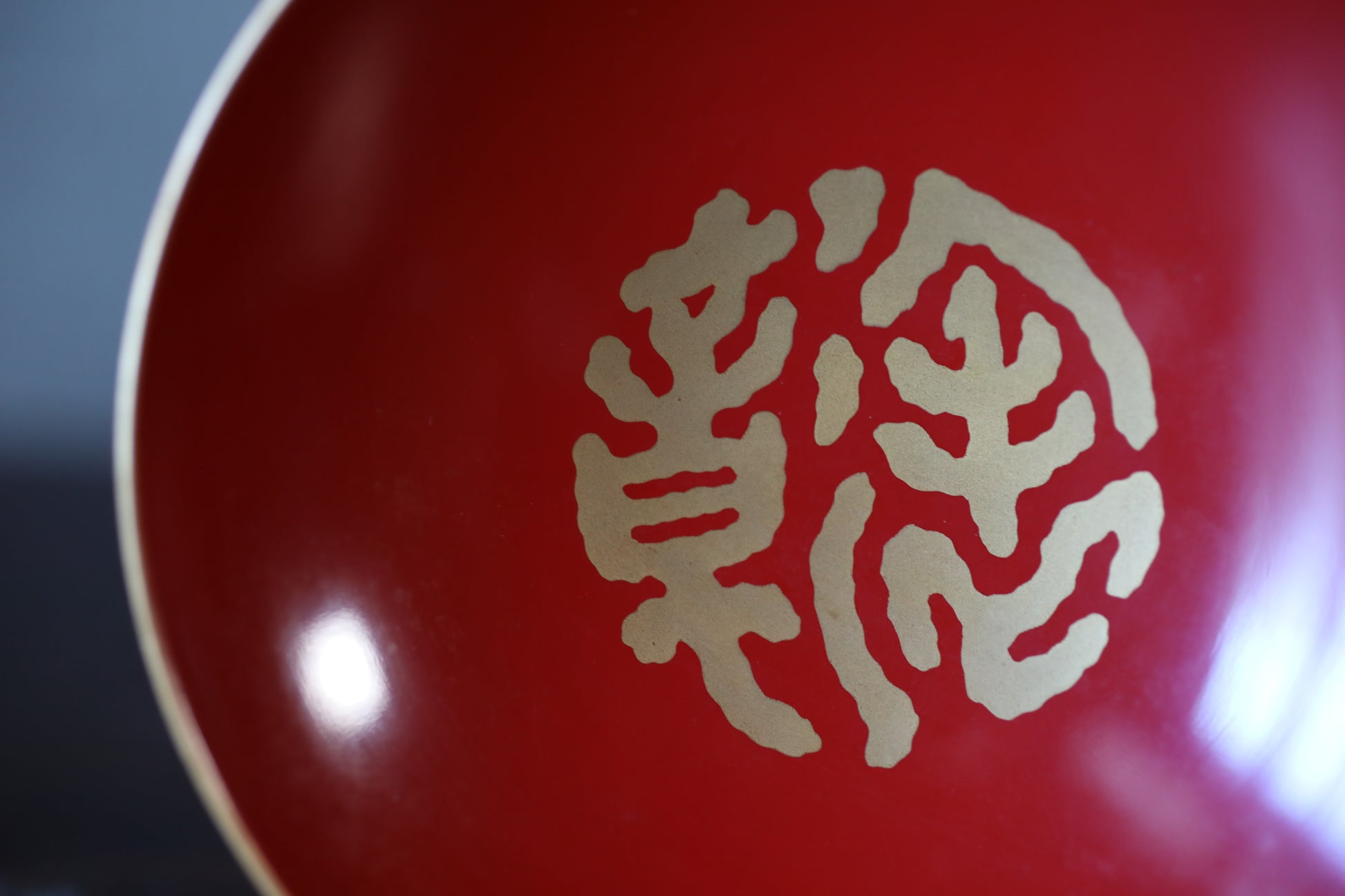 Red lacquer wooden sake cup with calligraphy and signature in gold, Japanese antique wooden urushi 1920s "SAKAZUKI" with box, 4.3in/10.8cm
