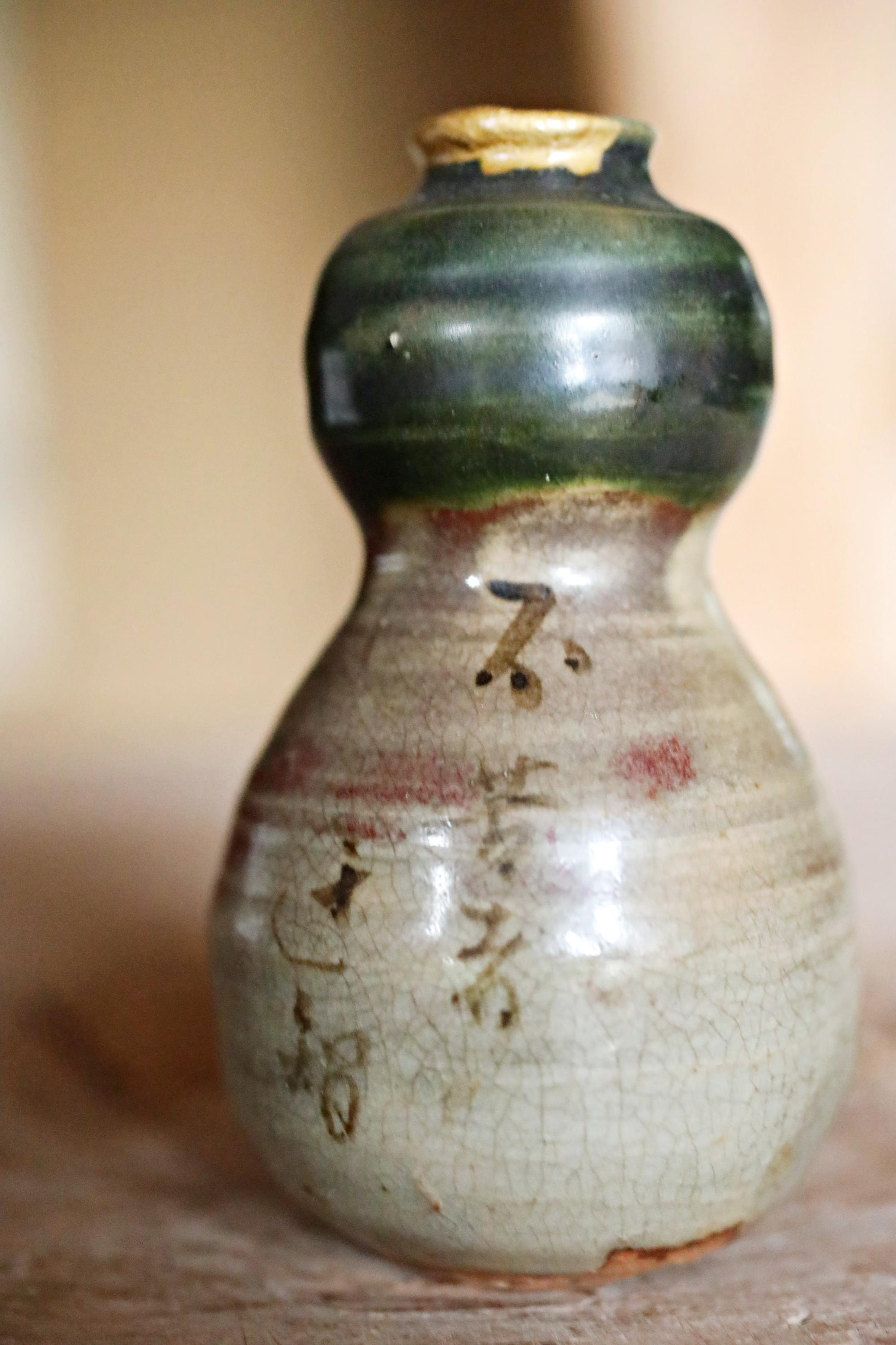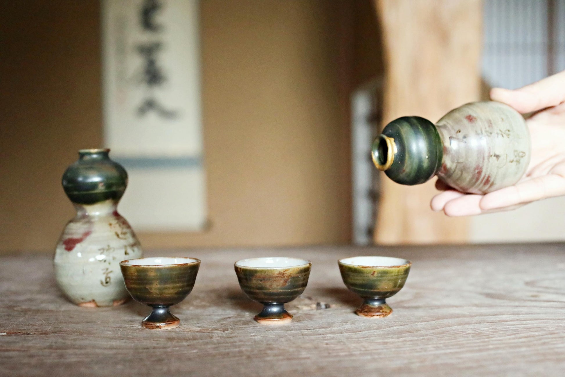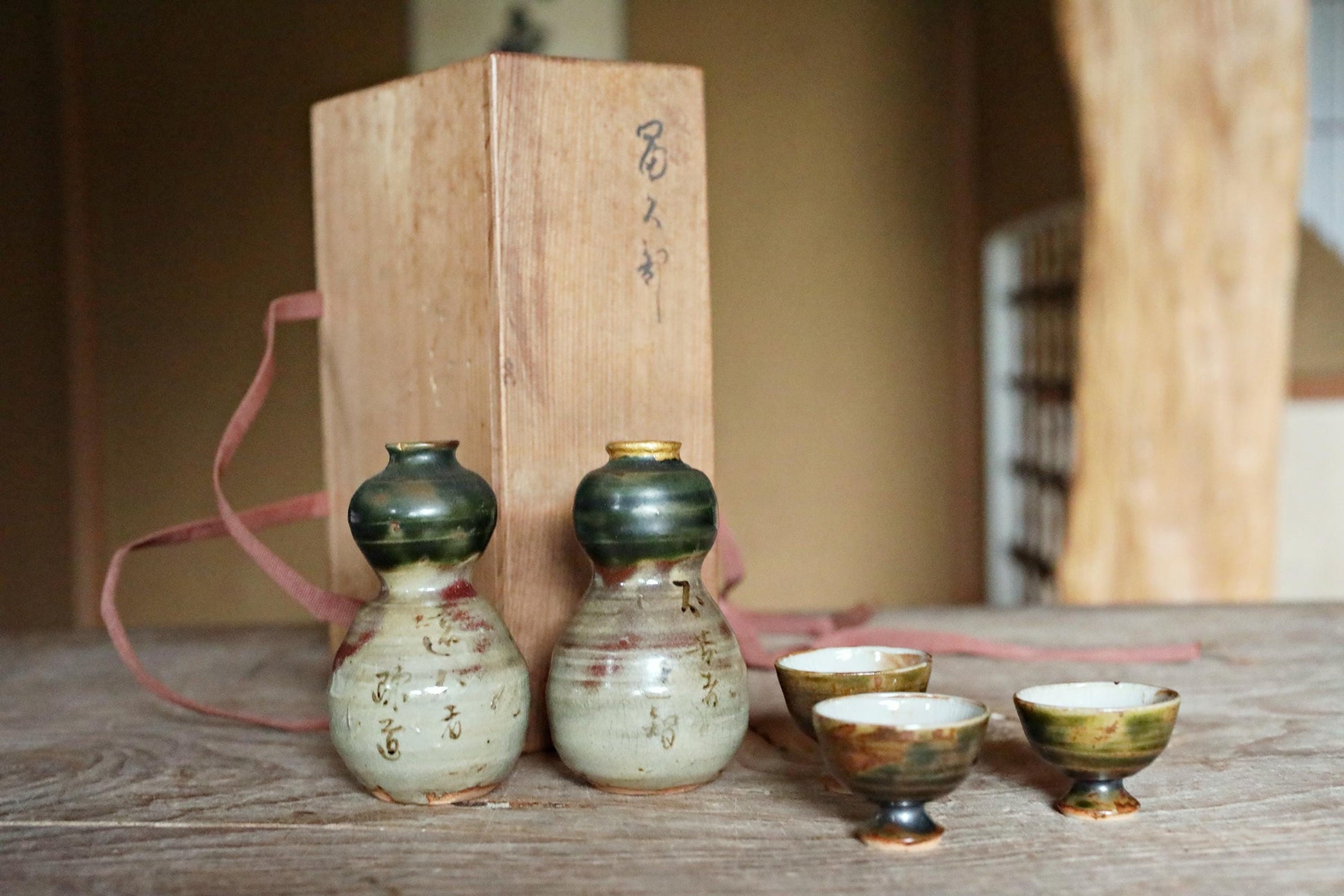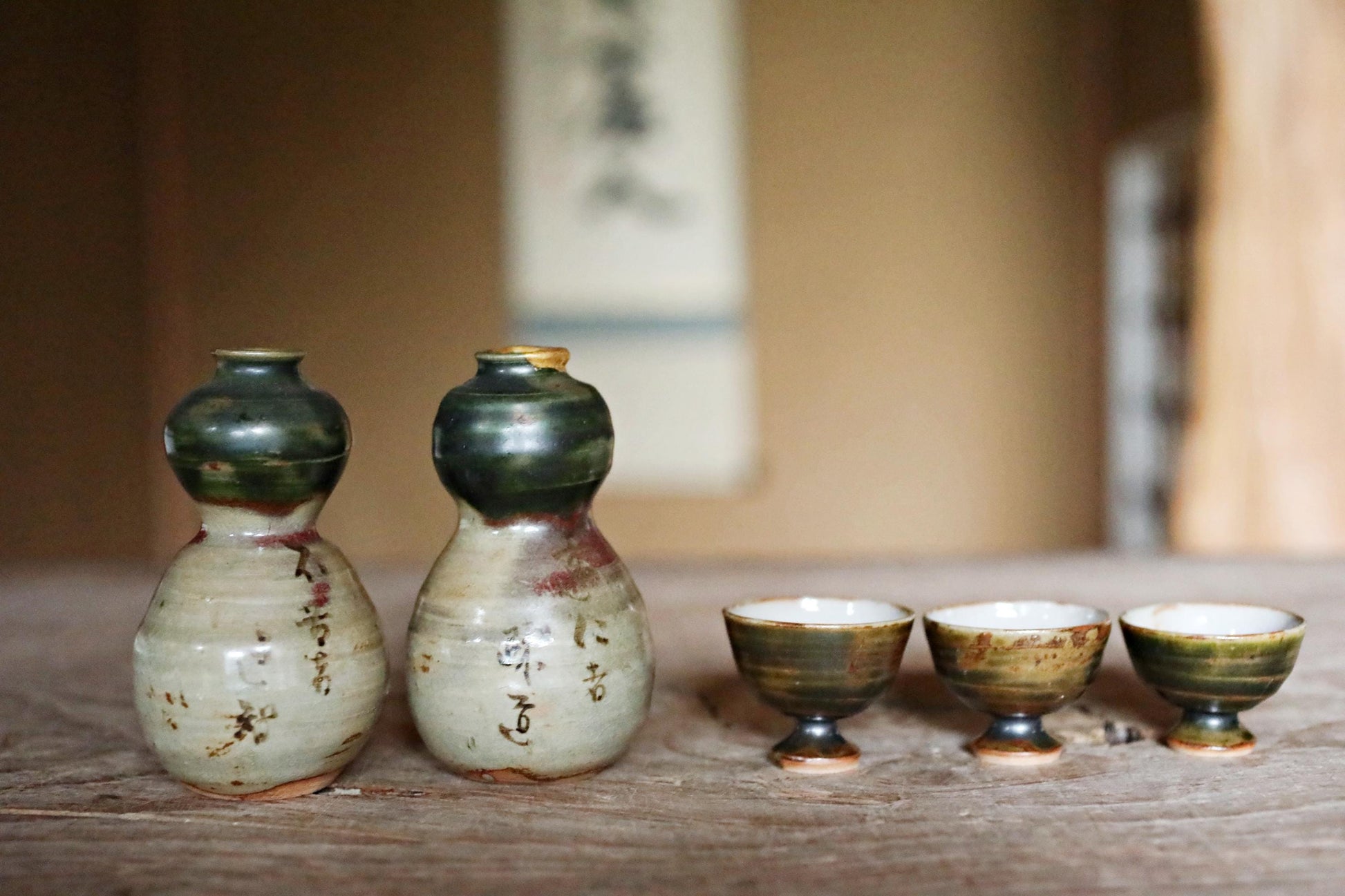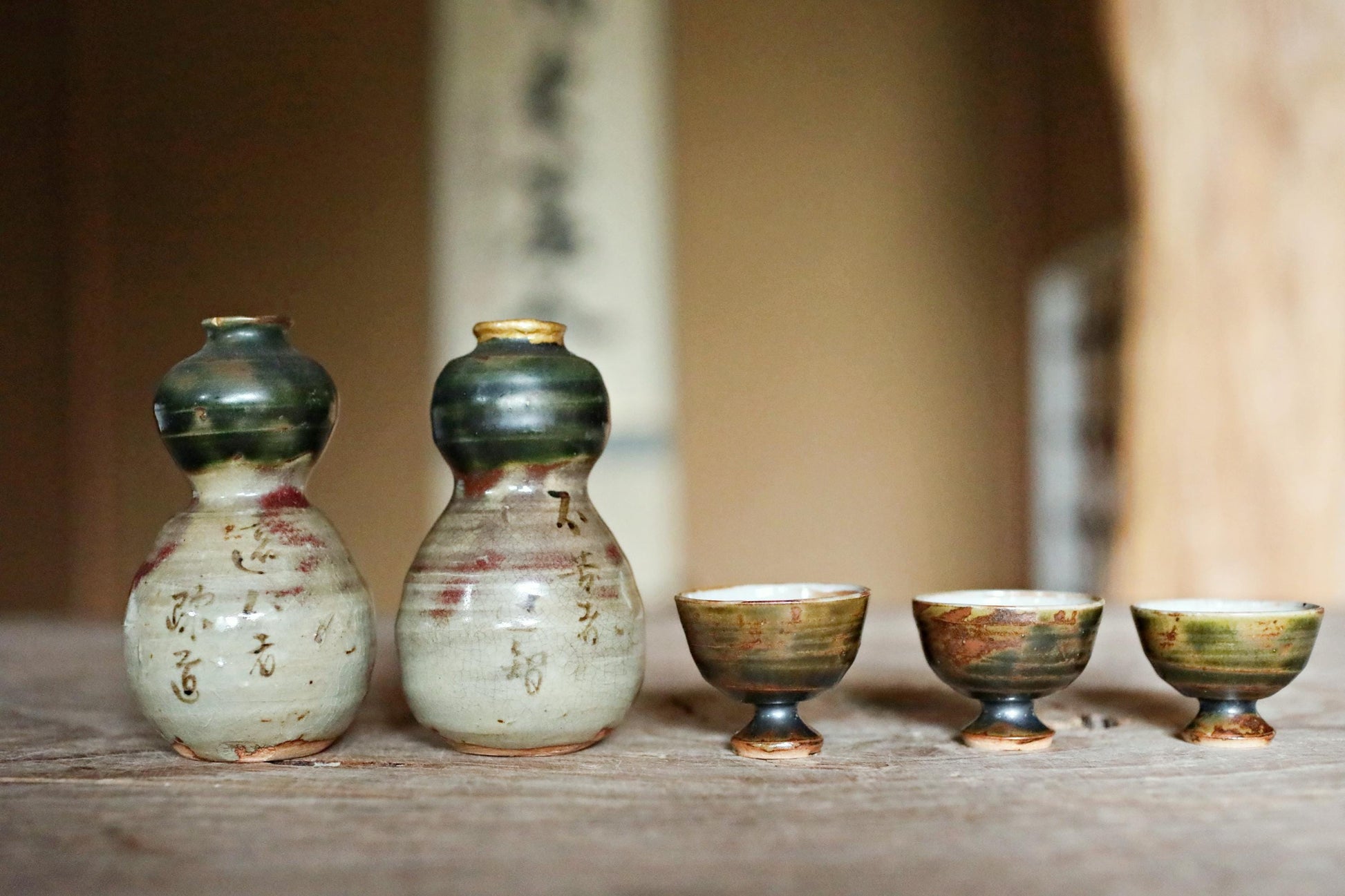 These are called 徳利 Tokkuri, which are decanter-like items used for drinking sake and cups with a raised base.Baked in Kishu kiln in Wakayama prefecture. Though Kishu kiln has its history from the 15th century, it ended once when the Edo shogunate collapsed with the birth of the new government. Because this area was directly controlled by the shogunate, the shogun's descendants worked hard to revive the culture and rebuilt the kiln. This bottle is modeled after gourd with Chinese old words, "遠仁者疎道" on one side and "不苦者疎智" on another. This means "A person without compassion for others is ignorant of human nature, and one who has never struggled lacks true wisdom." A mouth of a bottle is repaired by technique called by Kintsugi, repairing with lacquer and gold. An aged bottle looks better than ever with gold shining. Three cups are slightly different in size, large, medium and small. With a dedicated wooden box.
