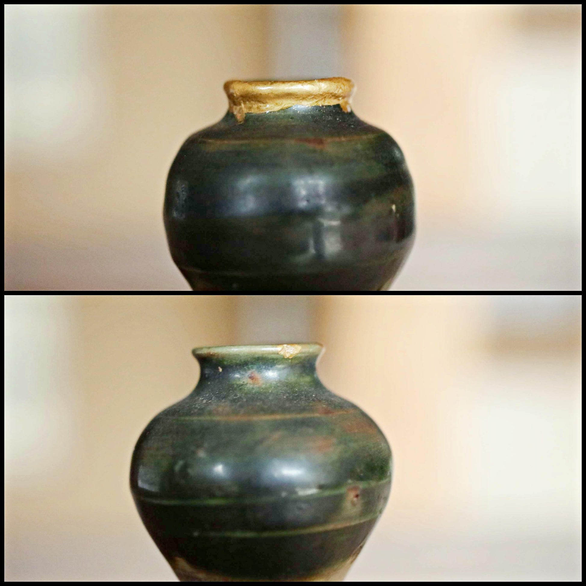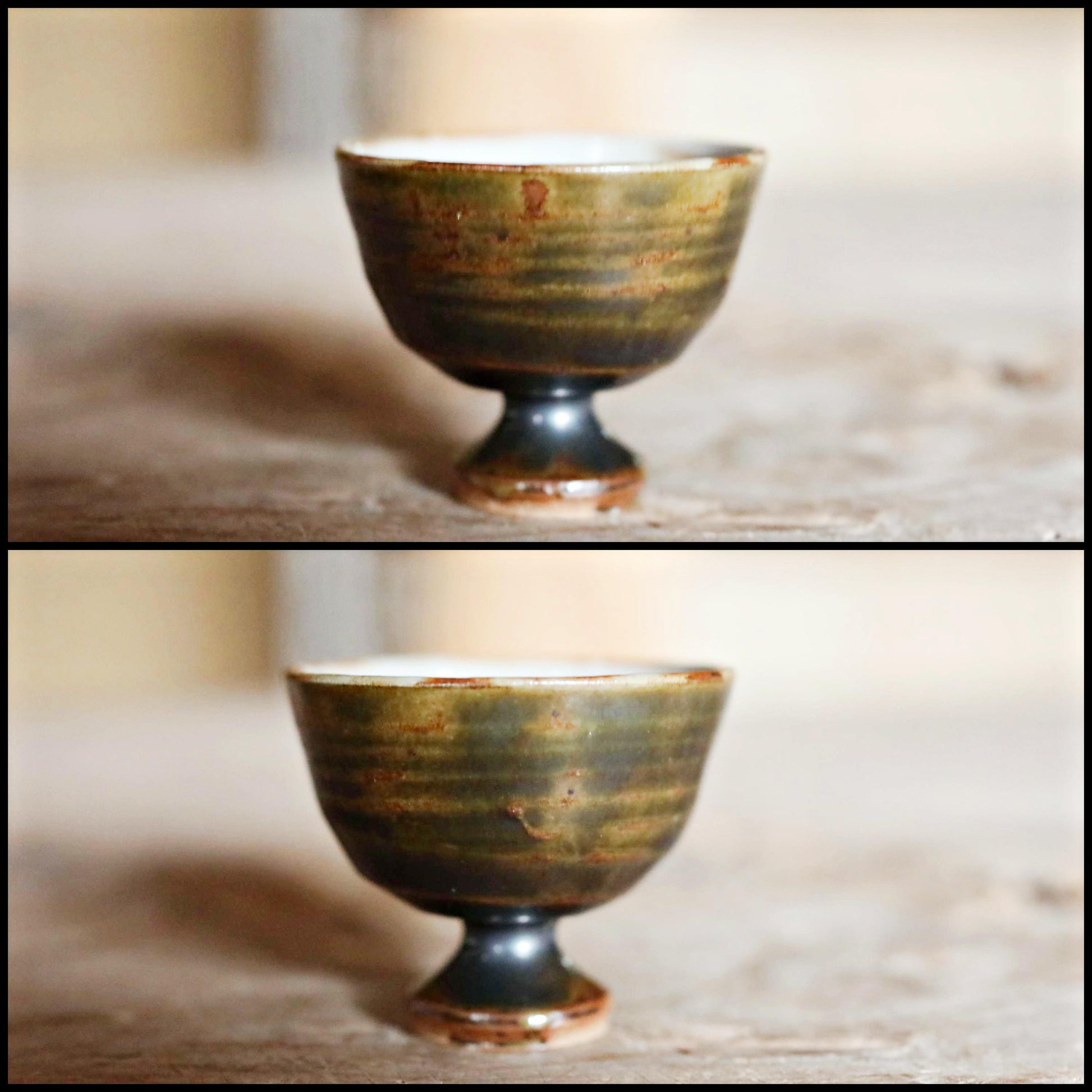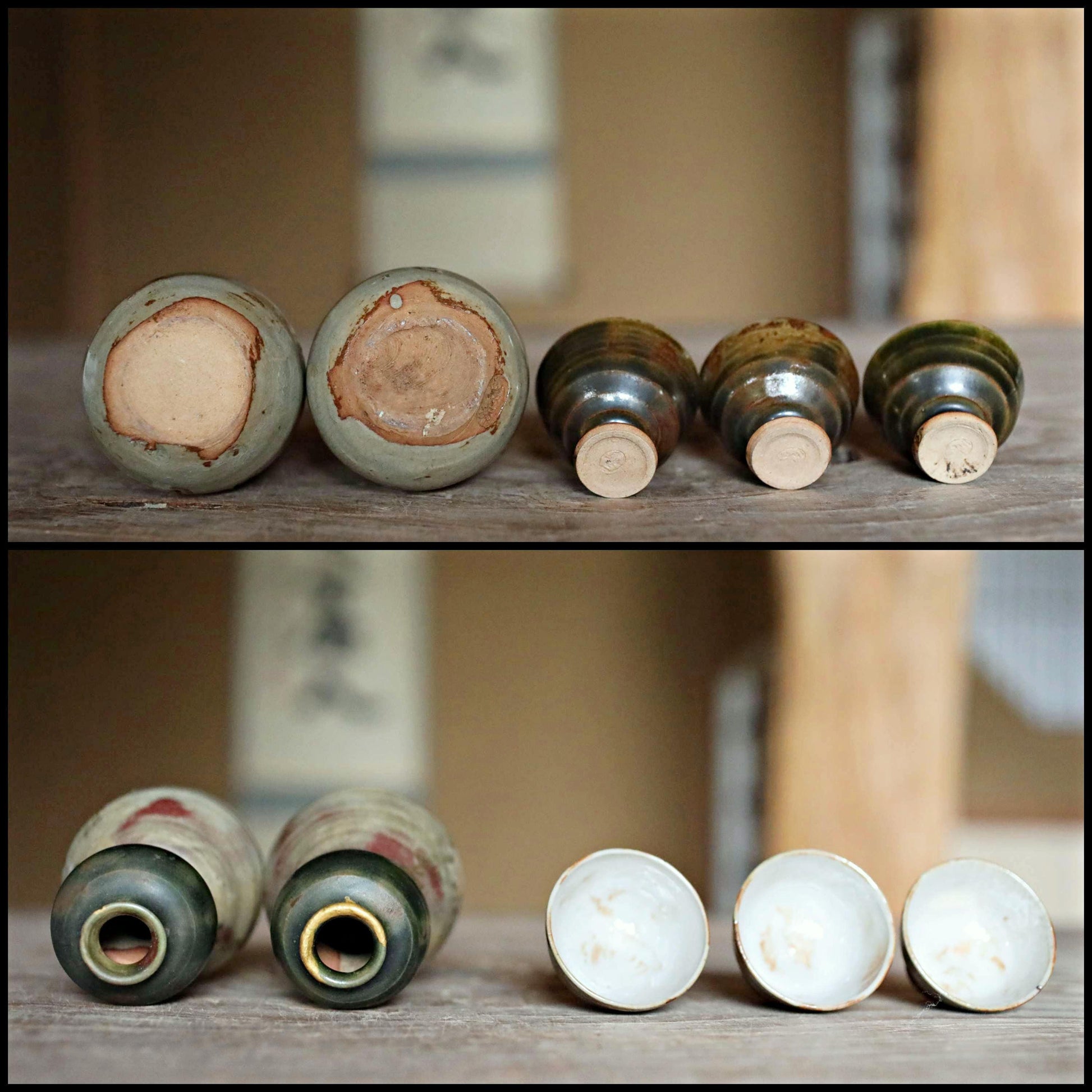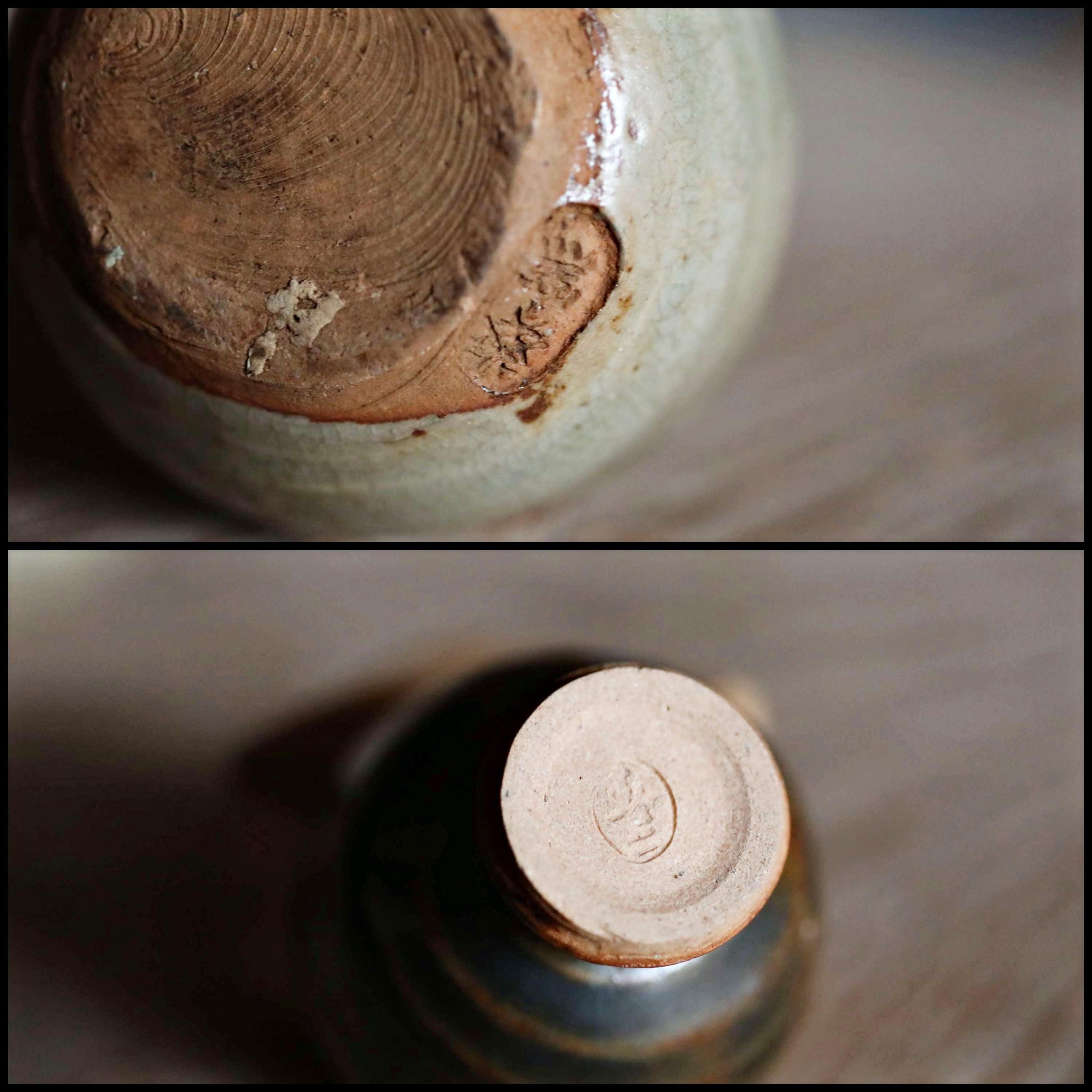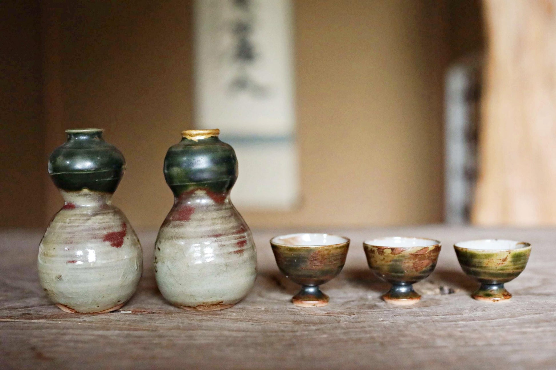 These are called 徳利 Tokkuri, which are decanter-like items used for drinking sake and cups with a raised base.Baked in Kishu kiln in Wakayama prefecture. Though Kishu kiln has its history from the 15th century, it ended once when the Edo shogunate collapsed with the birth of the new government. Because this area was directly controlled by the shogunate, the shogun's descendants worked hard to revive the culture and rebuilt the kiln. This bottle is modeled after gourd with Chinese old words, "遠仁者疎道" on one side and "不苦者疎智" on another. This means "A person without compassion for others is ignorant of human nature, and one who has never struggled lacks true wisdom." A mouth of a bottle is repaired by technique called by Kintsugi, repairing with lacquer and gold. An aged bottle looks better than ever with gold shining. Three cups are slightly different in size, large, medium and small. With a dedicated wooden box.