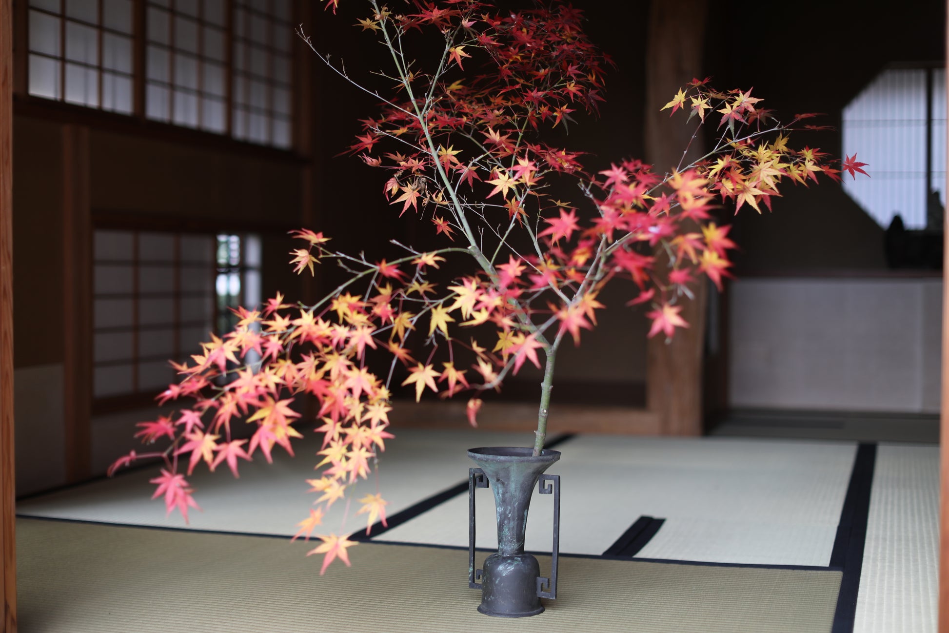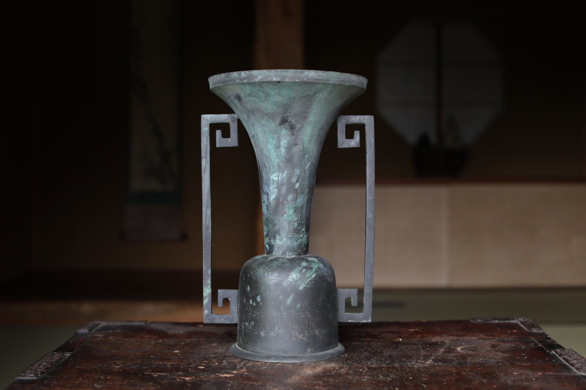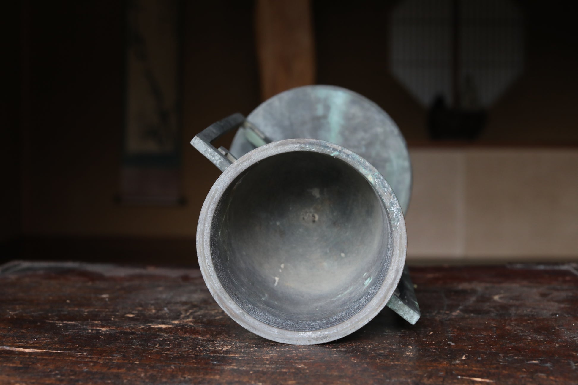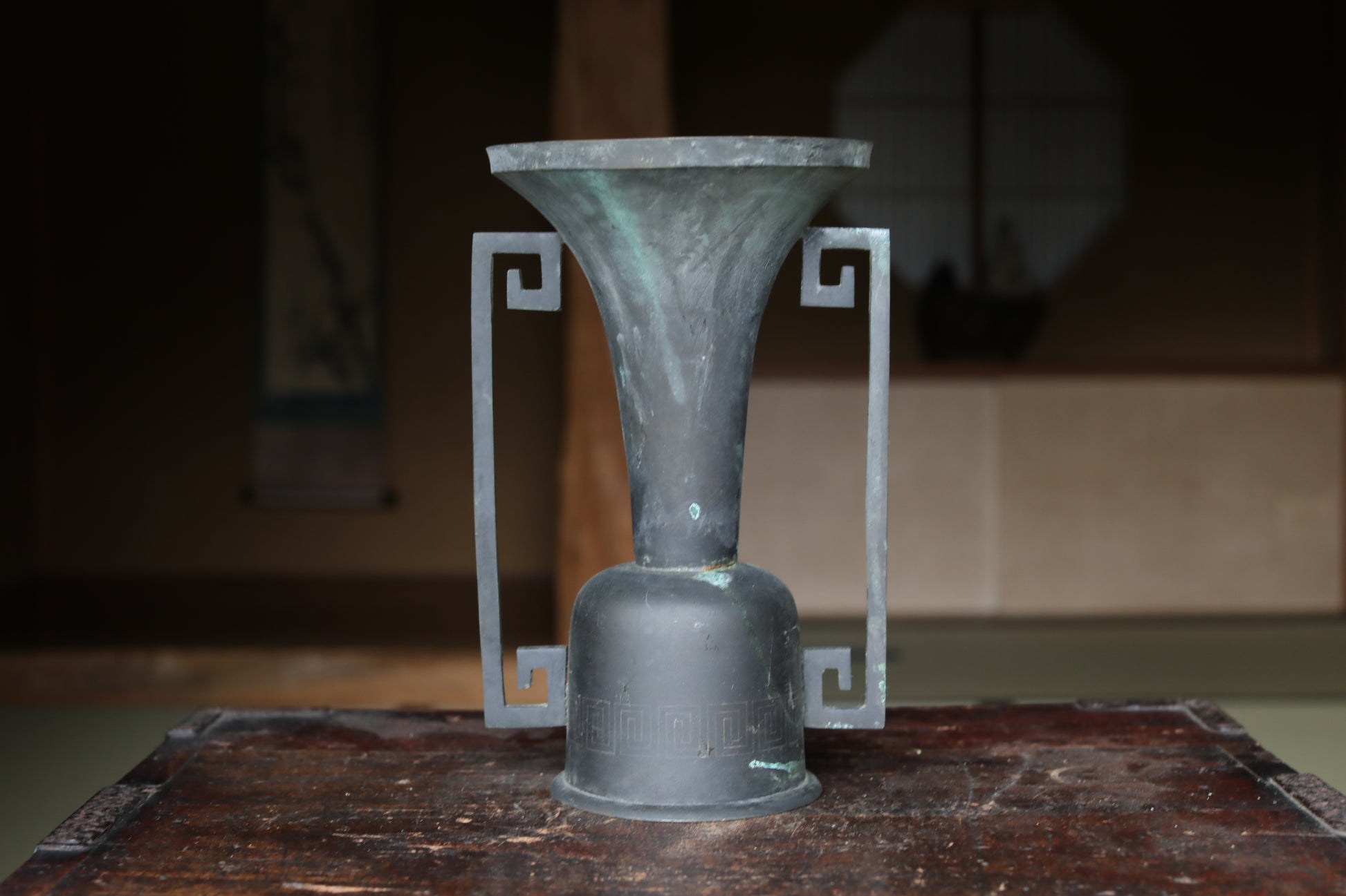 While modern floral arrangements have been designed to mimic this shape, this piece is made of very old bronze, giving it a wonderful atmosphere. Old bronze, which has darkened with age, is called “古銅 KODOU old copper” and is popular in Japan.