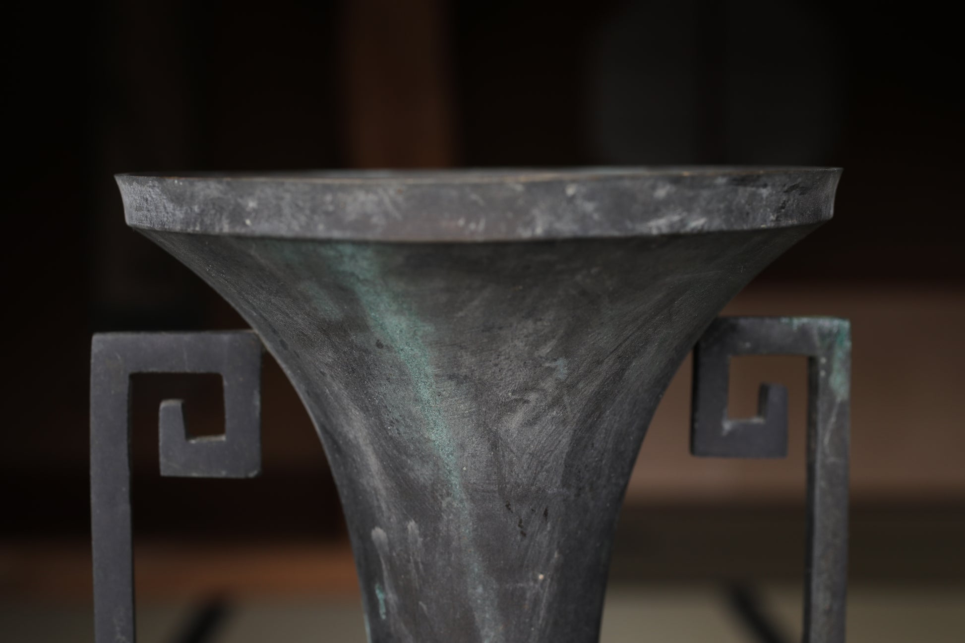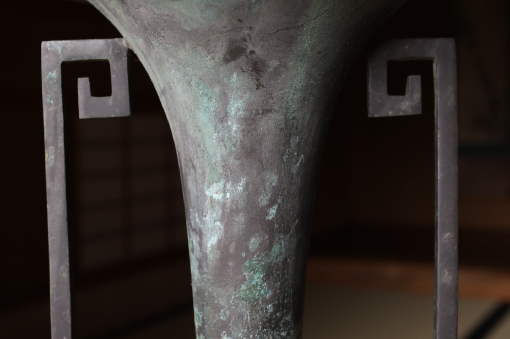 The color change of the bronze such as patina creates a cool atmosphere over time. The distinctive square swirl ears are said to have a protective meaning, originating from the thunder family crest.